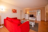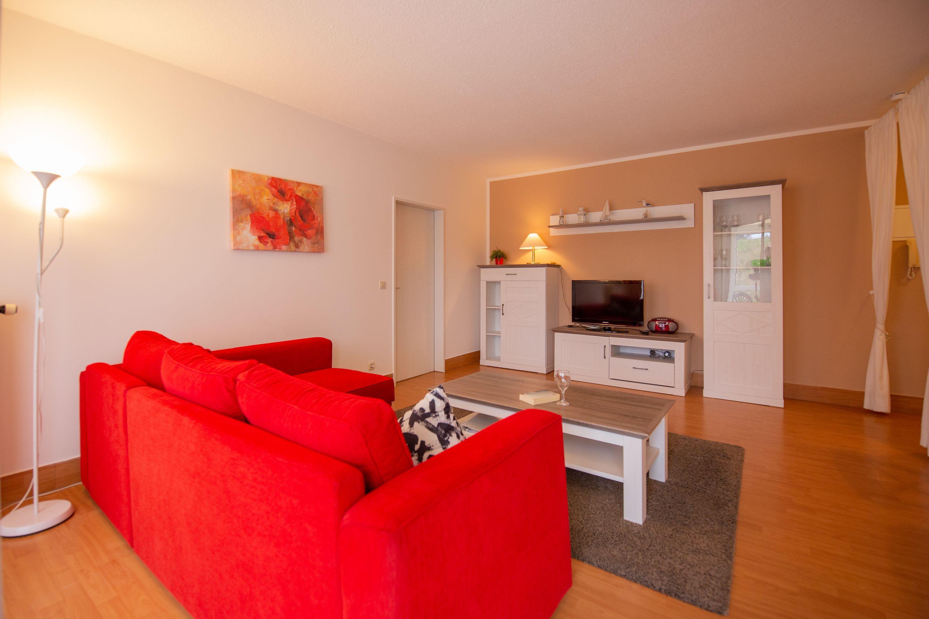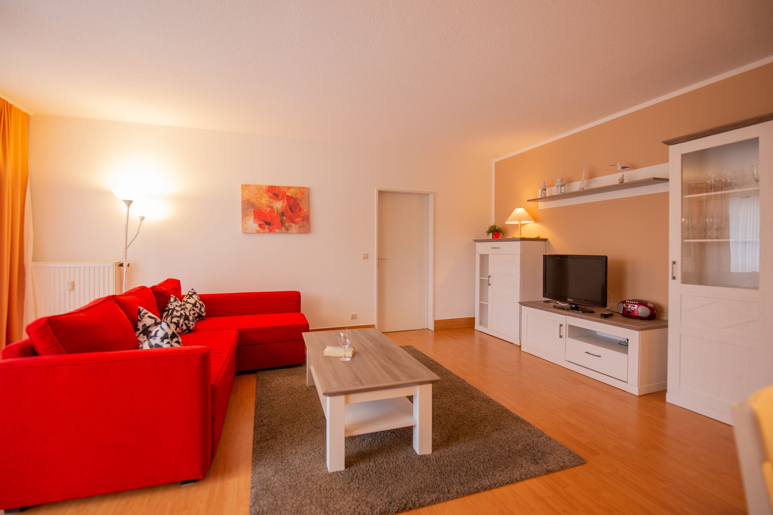 In dem stilvoll eingerichteten Wohnbereich der Ferienwohnung Sanddorn erwartet Sie neben einer bequemen Couchgarnitur (Aufbettung für 2 Personen möglich) auch ein Flachbild-TV und die offene Küchenzeile. Ein kleiner Essbereich für 4 Personen schießt sich dort an.