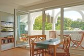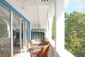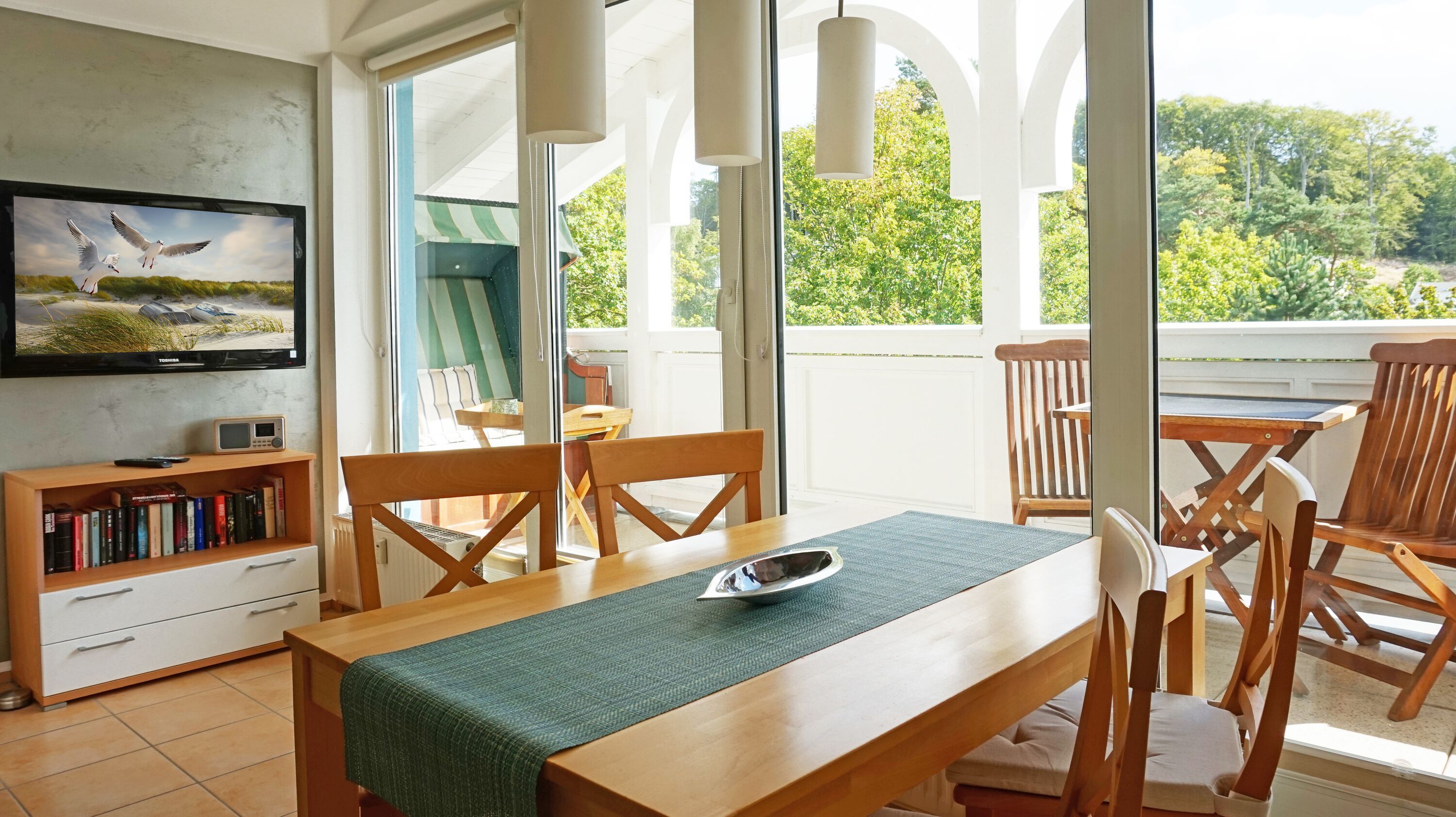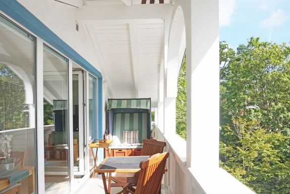 Von hier aus erreichen Sie auch den großen, überdachten Balkon. Komfortable Gartenmöbel mit entsprechenden Auflagen und ein eigener Strandkorb stehen Ihnen beispielsweise für ein sonniges Frühstück zur Verfügung.