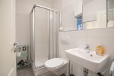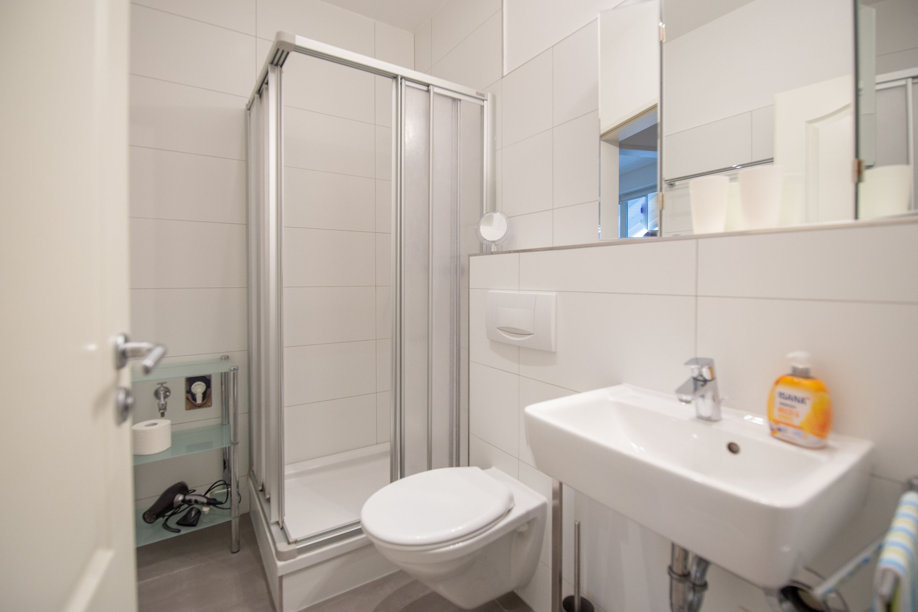 Das hell erleuchtete Badezimmer verfügt über eine Dusche und ein WC.