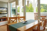 Im hellen Wohnbereich begrüßt sie die bequeme Couchgarnitur, welche ebenso für eine Aufbettung für eine weitere Person genutzt werden kann. Der Flachbild-TV, die große Glasfront und die indirekte, warme Beleuchtung runden das gemütliche Ambiente ab. Ein kleiner Essbereich und die offene Küche schließen sich türlos an den Wohnbereich an.