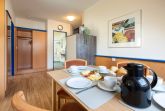 Die Küchenzeile ist mit einem Kühlschrank, einem Ceranfeld mit Backofen, einer Spülmaschine und einer Mikrowelle ausgestattet. Ebenso finden sich hier alle nötigen Küchenkleingeräte (Wasserkocher, Kaffeemaschine, Toaster..).