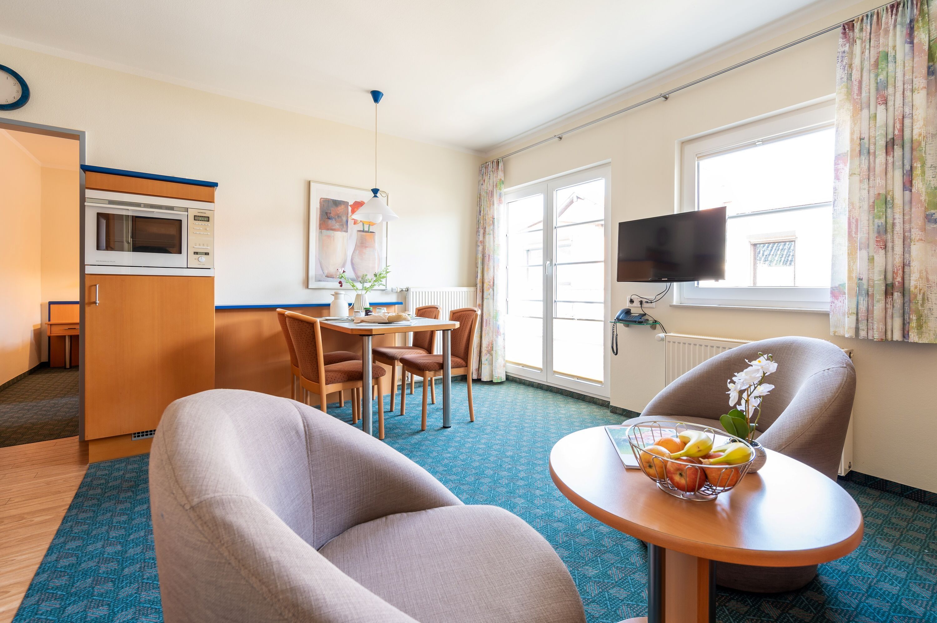 Das helle Wohnzimmer verfügt über eine Couchgarnitur, einen TV und einen kostenfreien WLAN-Zugang. Zudem erreicht man von hier aus den sonnigen Balkon inkl. Balkonmöbel.
