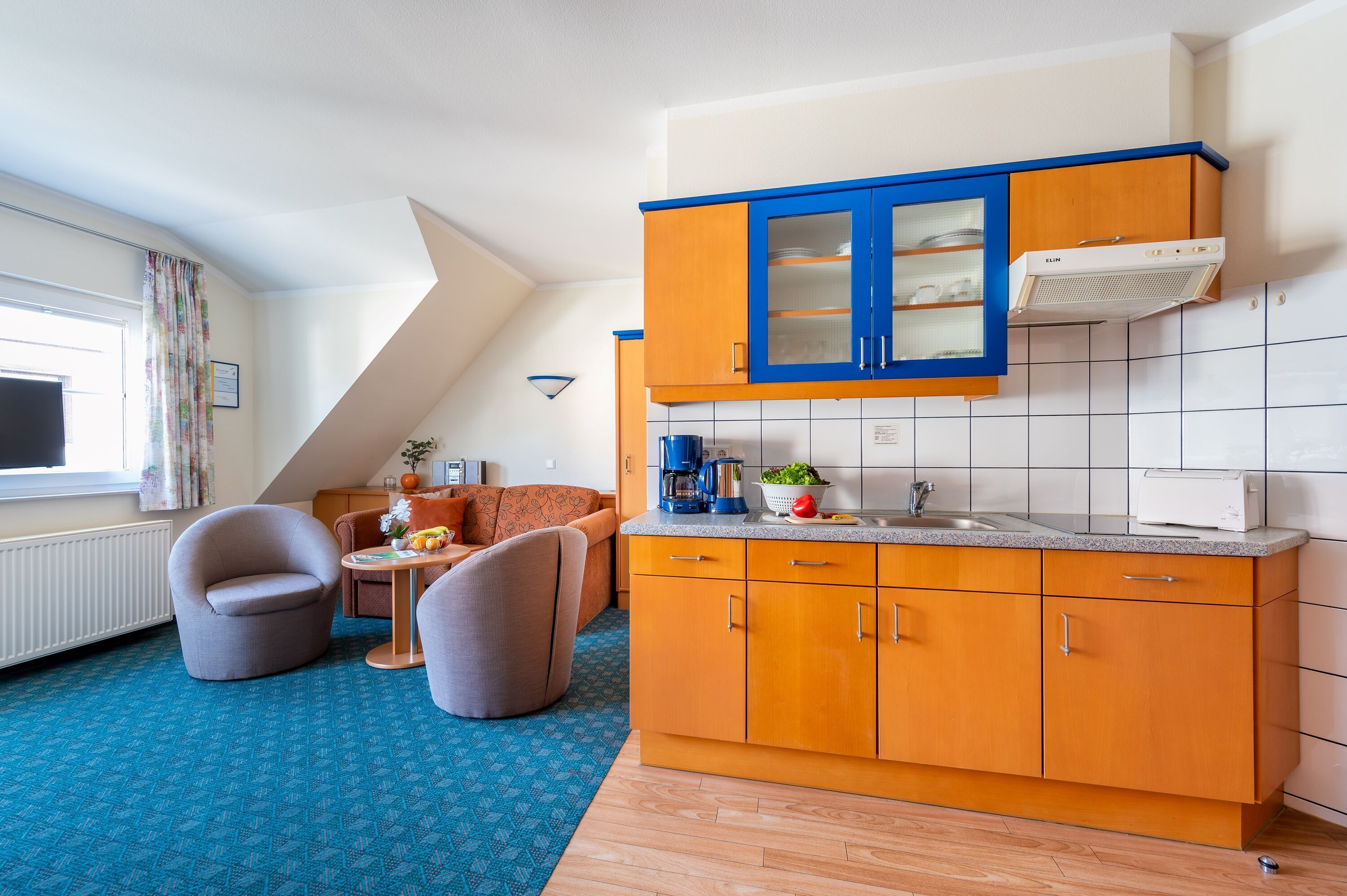 Die Küchenzeile ist mit einem Kühlschrank, einem Ceranfeld und einem Backofen/Mikrowelle ausgestattet. Ebenso finden sich hier alle nötigen Küchenkleingeräte (Wasserkocher, Kaffeemaschine, Toaster..).