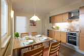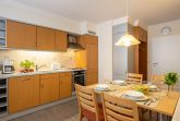 Die Küchenzeile ist mit einem Kühlschrank, einem Plattenherd mit Backofen und einer Spülmaschine ausgestattet. Ebenso finden sich hier alle nötigen Küchenkleingeräte (Wasserkocher, Kaffeemaschine, Toaster..).