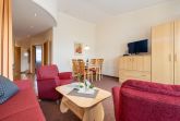 Das helle Wohnzimmer verfügt über eine Couchgarnitur, welche ebenso eine Aufbettung für 2 weitere Personen darstellt. Neben einem TV und einem kostenfreien WLAN-Zugang erreichen Sie von hier aus den sonnigen Balkon inkl. Balkonmöbel.