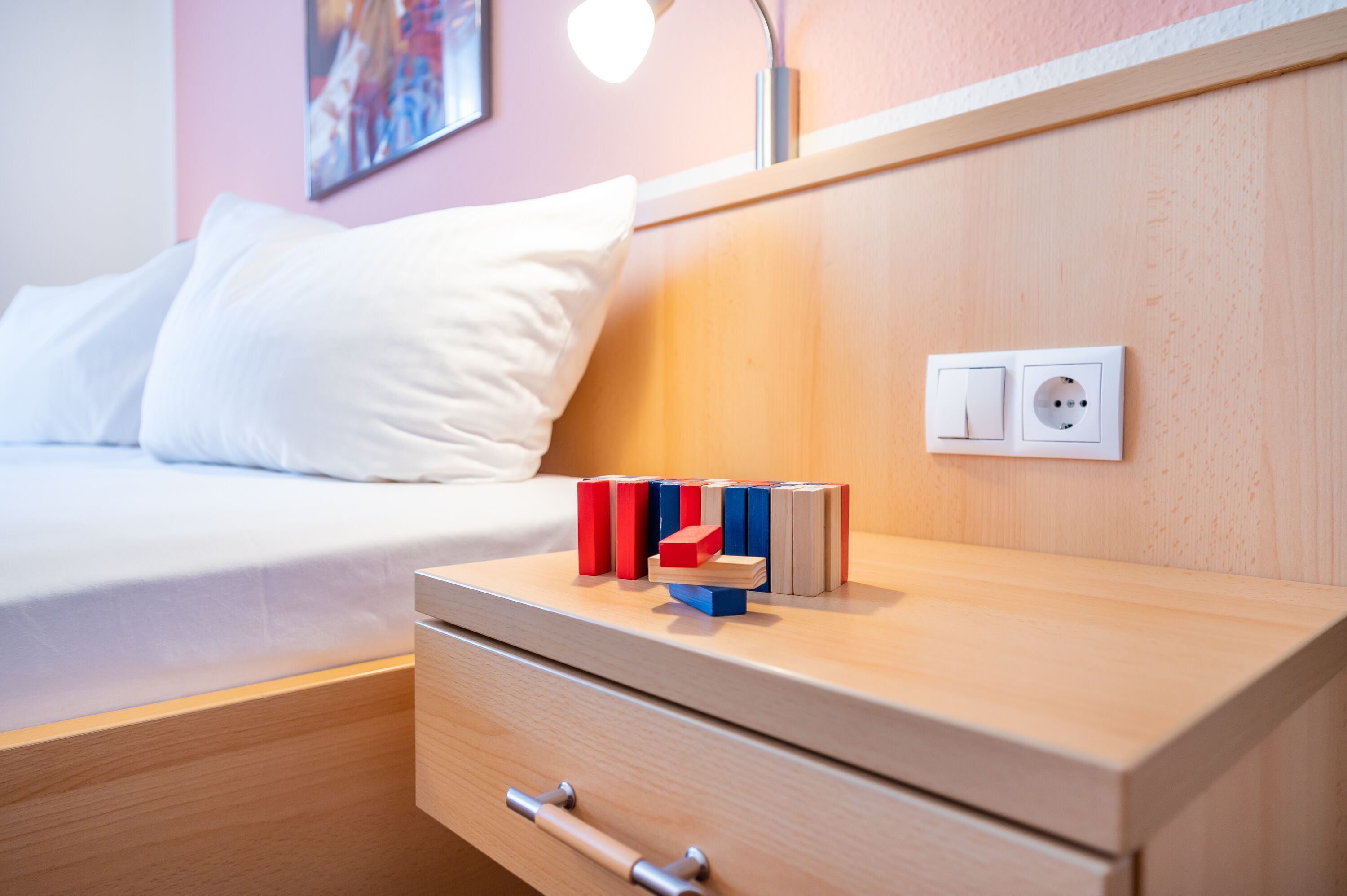 Im Schlafbereich steht ein komfortables Doppelbett und ein geräumiger Kleiderschrank. Im hell erleuchteten Badezimmer befindet sich eine bodengleiche Dusche und ein WC.