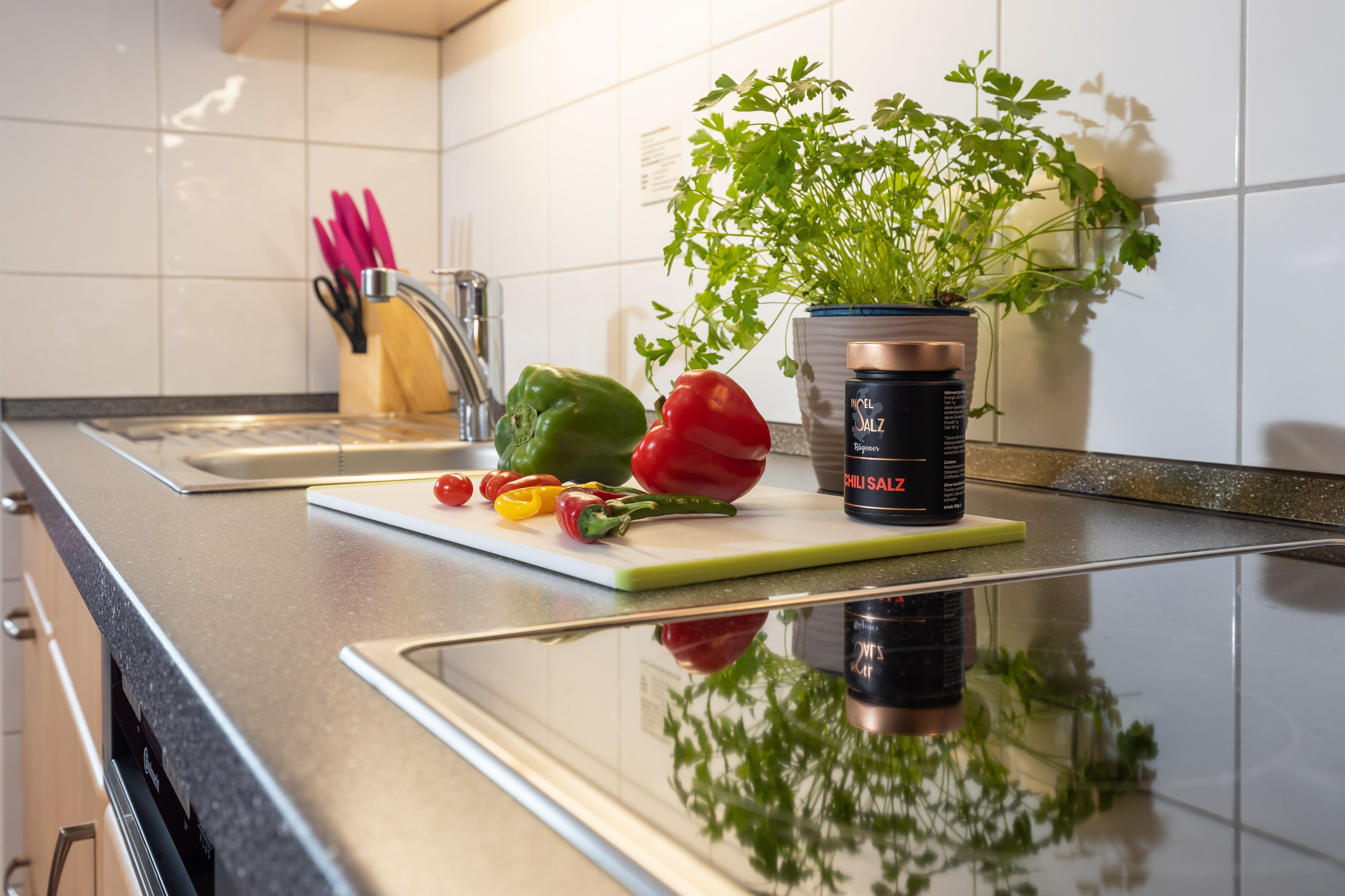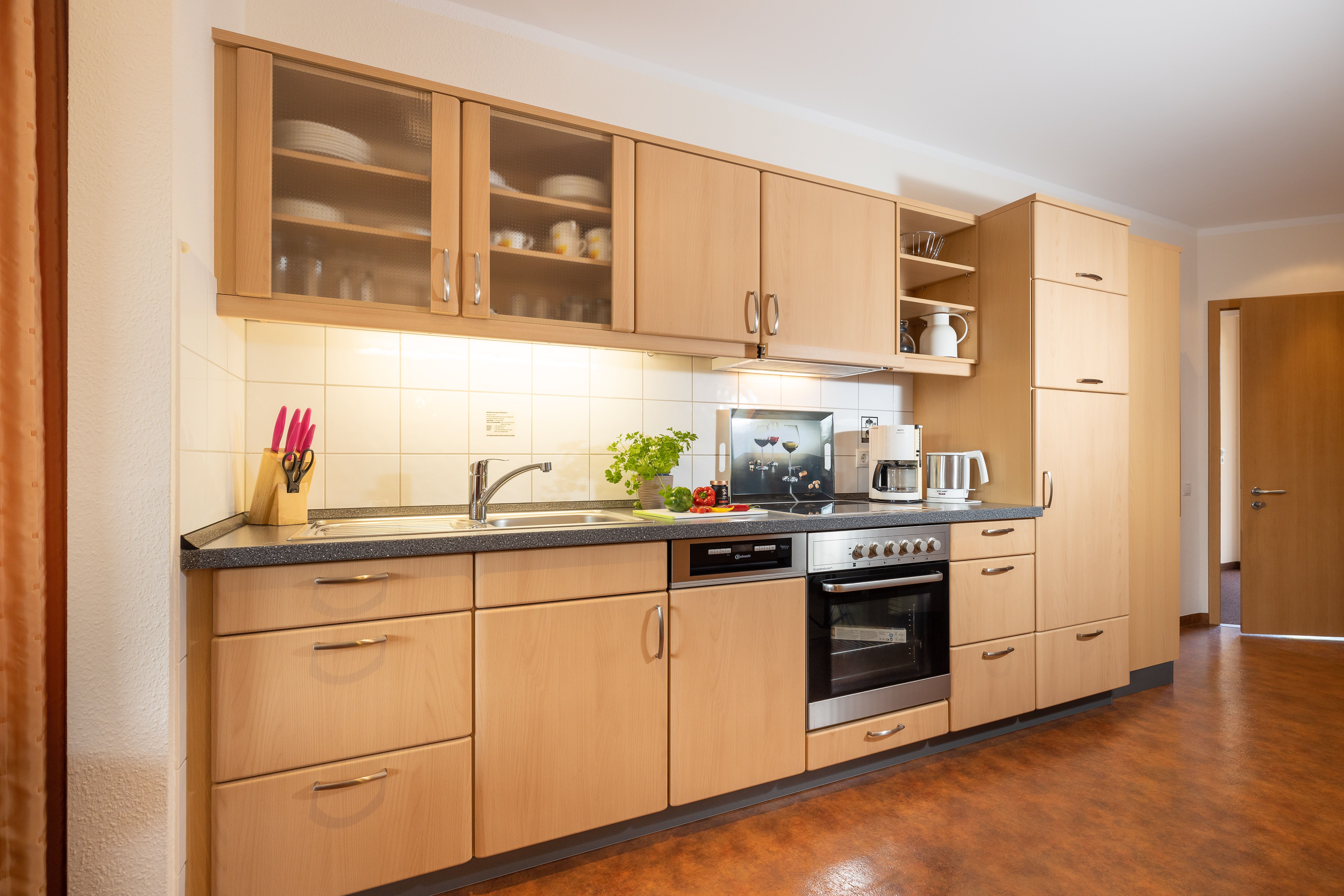 Die Küchenzeile ist mit einem Kühlschrank, einem Ceranfeld mit Backofen, einer Spülmaschine und einer Mikrowelle ausgestattet. Ebenso finden sich hier alle nötigen Küchenkleingeräte (Wasserkocher, Kaffeemaschine, Toaster..).