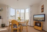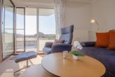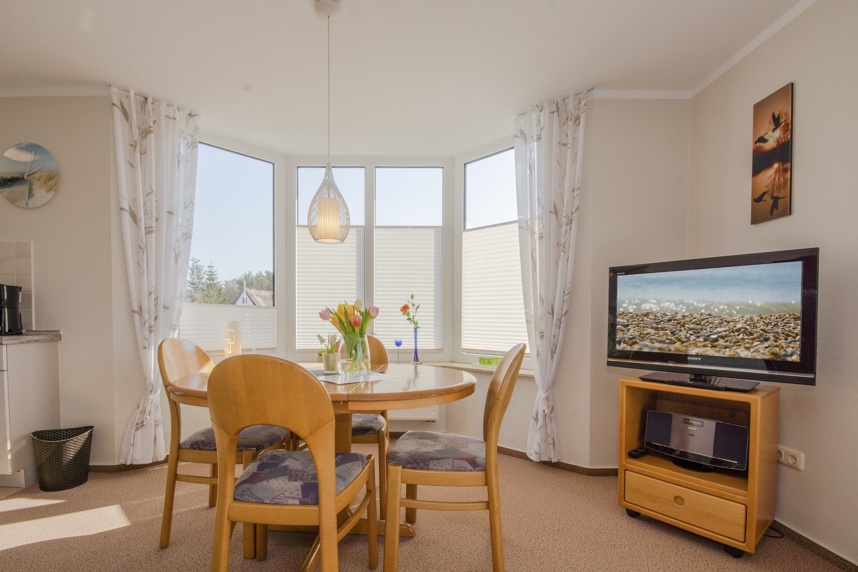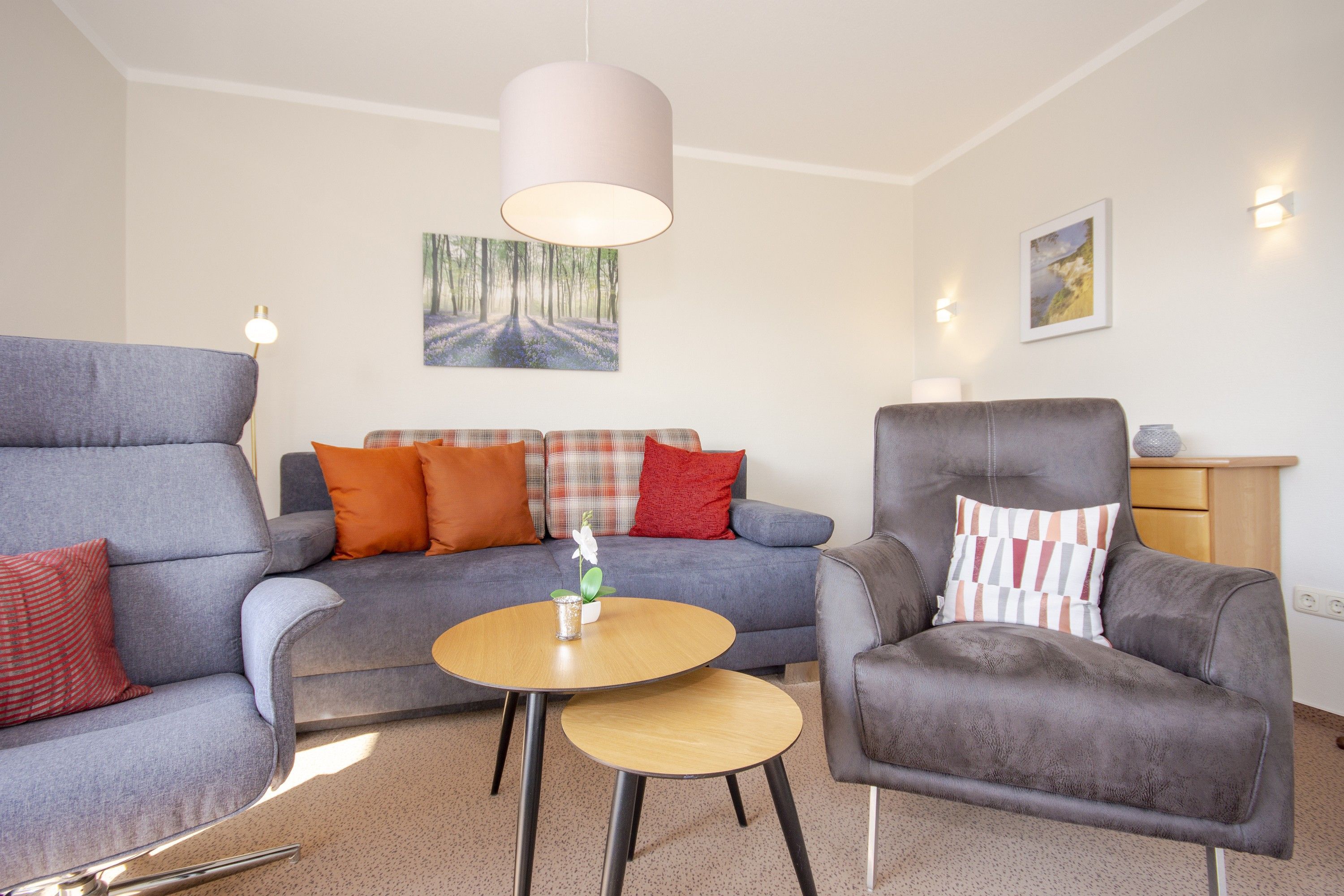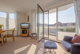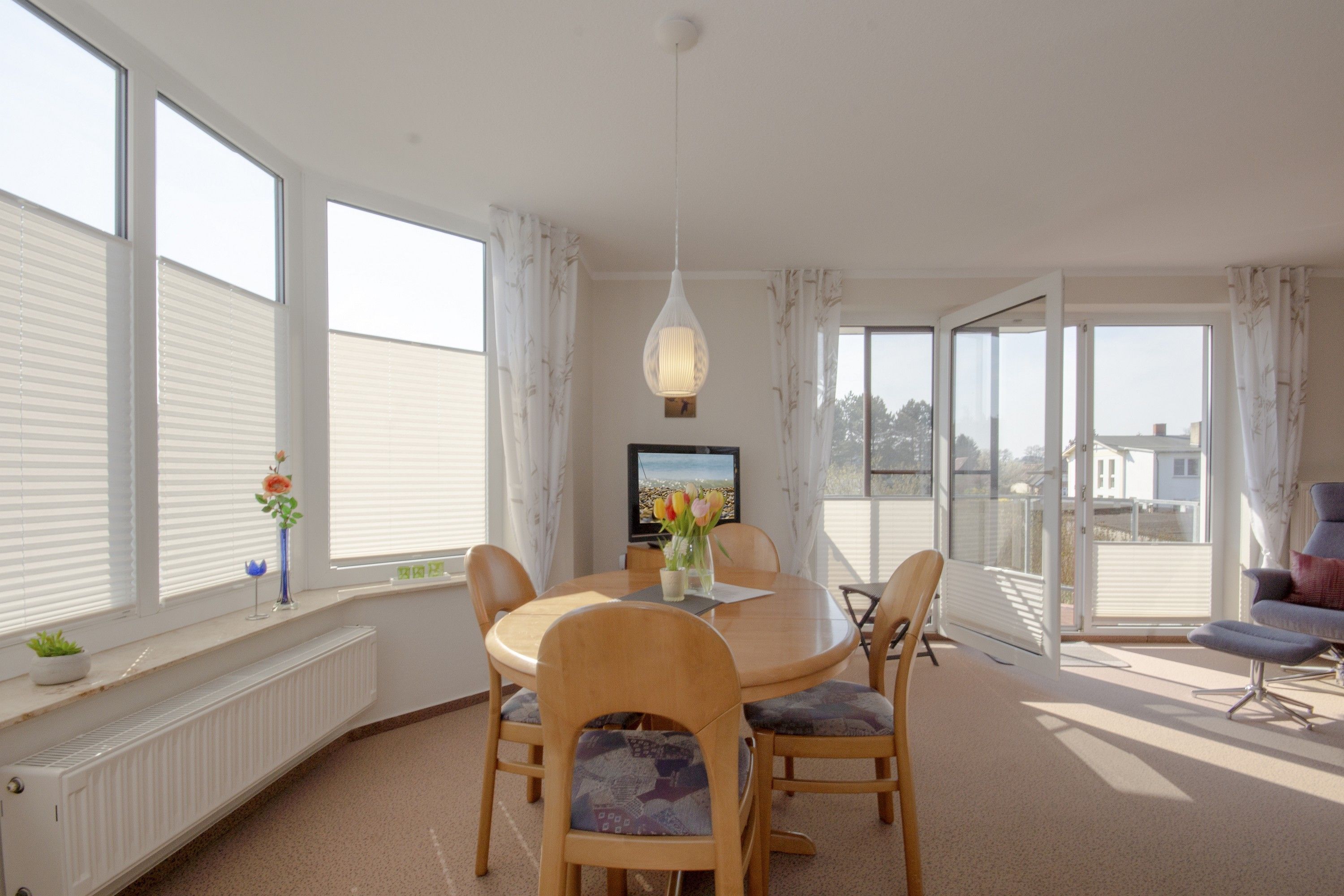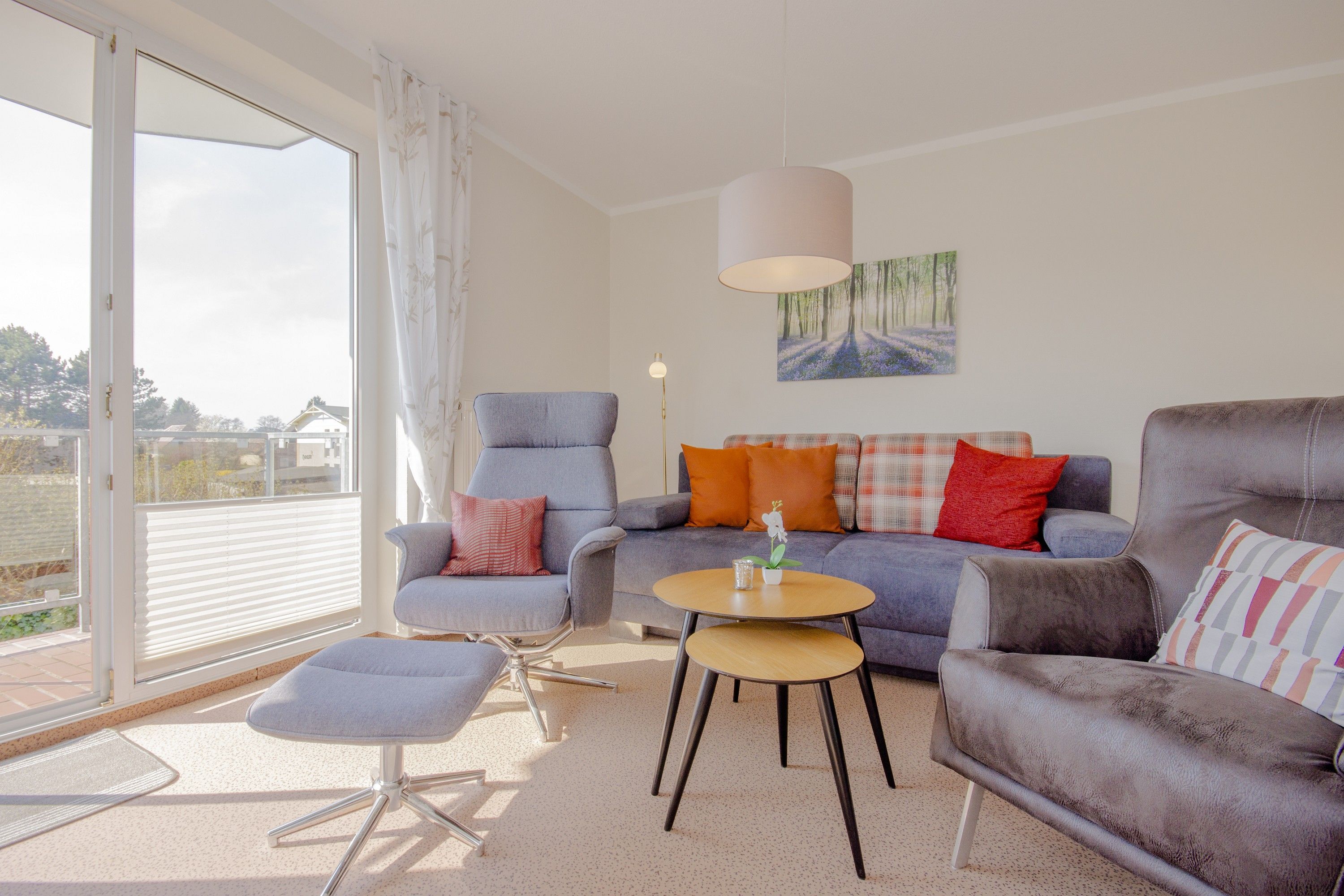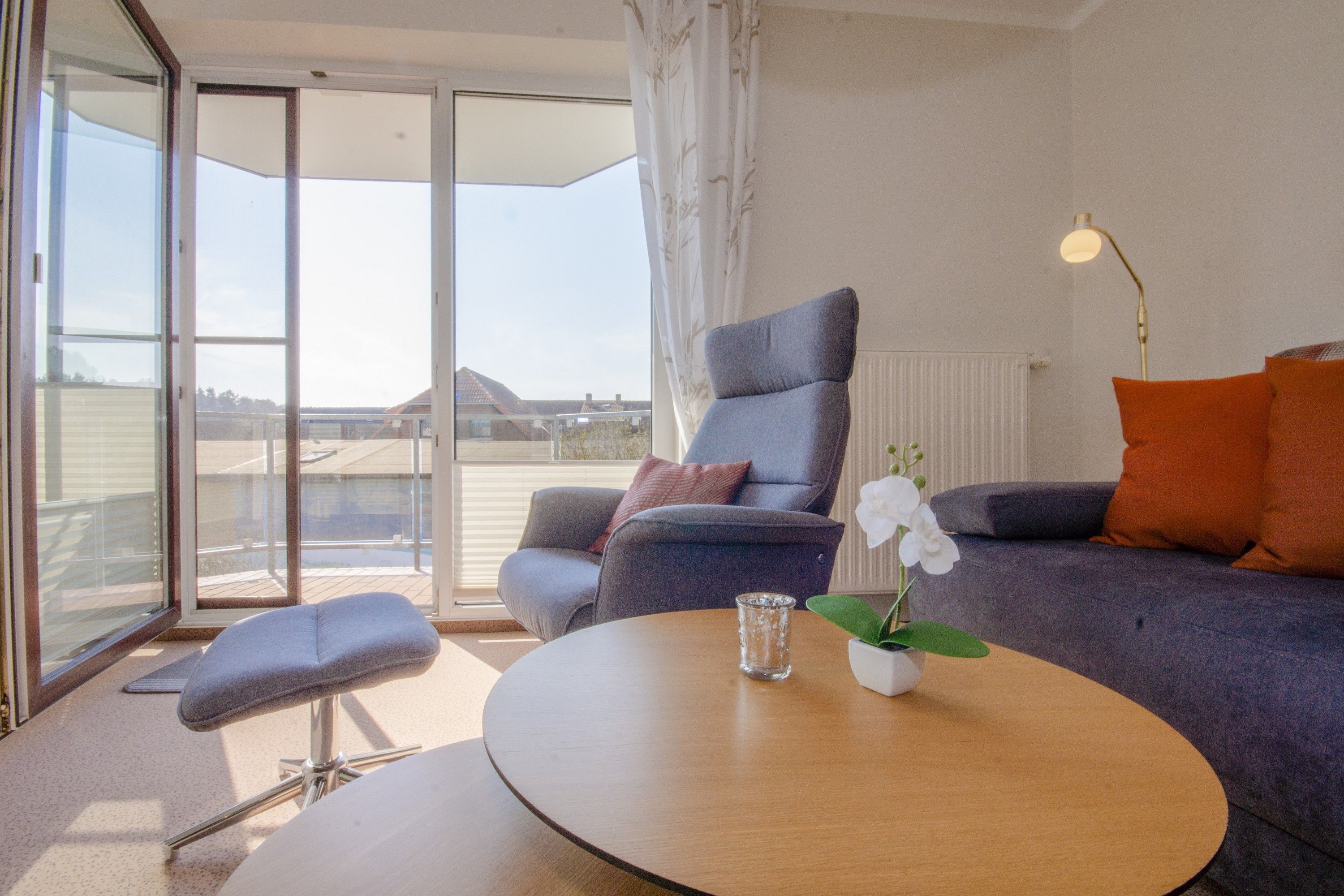 Der freundliche Wohnbereich bietet einen gemütlichen Ort zum Ausklingen der erlebnisreichen Tage auf Rügen. Hier befindet sich neben einem modernen Flachbild-TV auch eine außerordentlich komfortable Couchgarnitur, die eine optionale Aufbettung für bis zu 2 weitere Personen darstellt. Von diesem Zimmer erhalten Sie einen direkten Zugang auf den Balkon, welcher mit komfortablen Balkonmöbeln ausgestattet ist. Hier können Sie nach einem erlebnisreichen Strandtag in Baabe einfach mal die Seele baumeln lassen.