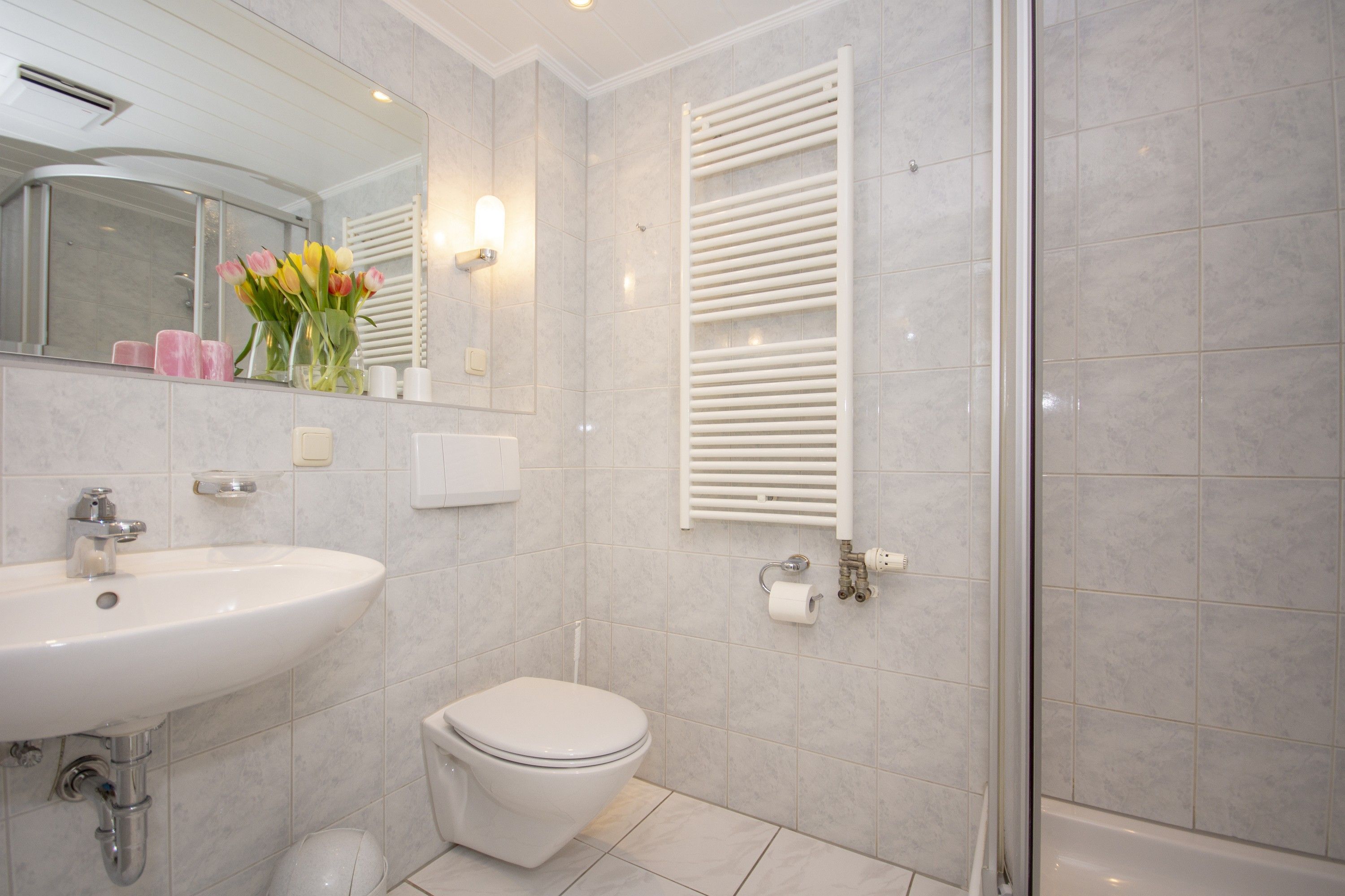 Das Badezimmer verfügt über eine Dusche, WC und einen Waschtisch mit großen Spiegel.