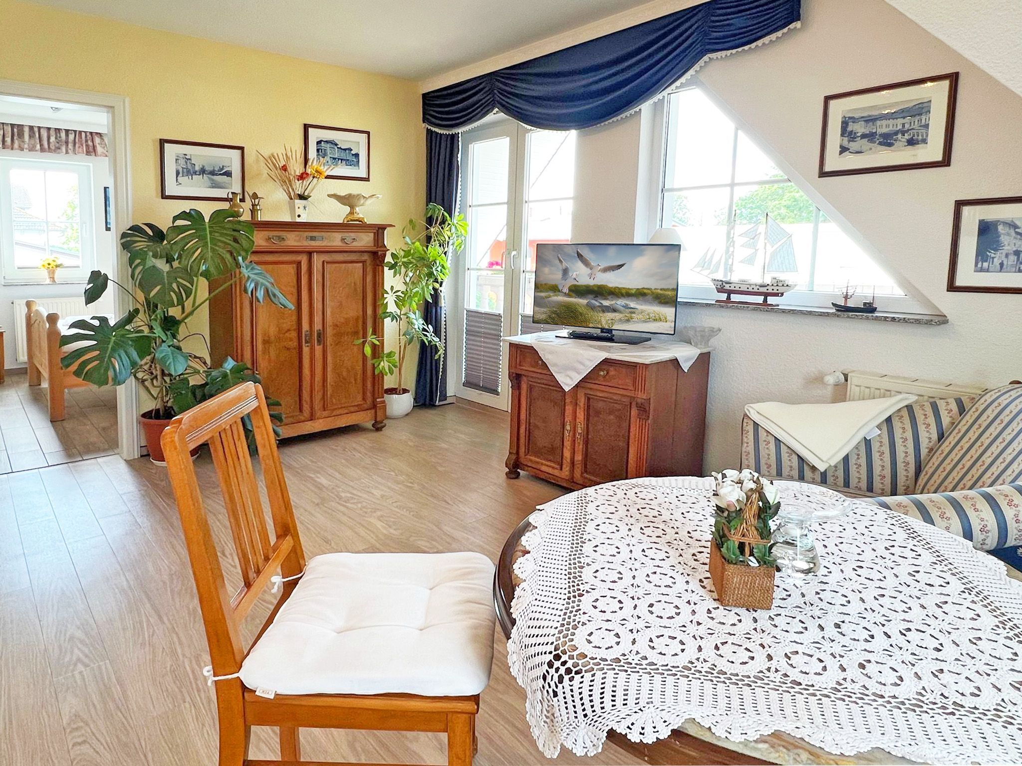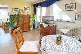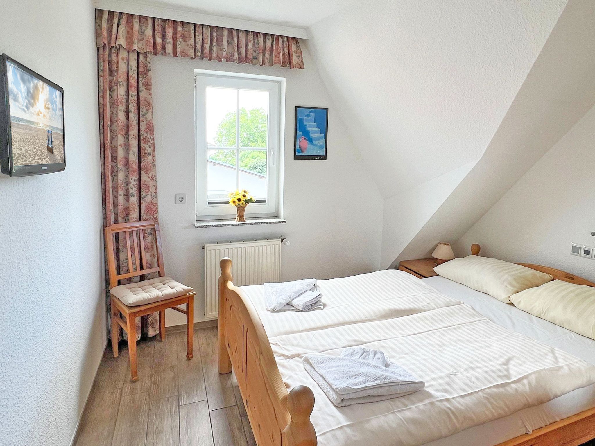 Die haustierfreie 36m²-Wohnung Nr. 1 liegt im Dachgeschoss und besteht aus einem Wohnraum mit Flachbild-TV, Küchenzeile (Kaffeemaschine, Wasserkocher, Toaster, Eierkocher, Kühlschrank, Mikrowelle, E-Herd), einem Bad mit Dusche/WC, Haartrockner, einem separaten Schlafraum mit einem Doppelbett. Es erwartet Sie ein großer West-Balkon mit Nachmittag- und Abendsonne.