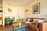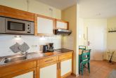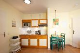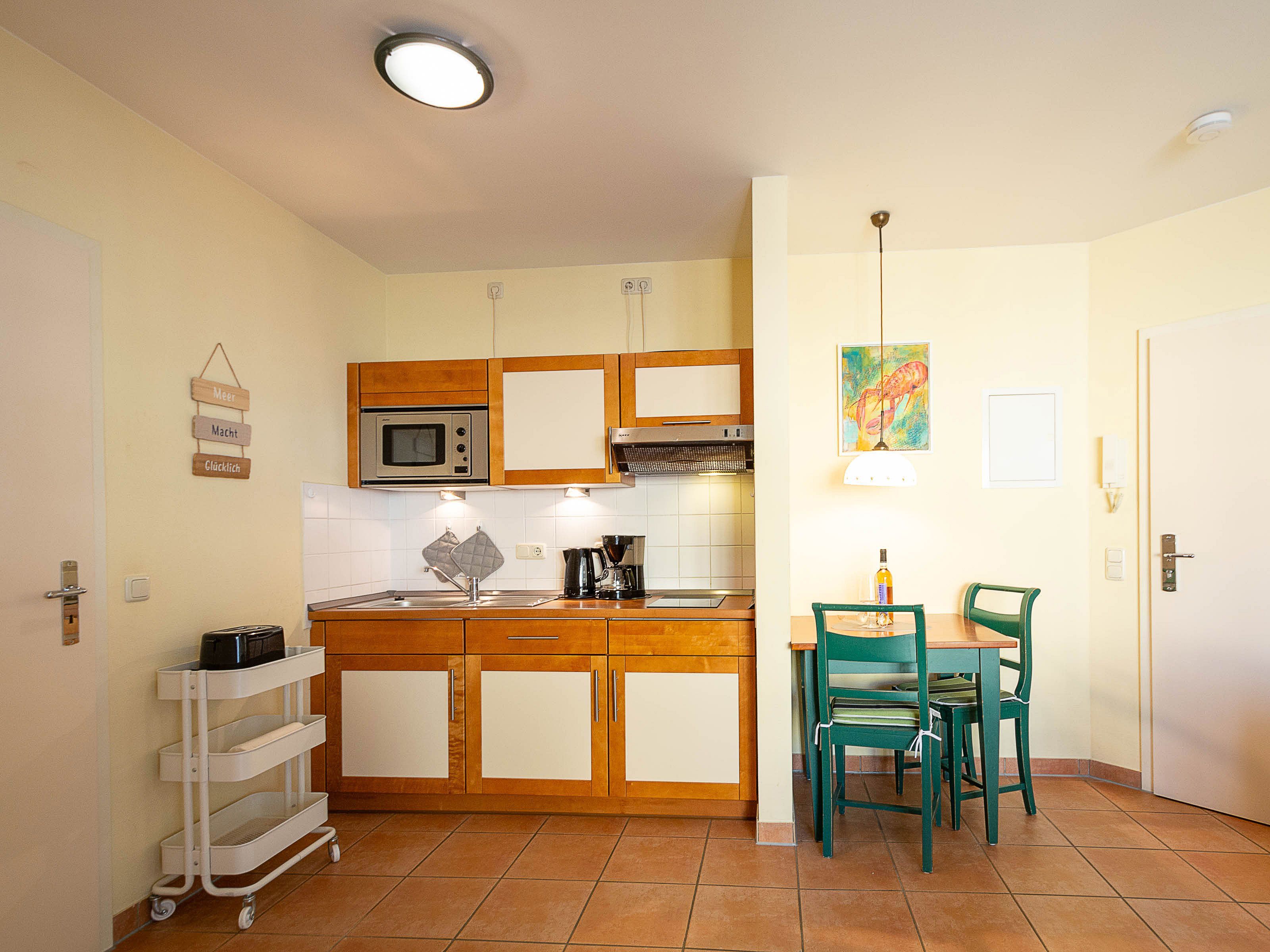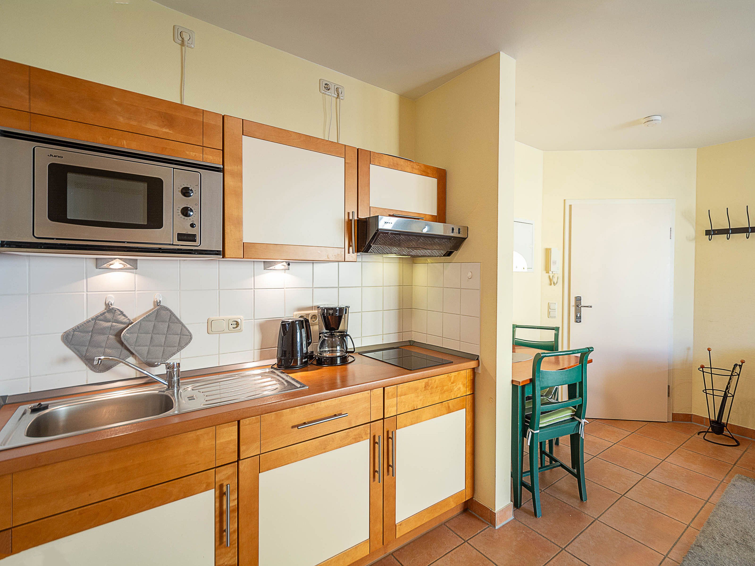Der angrenzende Essbereich bietet Ihnen Platz für gemeinsame Mahlzeiten. Die offene Pantry-Küche hält für Sie alle wichtigen Küchengeräte und -utensilien bereit, die Sie für Ihr perfektes Dinner benötigen: Ein 2-Platten-Kochfeld, eine Mikrowelle in bequemer Stehhöhe sowie ein Kühlschrank mit Gefrierfach befinden sich in der Küche. Eine Kaffeemaschine, ein Wasserkocher und ein Toaster sowie genügend Koch- und Essgeschirr vervollständigen die Kücheneinrichtung.