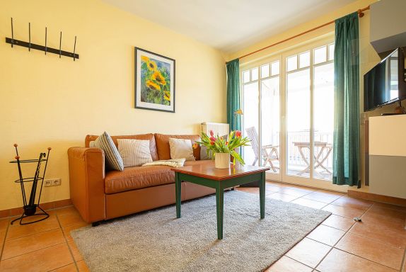 Der helle freundliche Wohnbereich ist mit einer Schlafcouch, Flatscreen-TV und einer Musikanlage eingerichtet. Die Couch lässt sich mit wenigen, einfachen Handgriffen in einen komfortablen Schlafplatz verwandeln. Als Sichtschutz bzw. zum Verdunkeln sind im Wohnbereich Vorhänge an den Fenstern angebracht.