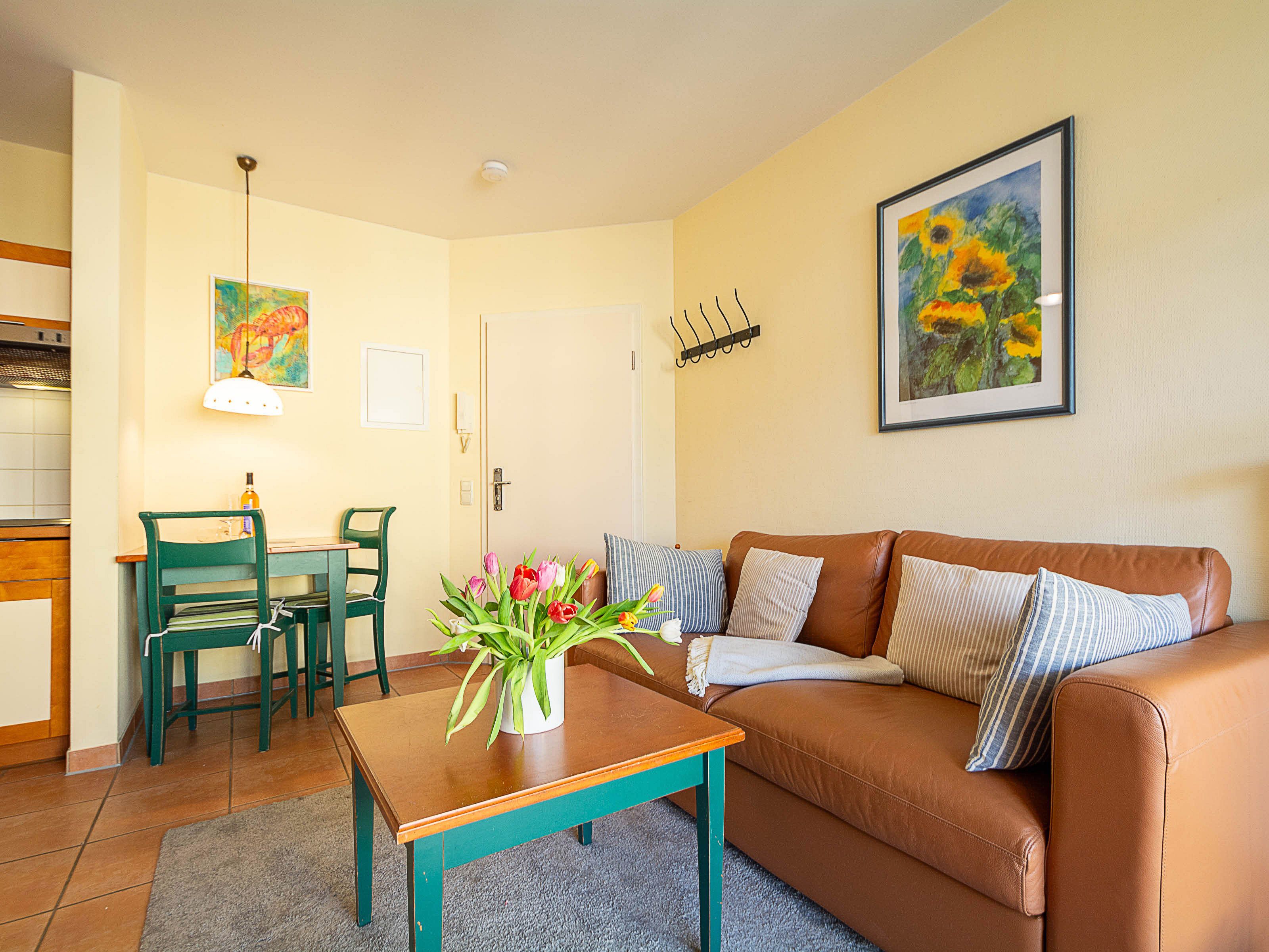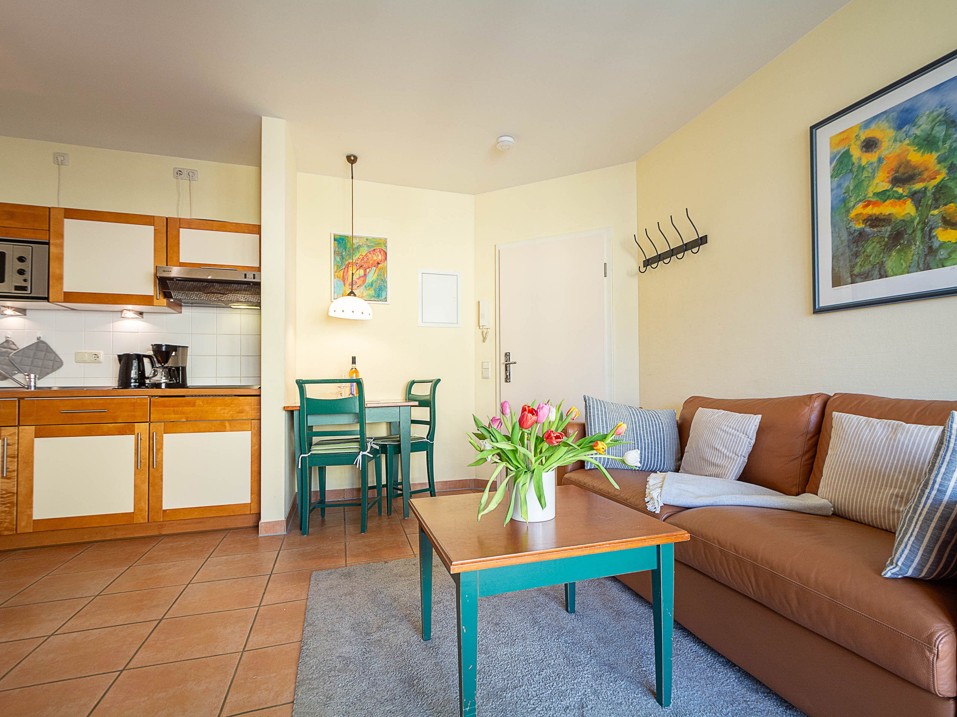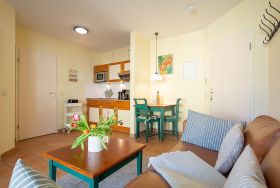 Herzlich willkommen in der Wohnung Nr. 8 in der Villa Schaumburg! Die komfortabel eingerichtete 2-Raum-Ferienwohnung befindet sich im 1. Obergeschoss des Hauses. Auf 33 qm Wohnfläche können hier 2 Personen erholsame Urlaubstage genießen. Eine dritte Person ist auf Anfrage möglich. Es empfangen Sie ein heller offener Wohn-und Essbereich mit einer Pantry-Küchenzeile, ein Schlafzimmer, ein Duschbad sowie eine Loggia mit Nord-Ost-Ausrichtung. Der Wohnraum ist mit mediterranen Fliesen, das Schlafzimmer mit Teppich ausgestattet.