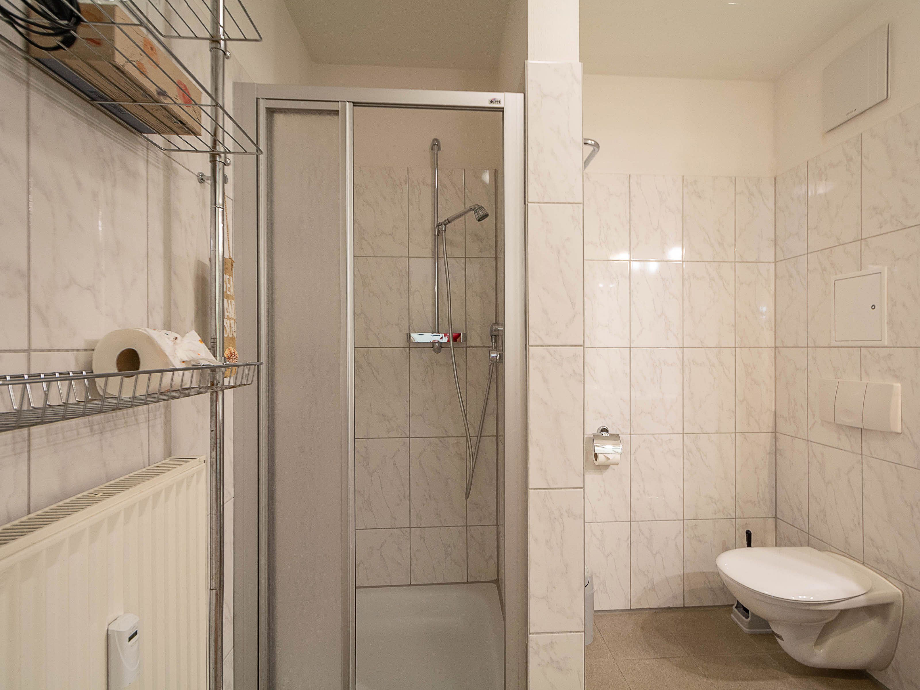 Das geflieste Bad ist ausgestattet mit einer Dusche, Waschbecken, WC und einem Föhn komplettiert die Gesamteinrichtung dieser Ferienwohnung.