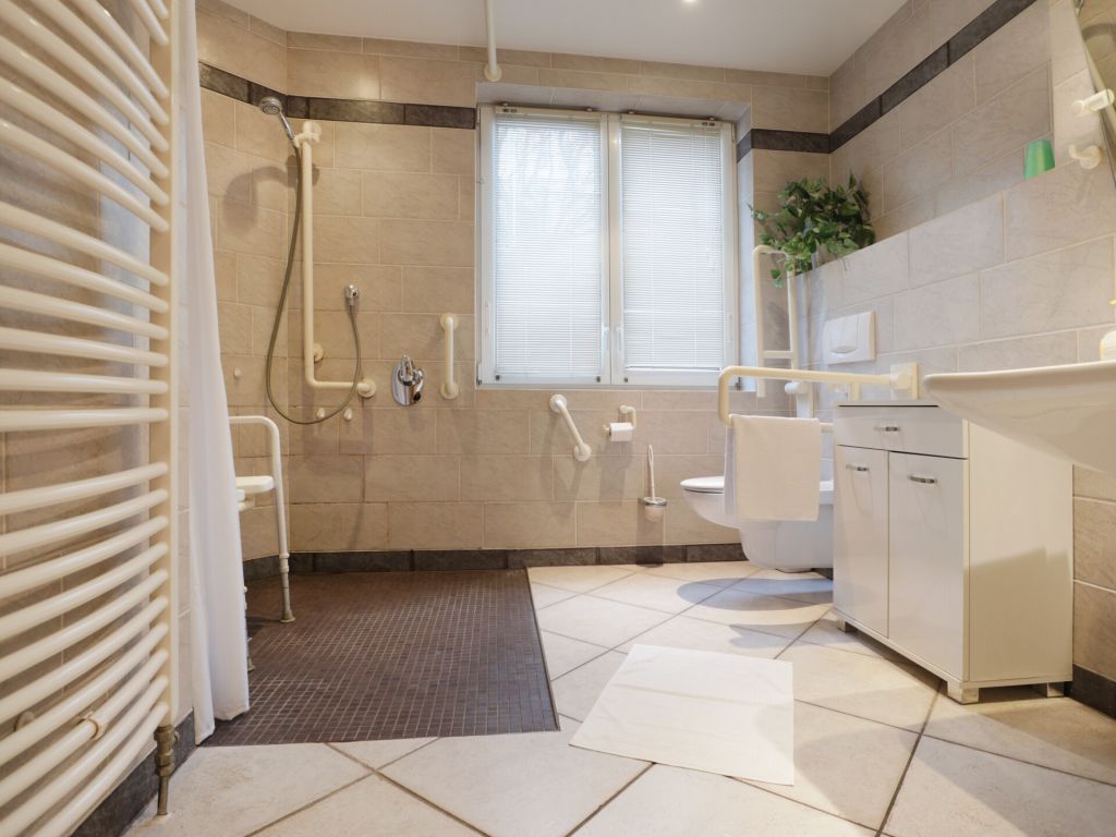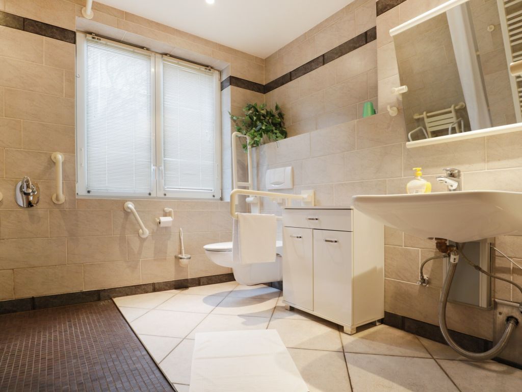 Zudem ist ein behindertengerechtes Tageslichtduschbad vorhanden mit einem höhenverstellbaren Waschtisch, Haltegriffen, Sitzhocker, Handtuchheizung und WC.