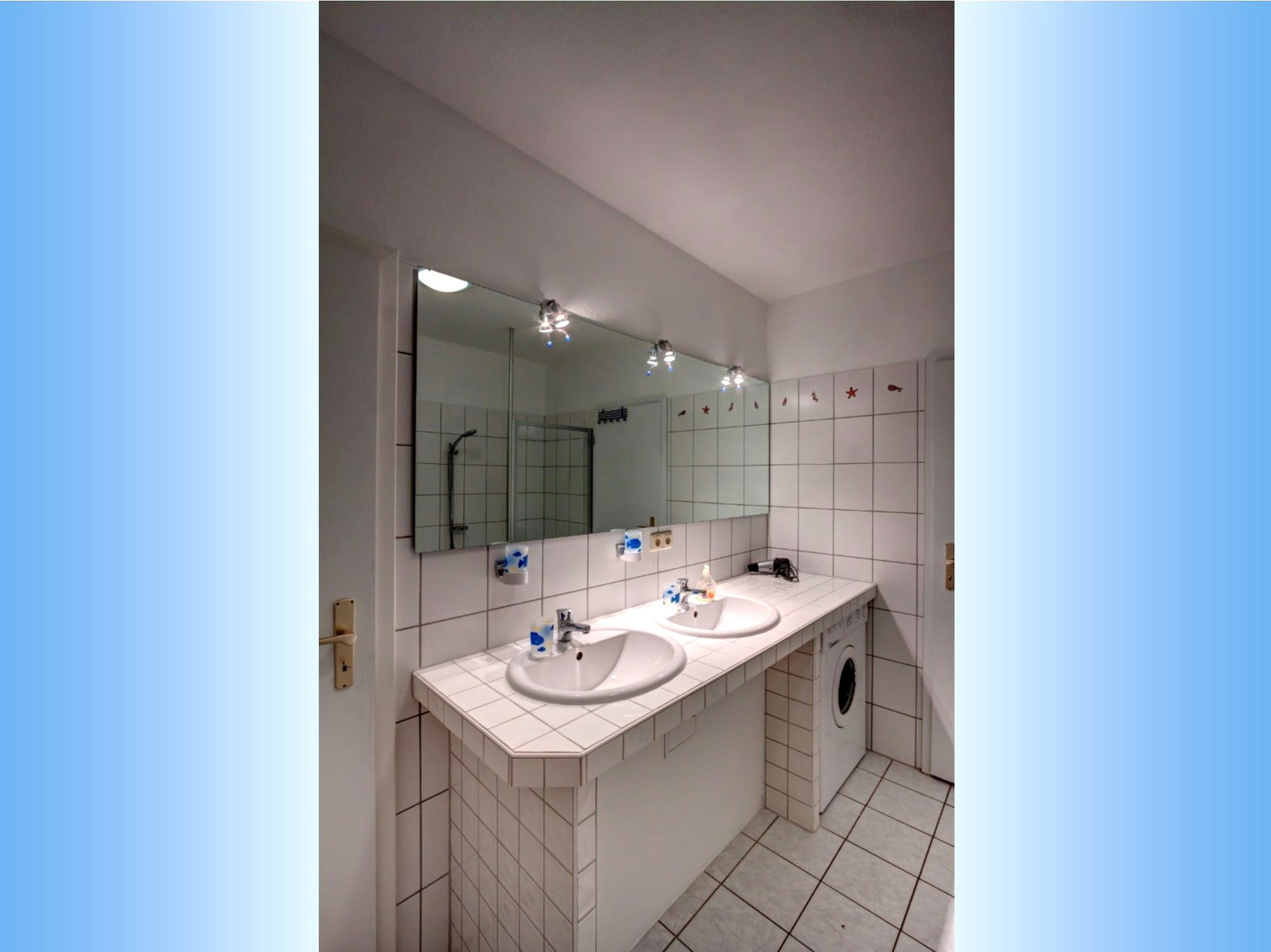 Modernes Bad mit Wanne, Dusche, Doppelwaschtisch & Fön,