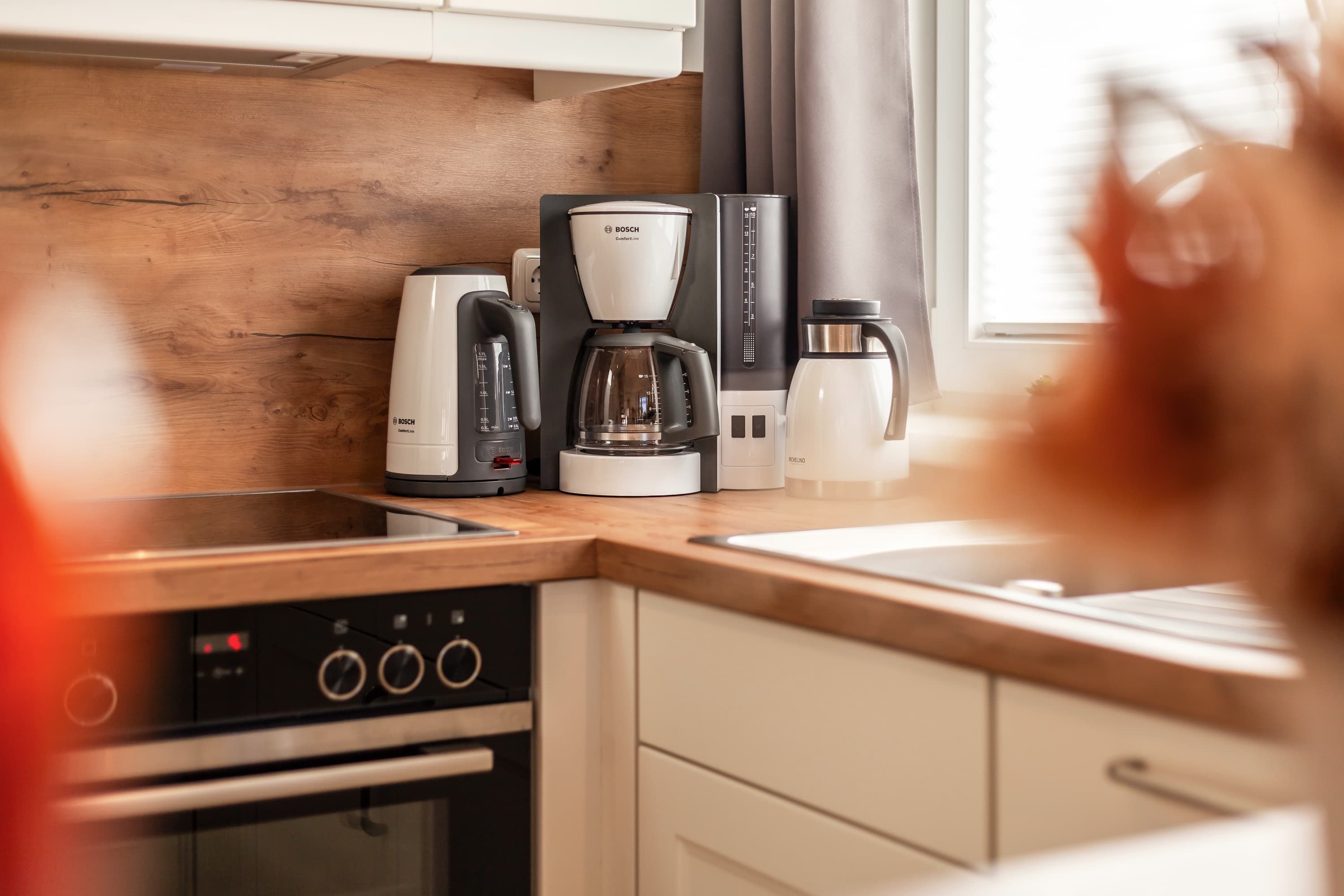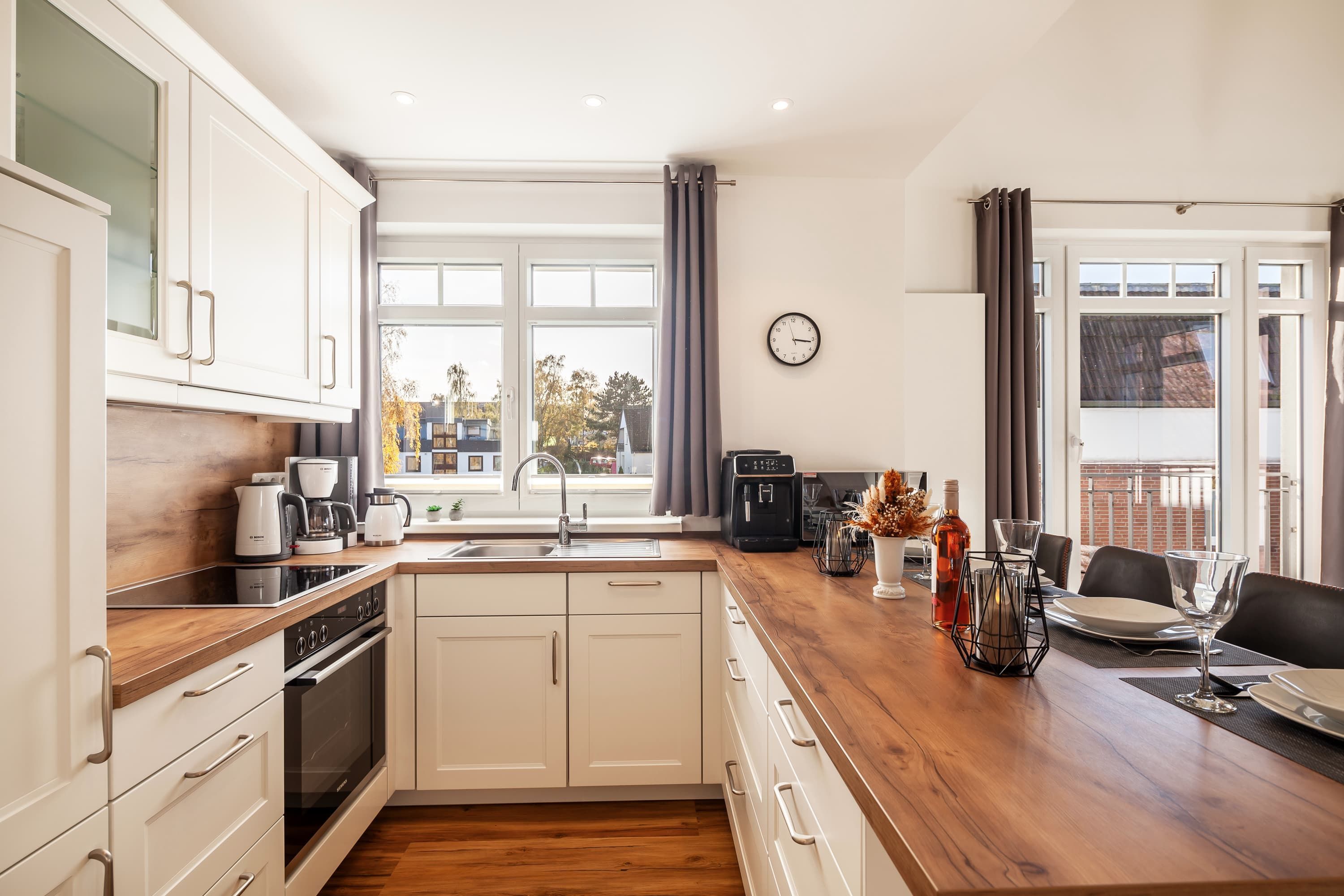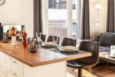 Jede Wohnung verfügt über eine vollständige Küchenausstattung, die keine Wünsche offen lässt. Die offene Gestaltung der Küche schafft eine einladende Atmosphäre und bietet alles, was Sie für einen angenehmen Aufenthalt benötigen, einschließlich Herd mit Backofen und großem Kühl- und Gefrierschrank, sowie Geschirrspülmaschine.
