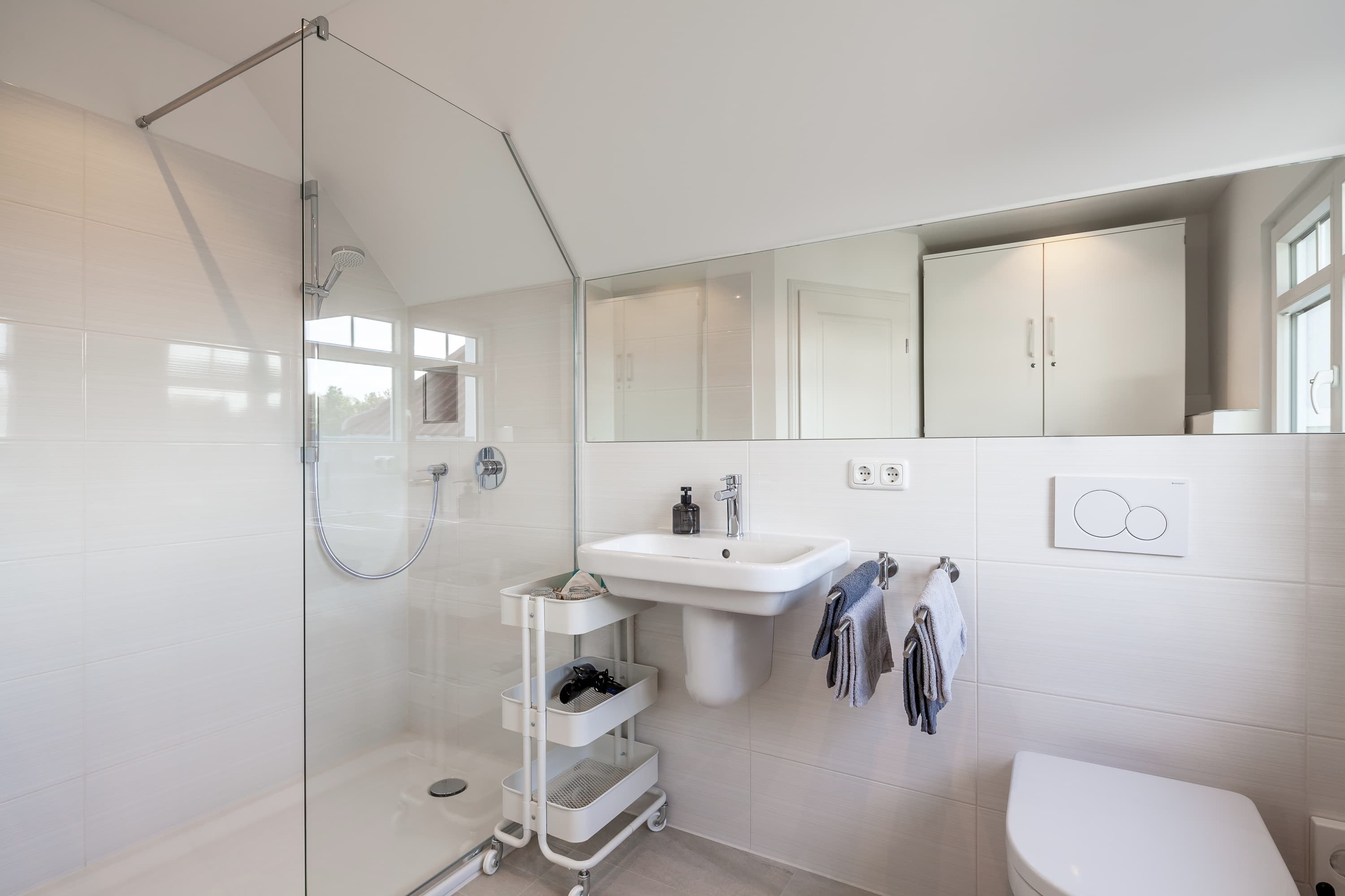 Im geräumigen Duschbad finden Sie nicht nur eine erfrischende Dusche, sondern auch einen großzügigen Schrank für Ihre persönlichen Gegenstände.