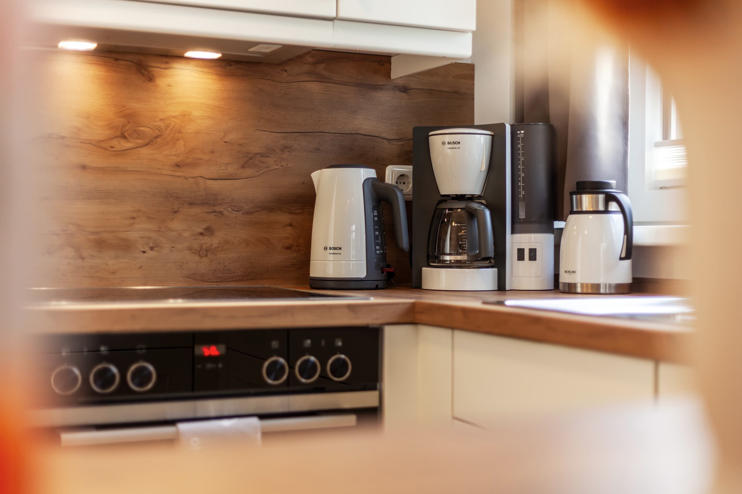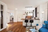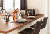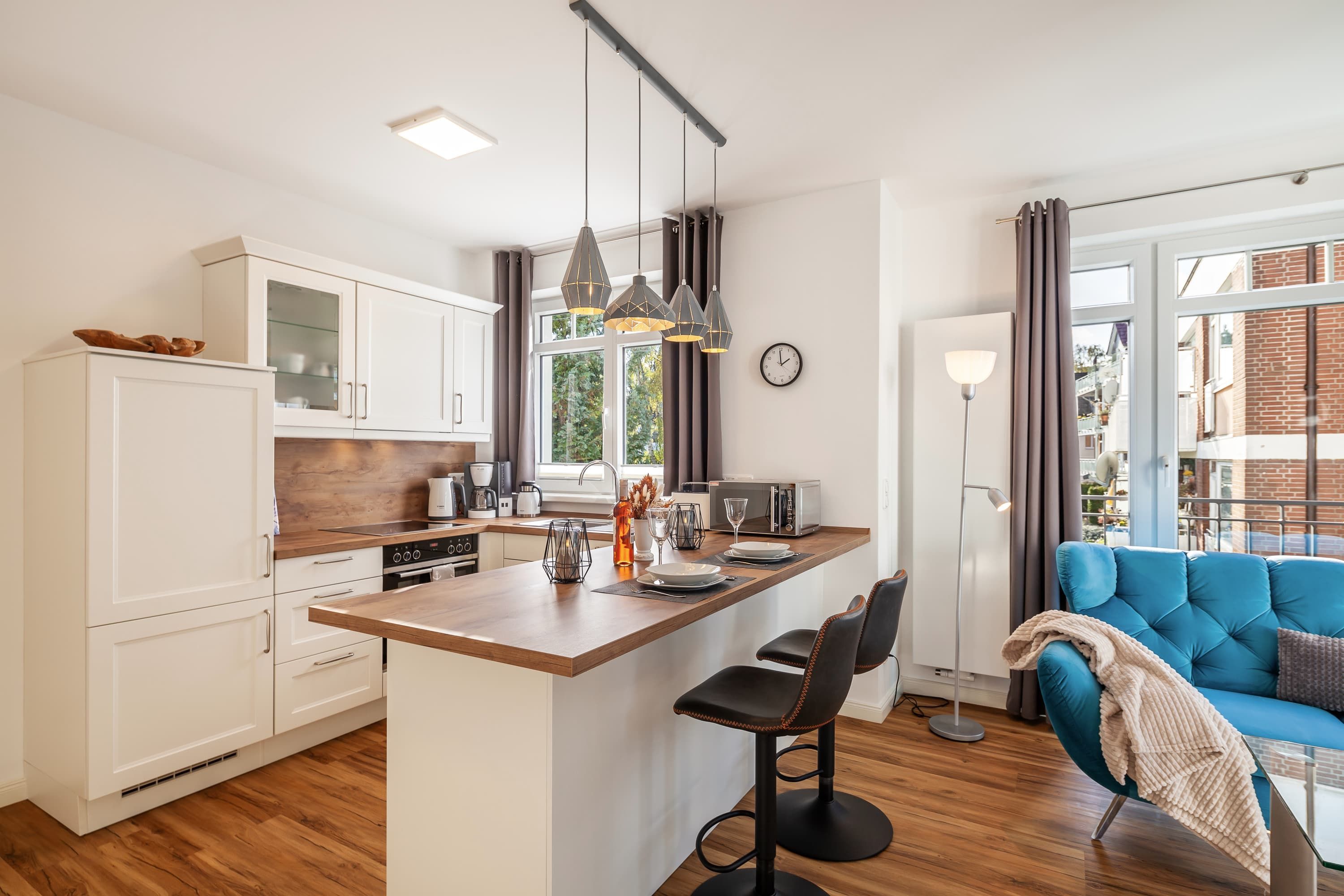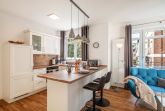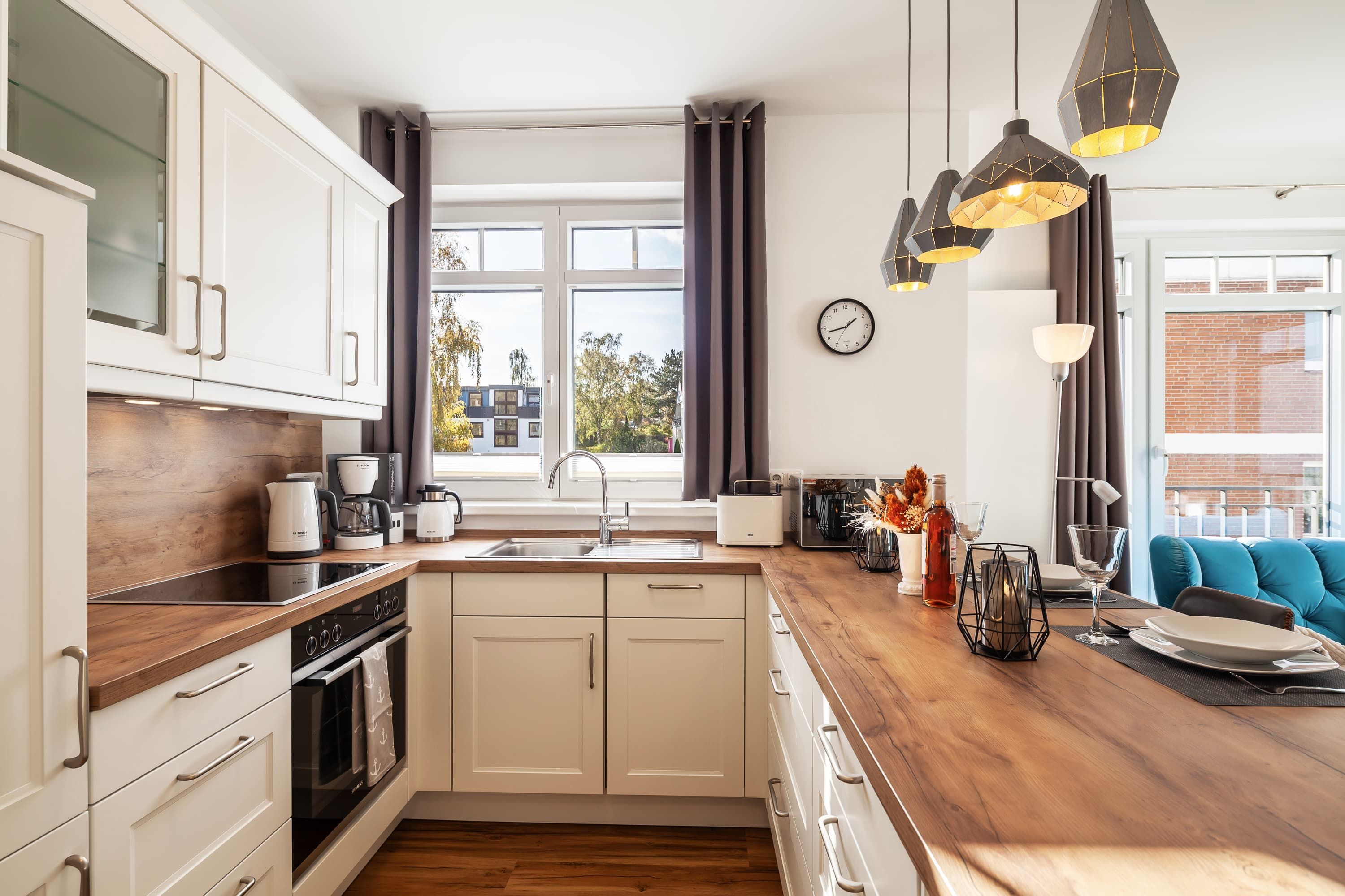Jede Wohnung verfügt über eine vollständige Küchenausstattung, die keine Wünsche offen lässt. Die offene Gestaltung der Küche schafft eine einladende Atmosphäre und bietet alles, was Sie für einen angenehmen Aufenthalt benötigen, einschließlich Herd mit Backofen und großem Kühl- und Gefrierschrank, sowie Geschirrspülmaschine.