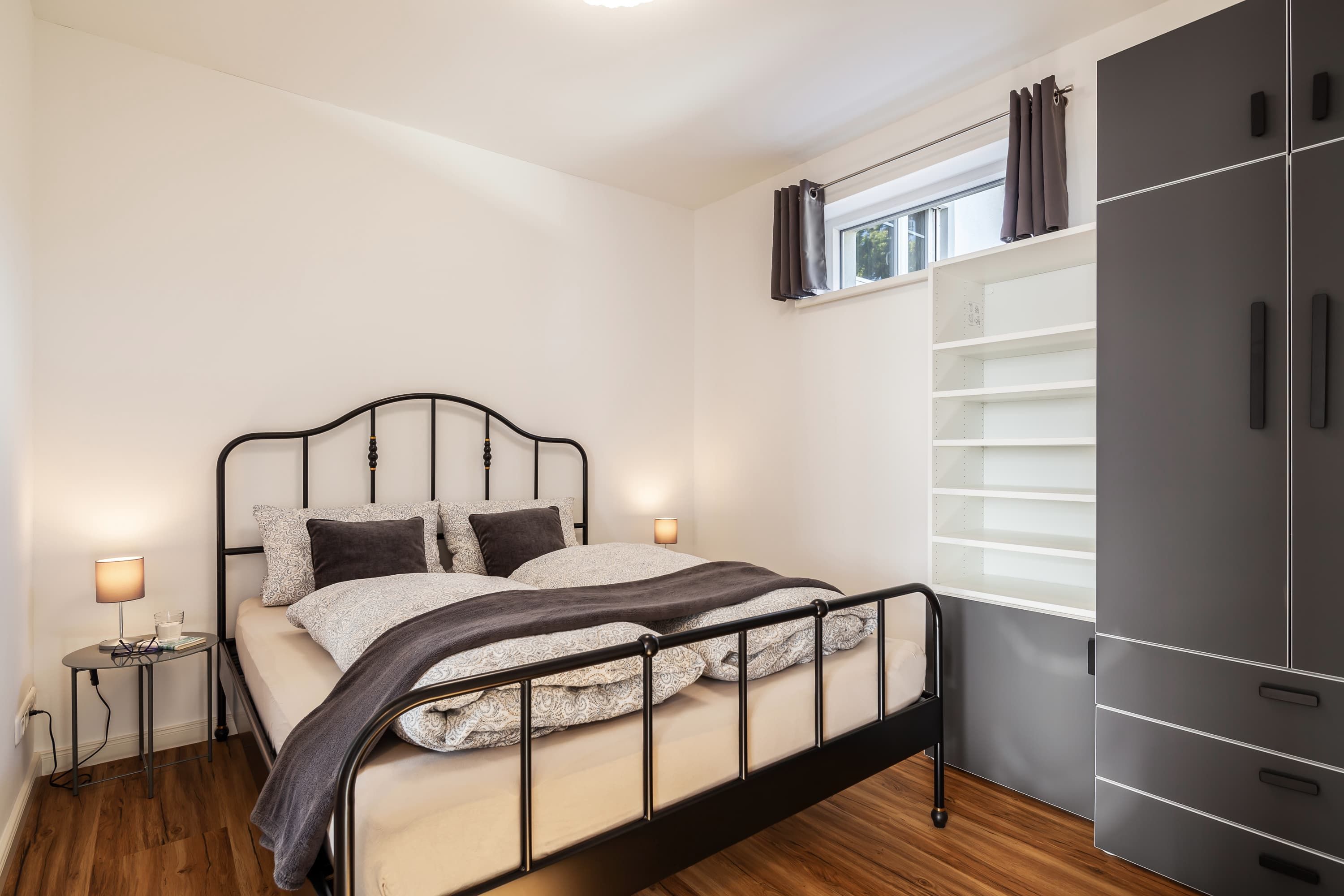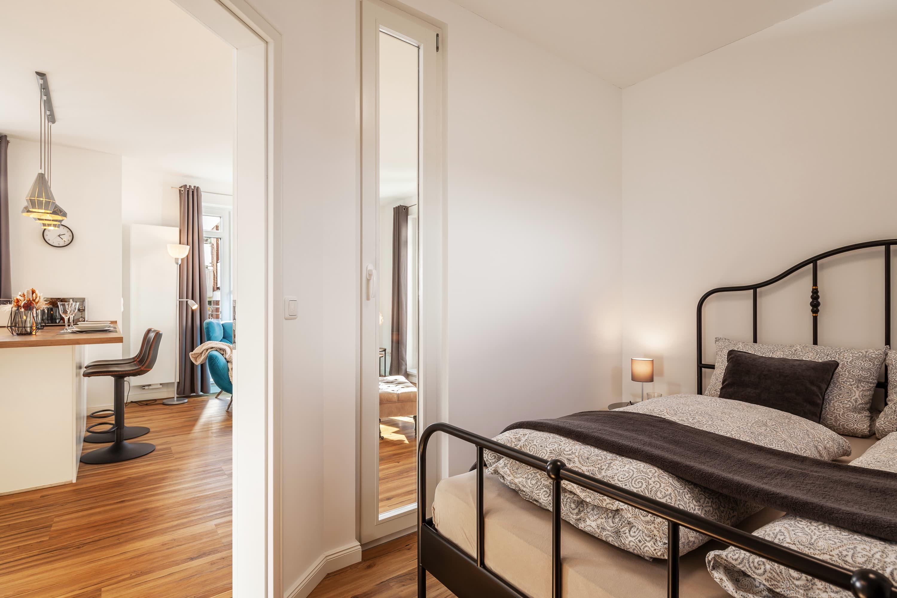 Unsere Wohnung ist darauf ausgerichtet, Ihnen erholsamen Schlaf zu ermöglichen. Das Schlafzimmer ist mit hochwertigen, schalldichten Fenstern ausgestattet und bietet ausreichend Verdunklungsmöglichkeiten. Die natürliche Bauweise unterstützt zudem ein angenehmes Raumklima, ähnlich einer Klimaanlage. Ein zusätzliches Fenster Element zum Wohnbereich verleiht dem Schlafzimmer einen besonderen Charme und lässt sich je nach Wunsch öffnen.