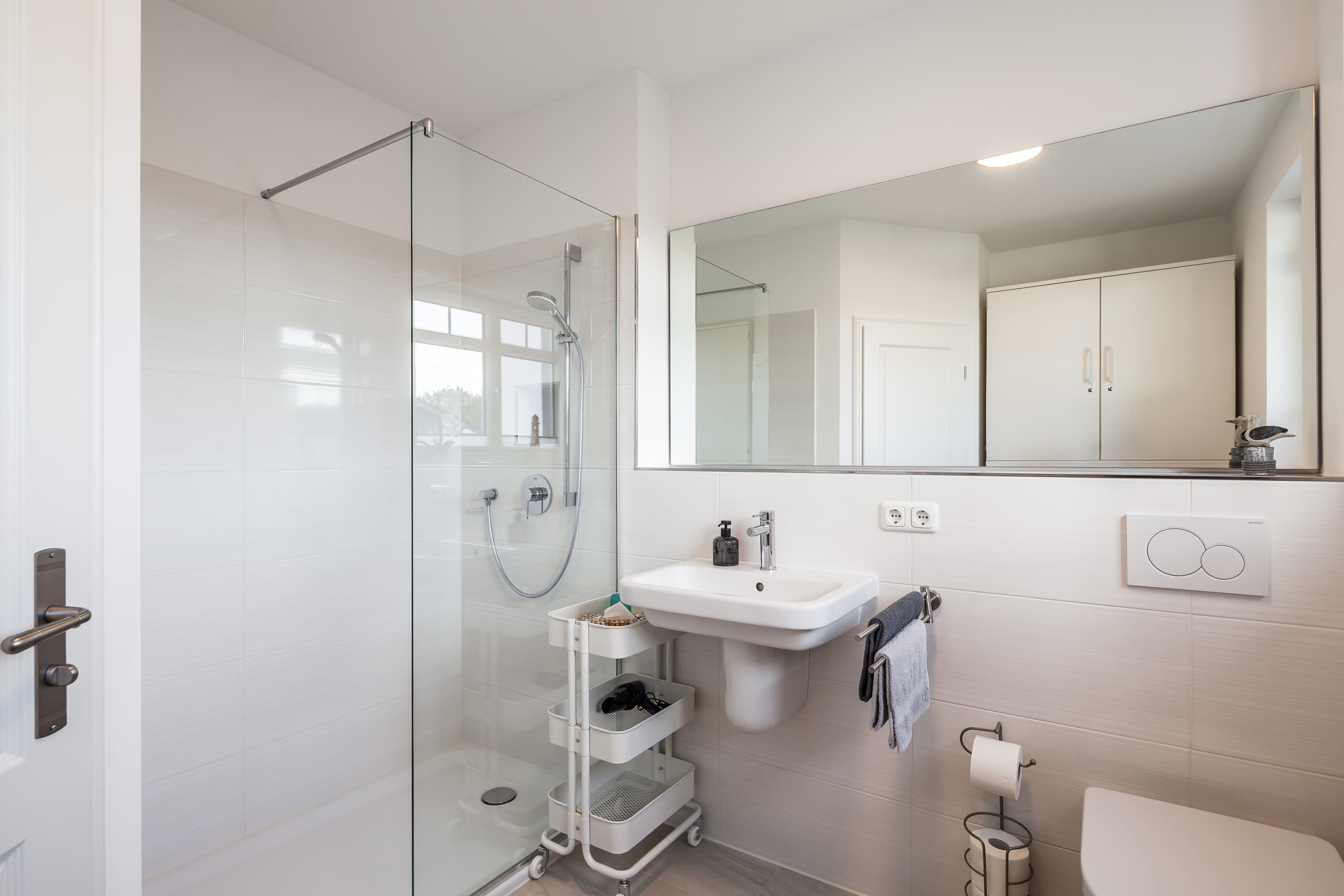 Im geräumigen Duschbad finden Sie nicht nur eine erfrischende Dusche, sondern auch einen großzügigen Schrank für Ihre persönlichen Gegenstände.