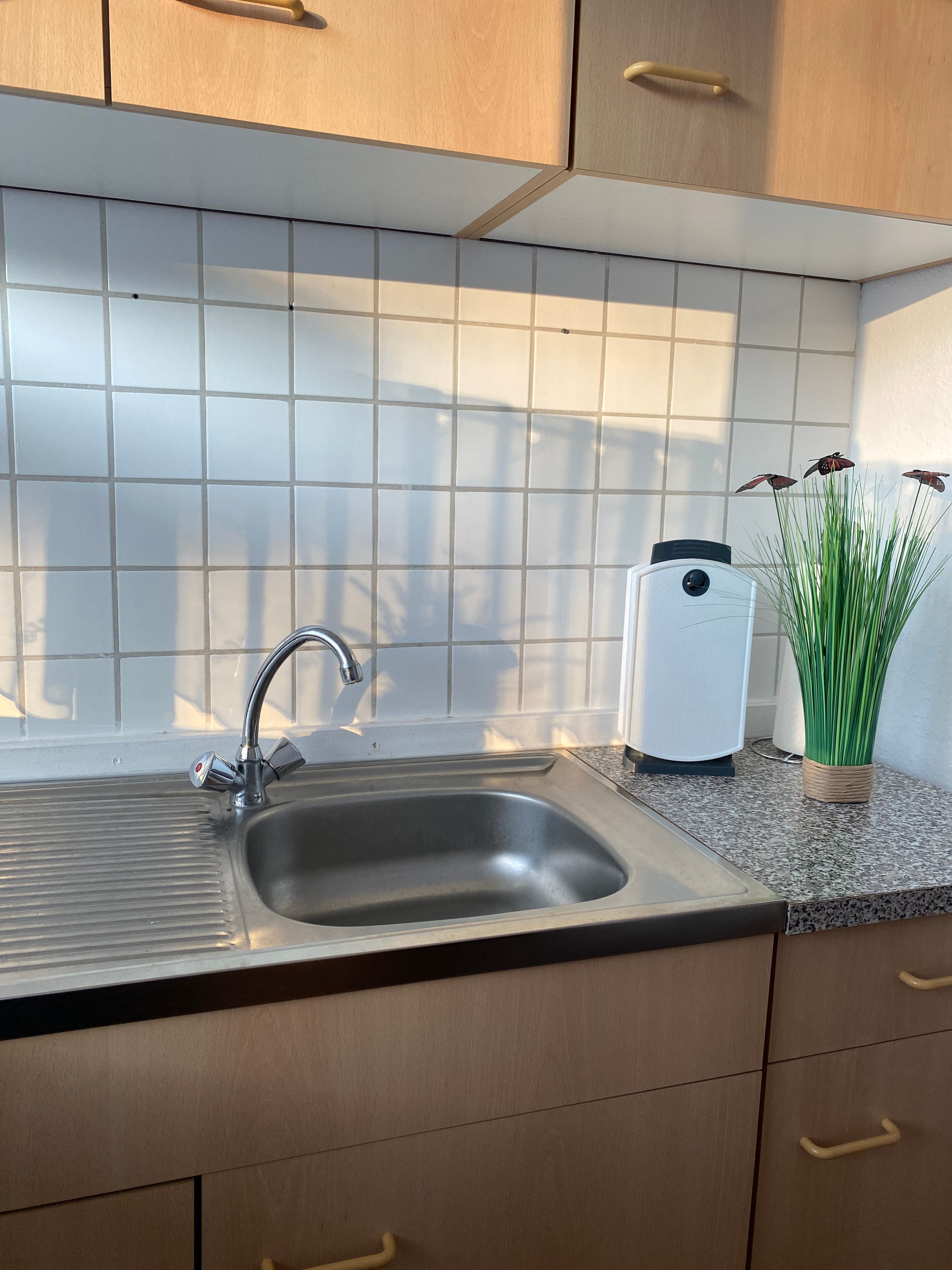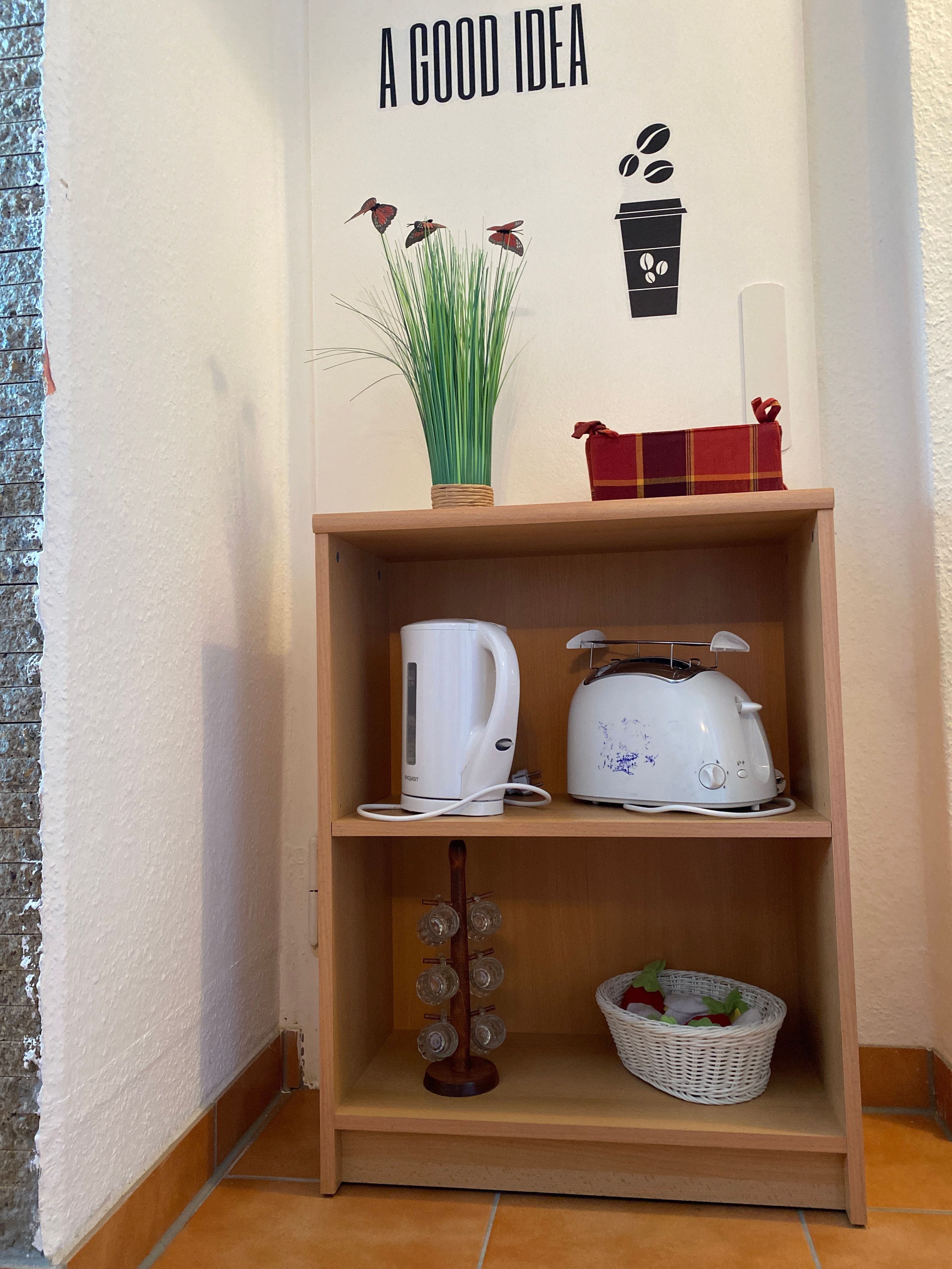 • Küche: kleine Küchenzeile, 4er-Ceran-Herd, Backofen, Kühlschrank mit Gefrierfach, Spülmaschine, Wasserkocher, Kaffeemaschine, Toaster, Mikrowelle