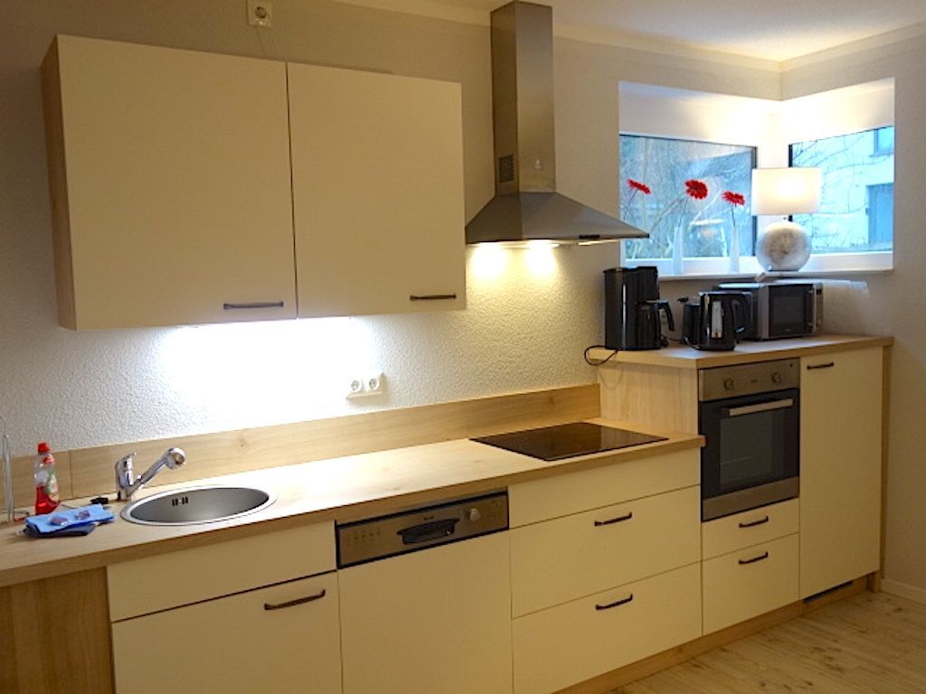 - Küchenbereich mit Küchenzeile (Backofen, Mikrowelle, 4 Zonen - Induktionskochfeld, Kühlschrank mit