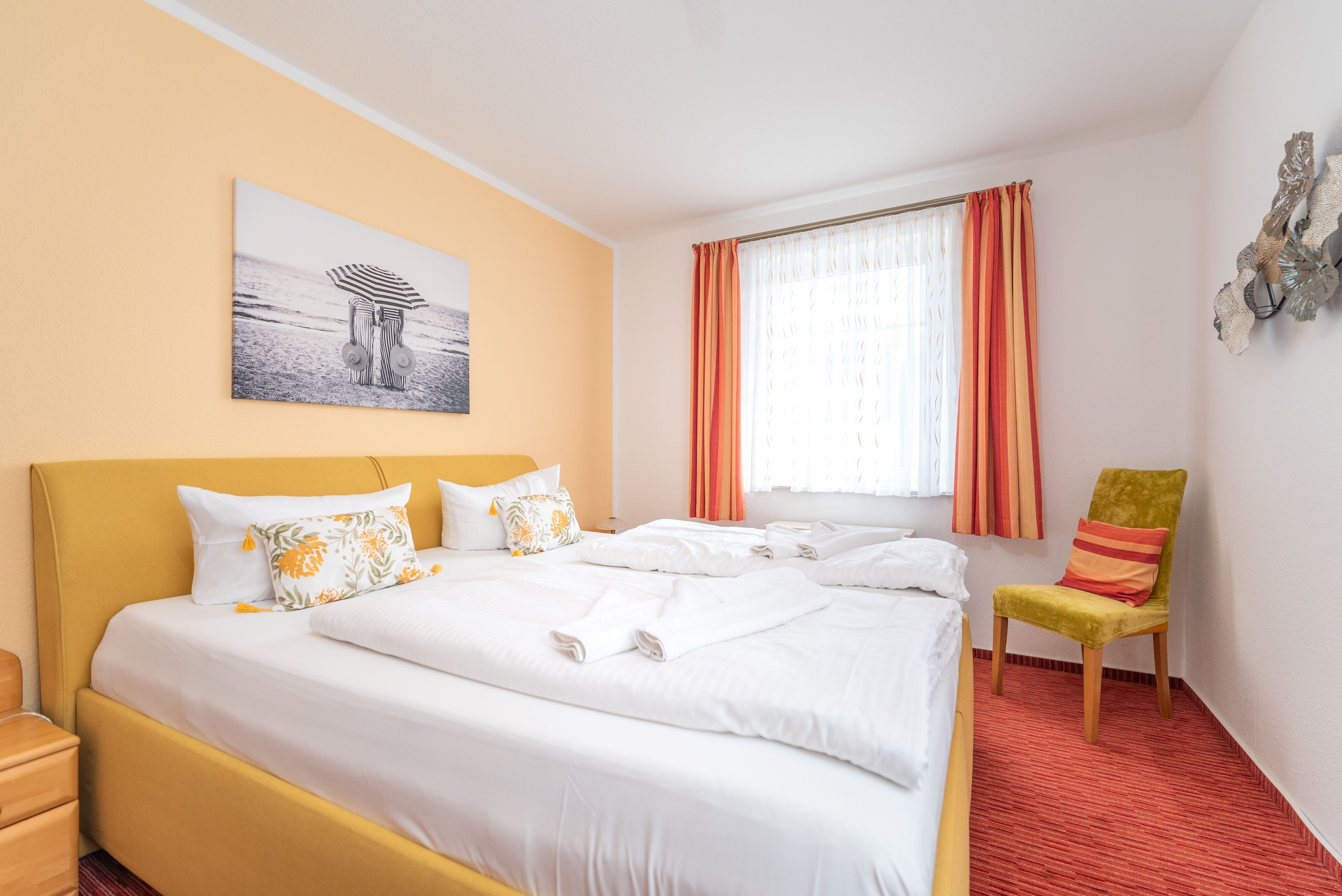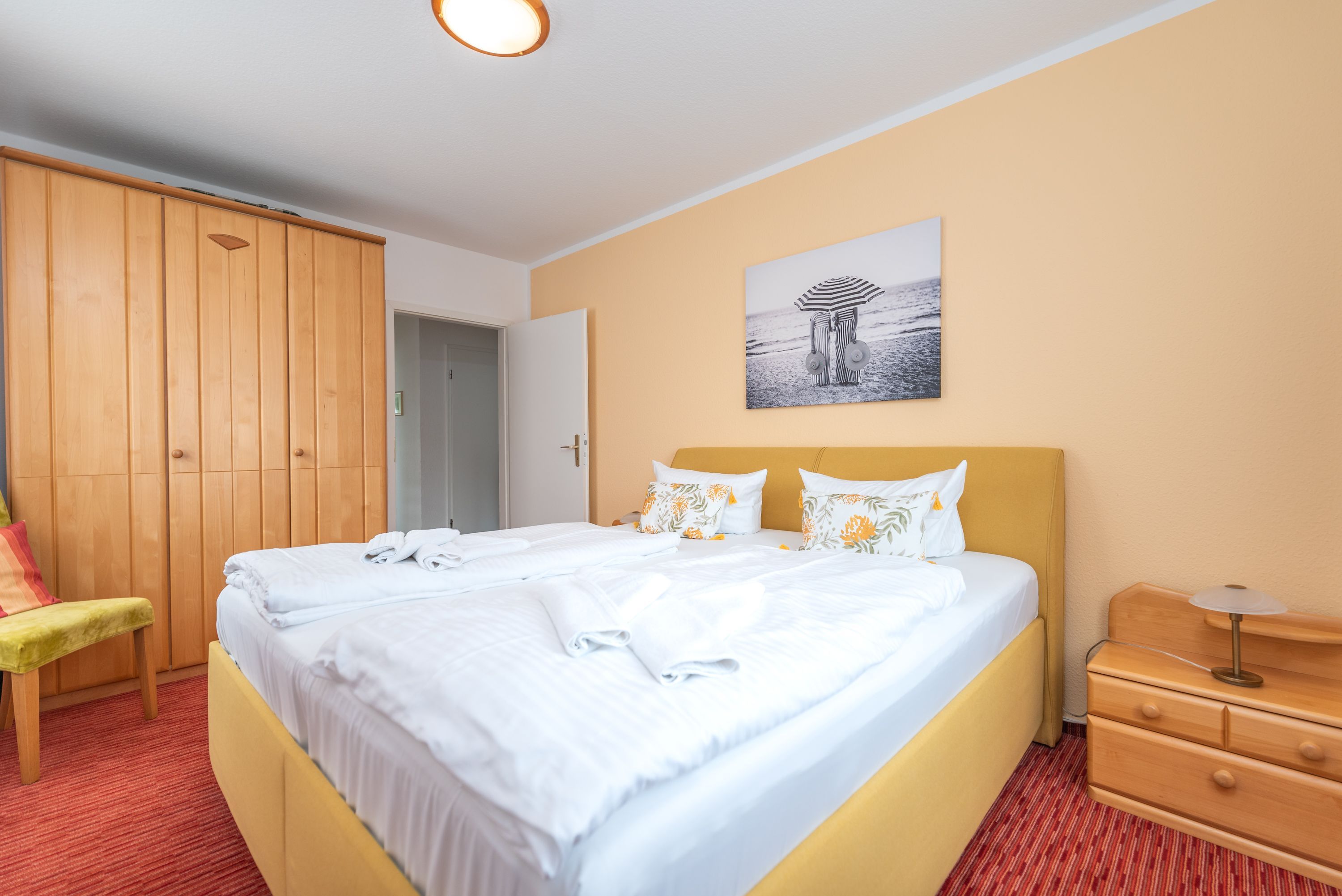 • Schlafzimmer: Ein Ruhepol mit komfortablem Doppelbett und großem Kleiderschrank, der ausreichend Stauraum für Urlaubsgarderobe bereithält.