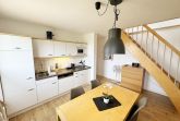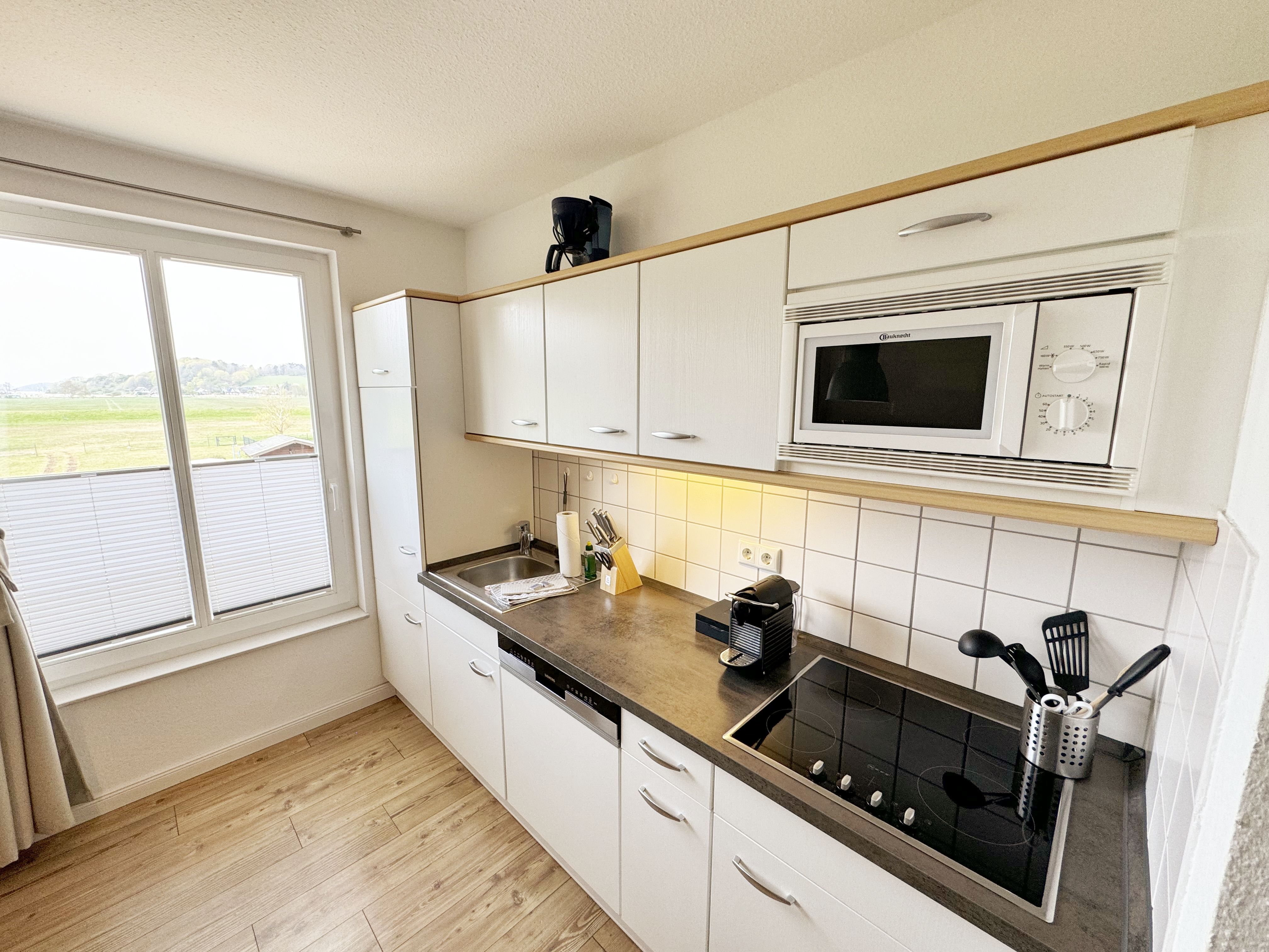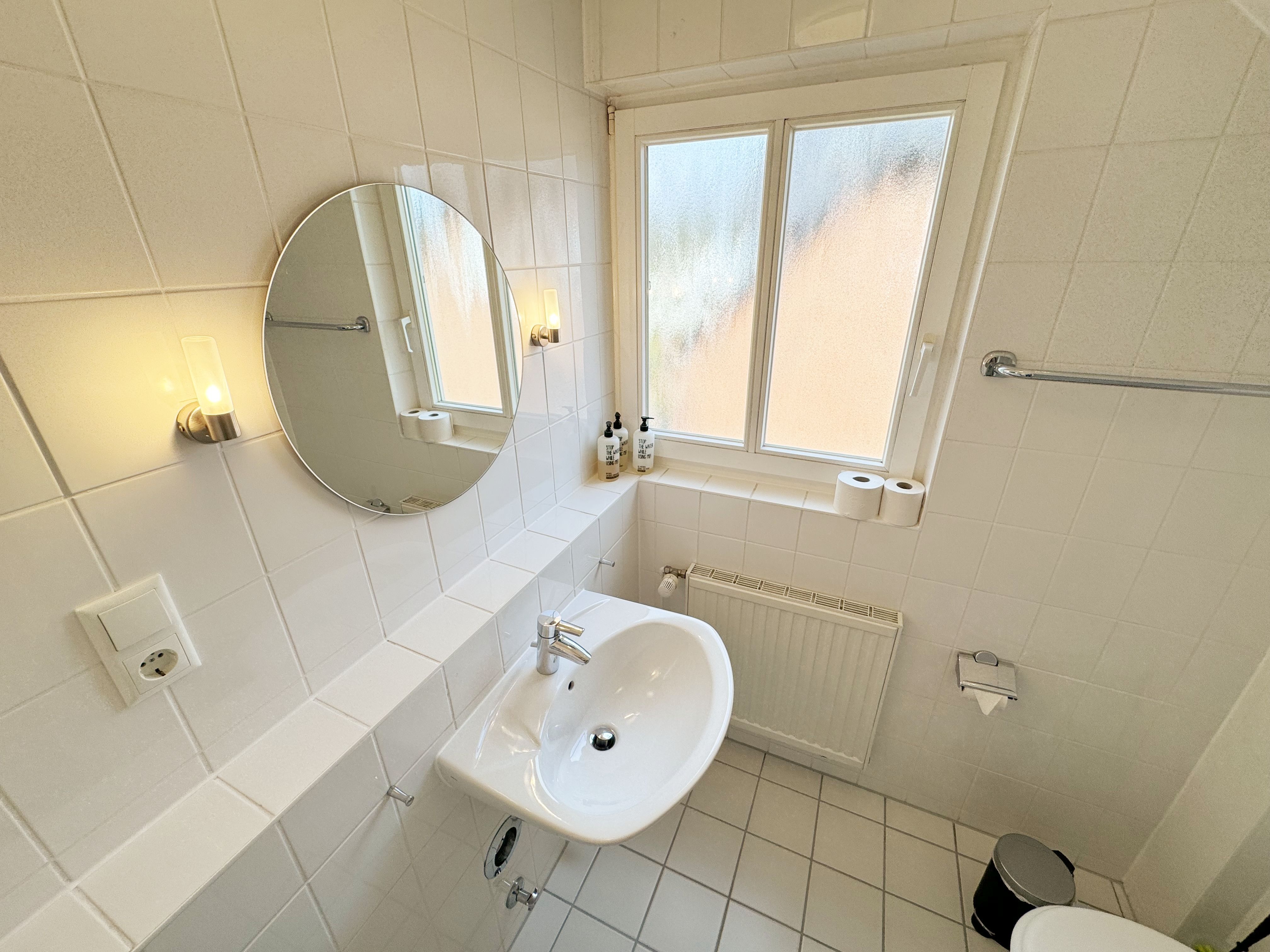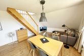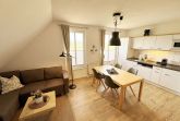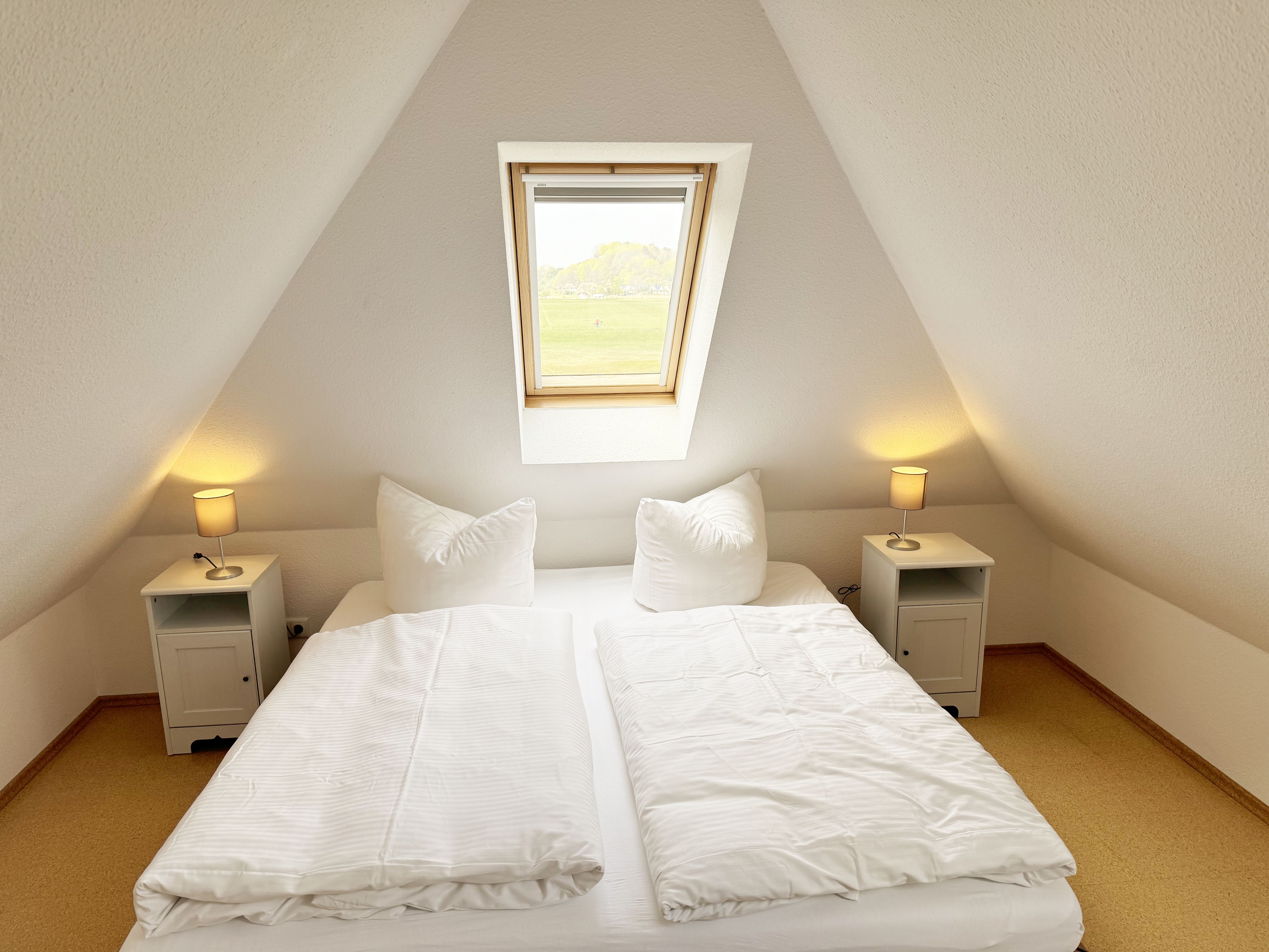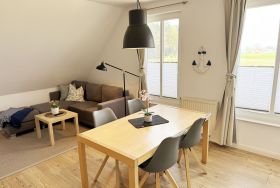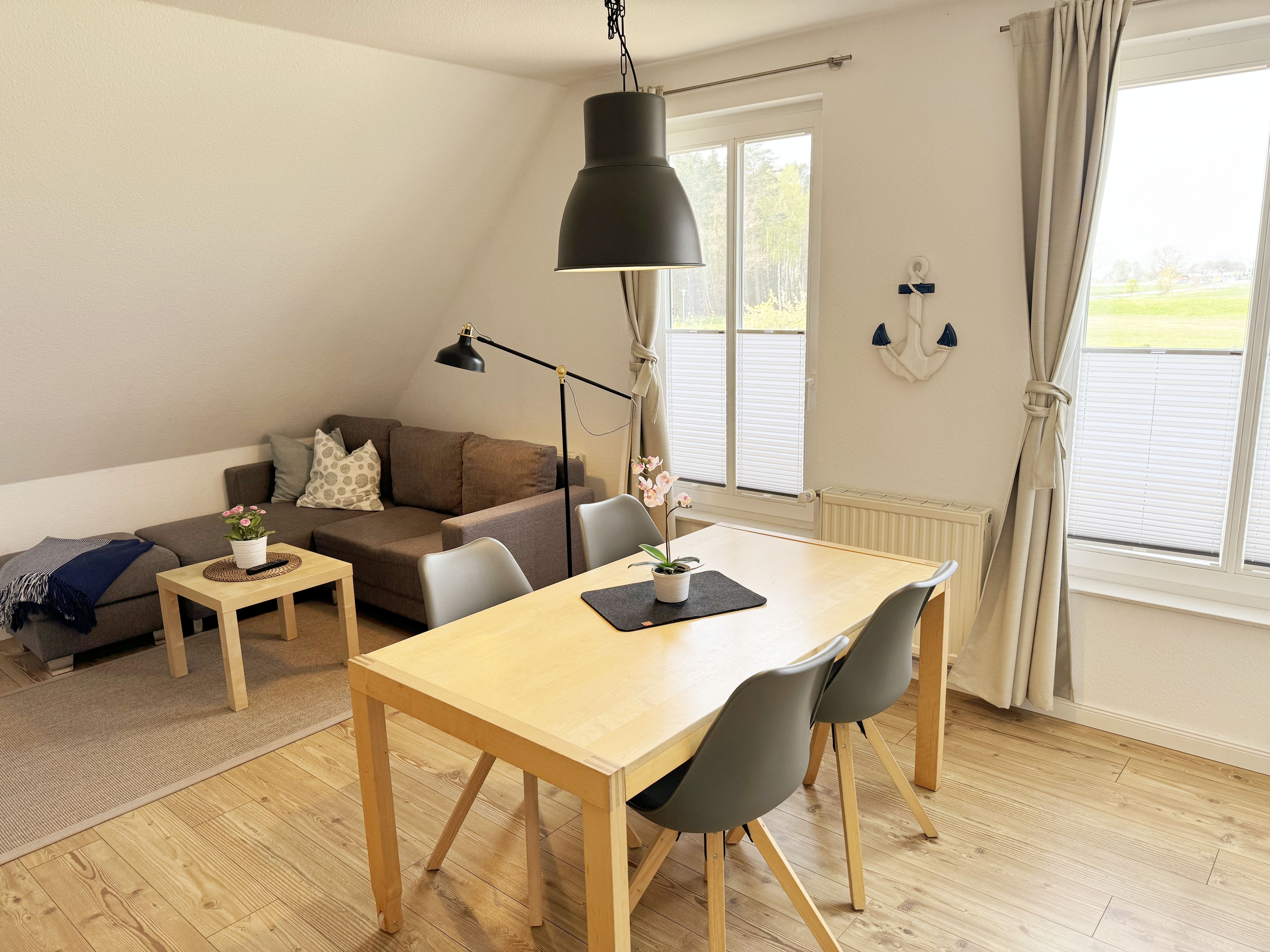 Die Ferienwohnung Fährmann`s Ausblick befindet sich im Obergeschoss des Gästehaus Am Brook. Der Name ist hier auch Programm, denn der Weitblick auf den Hafen von Baabe, Seedorf und zum Greifswalder Bodden ist traumhaft. Die 70 qm Nichtraucher-Maisonette-Wohnung ist modern und hell im skandinavischen Stil eingerichtet und bietet Platz für max. 4 Erwachsene und zwei Kleinkinder bis 3 Jahre im Kinderreisebett. Fotografien der Insel lassen Sie beim Eintreten auf der Insel ankommen. Über einen kleinen Flur mit Garderobe gelangen Sie direkt in den großen Wohn- und Essbereich mit Einbauküche. Die bodentiefen Fenster mit Absturzsicherung und Insektenschutzgittern haben Südausrichtung und sorgen für viel Tageslicht. Der Wohnbereich ist gemütlich gestaltet und lädt zum Entspannen ein. Es verfügt über eine bequeme Eckcouch mit variablem Fußteil, einen Couchtisch, eine Stehlampe und einen Sessel. Hier können Sie es sich gemütlich machen, einen Film auf dem 55-Zoll-Smart-TV genießen oder der Musik aus dem Bluetooth-Radio lauschen. Ein WLAN-Anschluss rundet den technischen Bereich ab. In dem Sideboard finden Sie ausreichend Stauraum für Ihre persönlichen Gegenstände. Zusätzlich befindet sich dort eine Spielesammlung für die ganze Familie sowie eine kleine Auswahl an Büchern. Die Einbauküche beinhaltet alles, was Sie zur Zubereitung Ihrer Mahlzeiten benötigen. Wie ein Induktionsherd, ein Kühlschrank mit Gefrierfach, eine Mikrowelle und ein Geschirrspüler. Darüber hinaus steht Ihnen sowohl eine Filter-Kaffeemaschine als auch eine Nespresso-Kapselmaschine, ein Wasserkocher, ein Toaster, ein Messerblock sowie viele Kochutensilien zur Verfügung. Ein Esstisch rundet den Küchenbereich ab. Von hier aus gelangen Sie über eine Treppe mit Treppenschutz in den oberen Schlafbereich. Hier befindet sich ein Doppelbett (1,80m x 2,00 m) mit Nachttischablagen, verstellbare Lattenroste und Leseleuchten, ein Kleiderschrank sowie Verdunklungsrollo´s und Insektenschutzgitter. Dazu ist ein Kinderbett (160 x 70 cm) vorhanden. Der Raum bietet die Möglichkeit noch ein Kinderbett (optional) zu stellen. Das untere Schlafzimmer der Ferienwohnung verfügt über ein komfortables Doppelbett (1,60m x 2,00m), Wand-Nachttischlampen, Insektenschutzgitter sowie ein Kleiderschrank. Die bodentiefen Fenster sind mit Verdunklungsvorhängen ausgestattet, um Ihnen einen erholsamen Schlaf zu ermöglichen. Das kompakte Tageslicht-Bad ist funktional gestaltet und verfügt über eine Eck-Dusche, ein Fön, ein WC, ein Insektenschutzgitter und ein Waschplatz. Eine Ablage bietet Platz für Kosmetikutensilien und ein beleuchteter Spiegel sorgt für die richtige Ausleuchtung. Ebenso finden Sie in Ihrer Wohnung ein Wäscheständer, Reinigungsutensilien und ein Standventilator vor. Wenn es Sie nach draußen zieht, so steht Ihnen ein 2500 qm großer Gemeinschaftsgarten zur Verfügung, der zum Verweilen einlädt. Dort finden Sie Strandkörbe Sitzgelegenheiten sowie einen Grillplatz, den Sie gemeinsam mit anderen Gästen nutzen können. Ein Haustier ist gegen eine Gebühr ein gern gesehener Gast. Ihre mitgebrachten oder geliehenen Fahrräder können Sie auf dem Grundstück abstellen. Ein PKW-Stellplatz befindet sich direkt am Haus. Die Erstausstattung eines Wäschepaketes (komplette Bettwäsche, 1 Duschhandtuch, 2 kleine Handtücher) können Sie bis 14 Tage vor Anreise gegen einen Aufpreis dazu buchen oder durch eigene ergänzen. Ab 2 gebuchten Paketen erhalten Sie einmalig 1 Geschirrhandtuch und 1 Duschvorleger hinzu.
