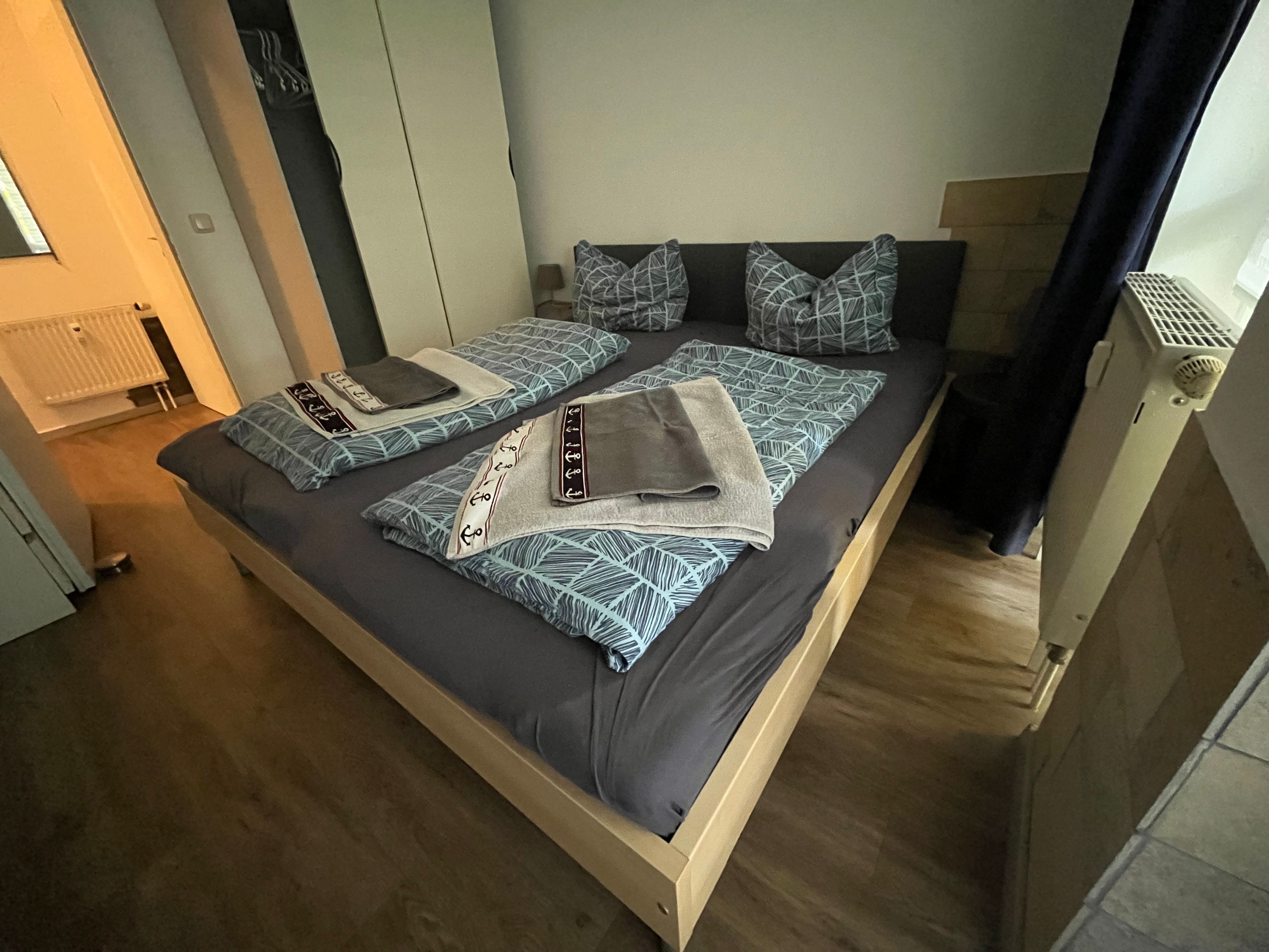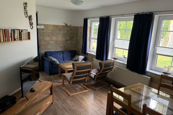 Die Ferienwohnung, welche mit einer individuellen Raumplanung komfortabel ausgestattet ist, verfügt über ein Wohnzimmer mit angrenzender Einbauküche, ein Schlafzimmer mit Doppelbett (180x200cm), ein modernes gefliestes Bad, einen Balkon sowie einen Flur. Das Besondere an dem Apartment ist neben der edlen Natursteingestaltung, dass der Balkon sowohl vom Schlafzimmer, als auch vom Wohnzimmer aus begangen werden kann. Bis zu 3 Personen (aber nur 2 Ew. + max. 1 Kind) haben die Möglichkeit, in dieser Ferienwohnung ihren Urlaub zu verbringen. Eine WLAN Nutzung ist inklusive. Die Wohnung wird regelmäßig renoviert und hebt sich mit der vorzüglichen, freiräumlichen grünen Lage von vielen anderen Wohnungen deutlich ab. Die Nutzung eines beschrankten PKW-Stellplatzes, welcher direkt der Wohnung zugeordnet ist, ist unabhängig von der Mietdauer im Gesamtmietpreis inkludiert. Dieser befindet sich ca. 30m links neben der angrenzenden Villa.