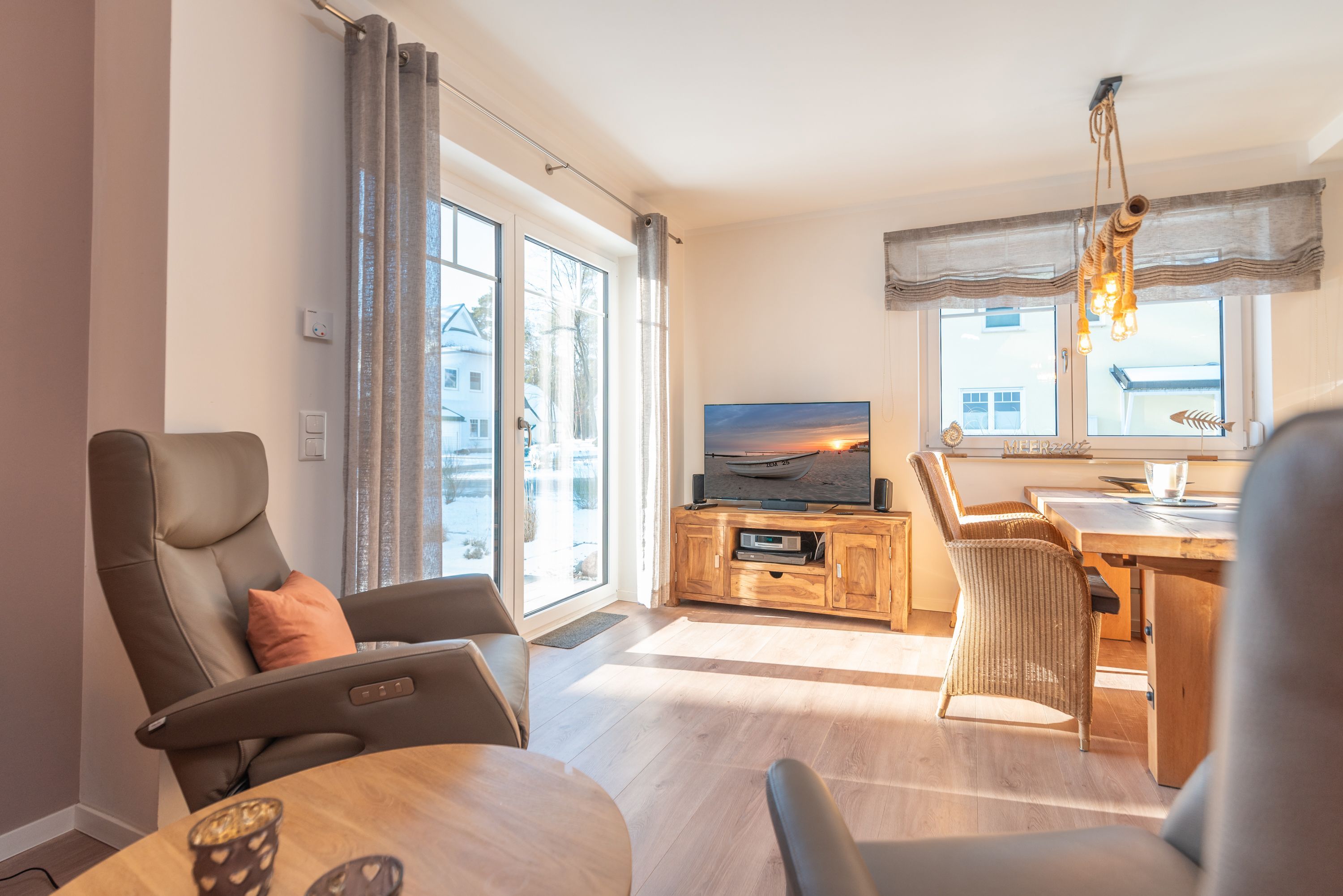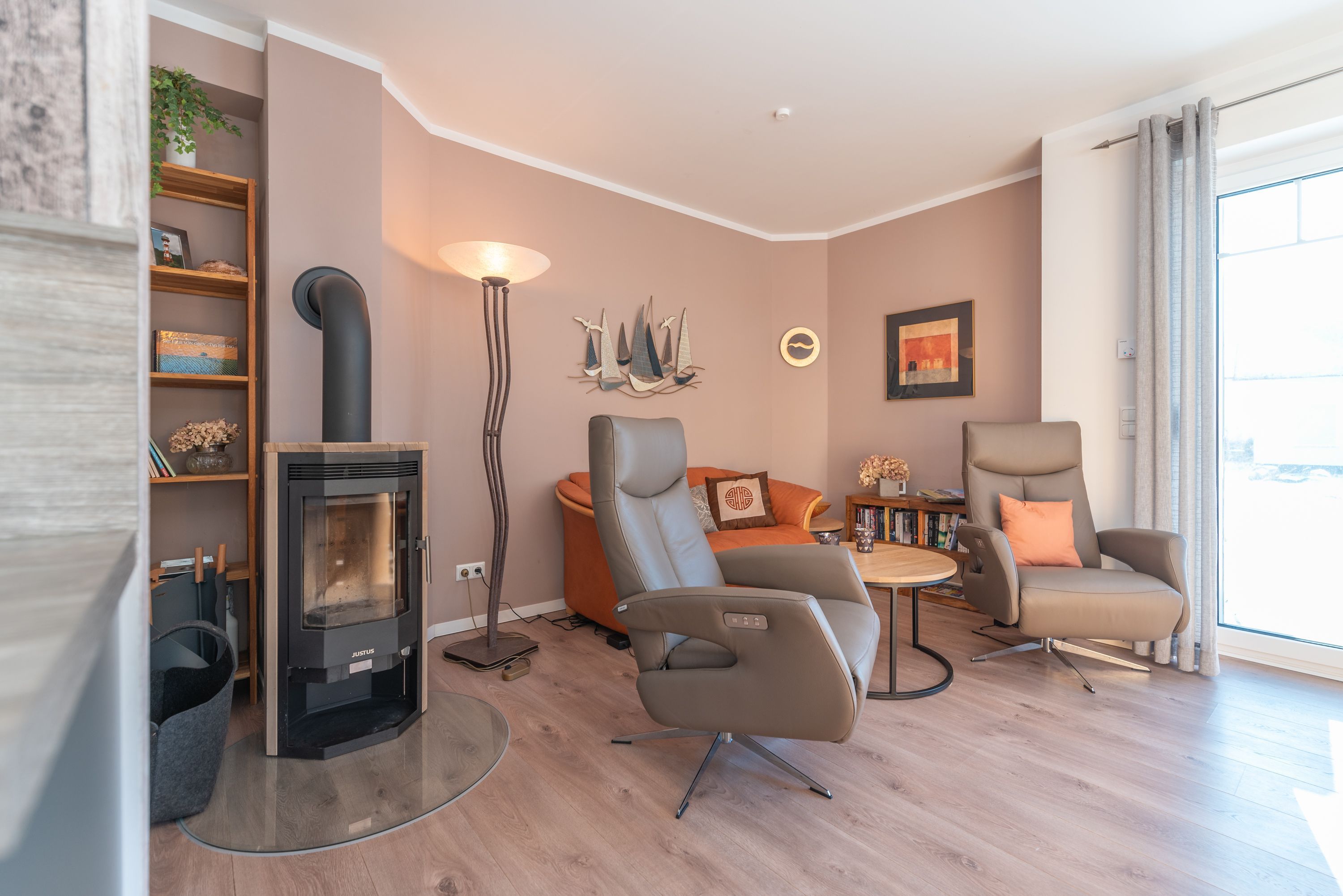 • Wohnbereich mit gemütlicher Couch, Smart-TV, Fernsehsesseln und Kamin