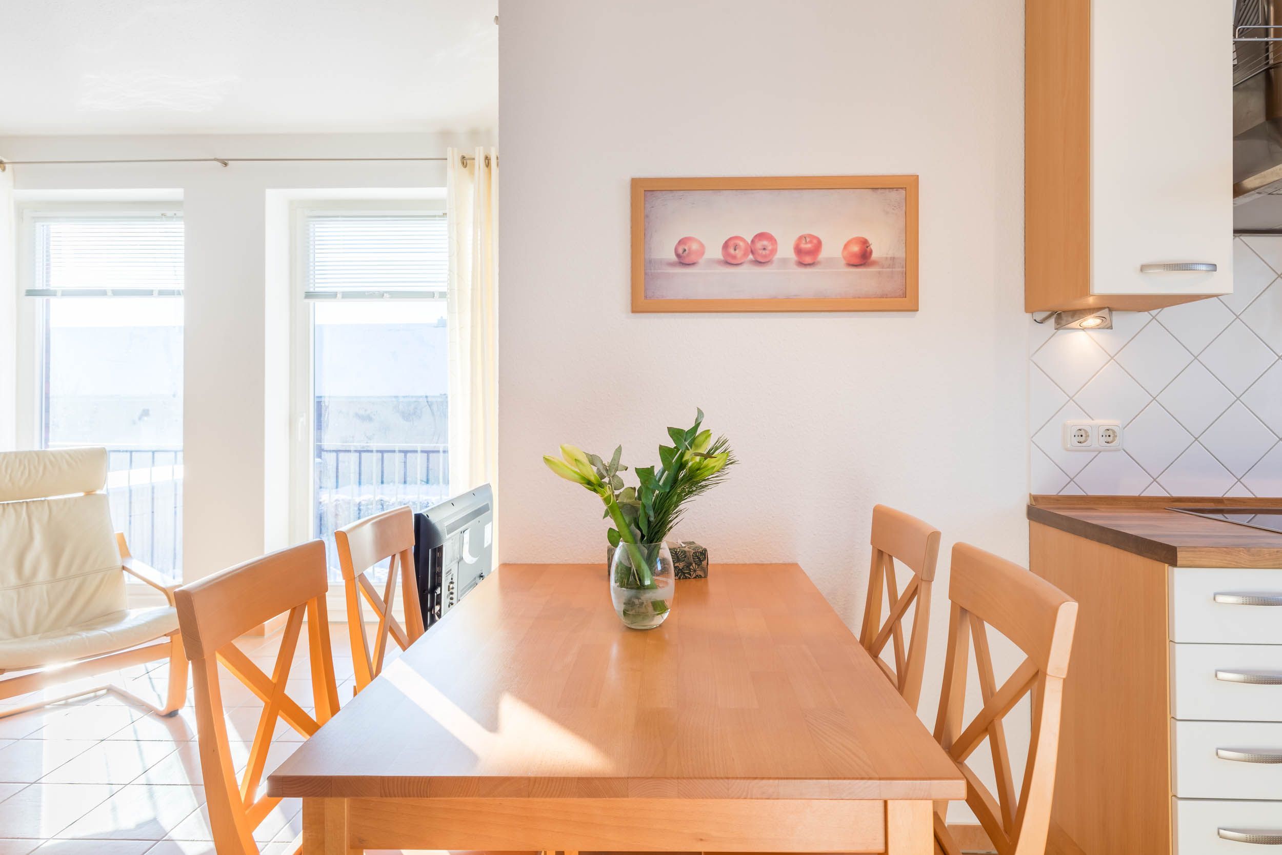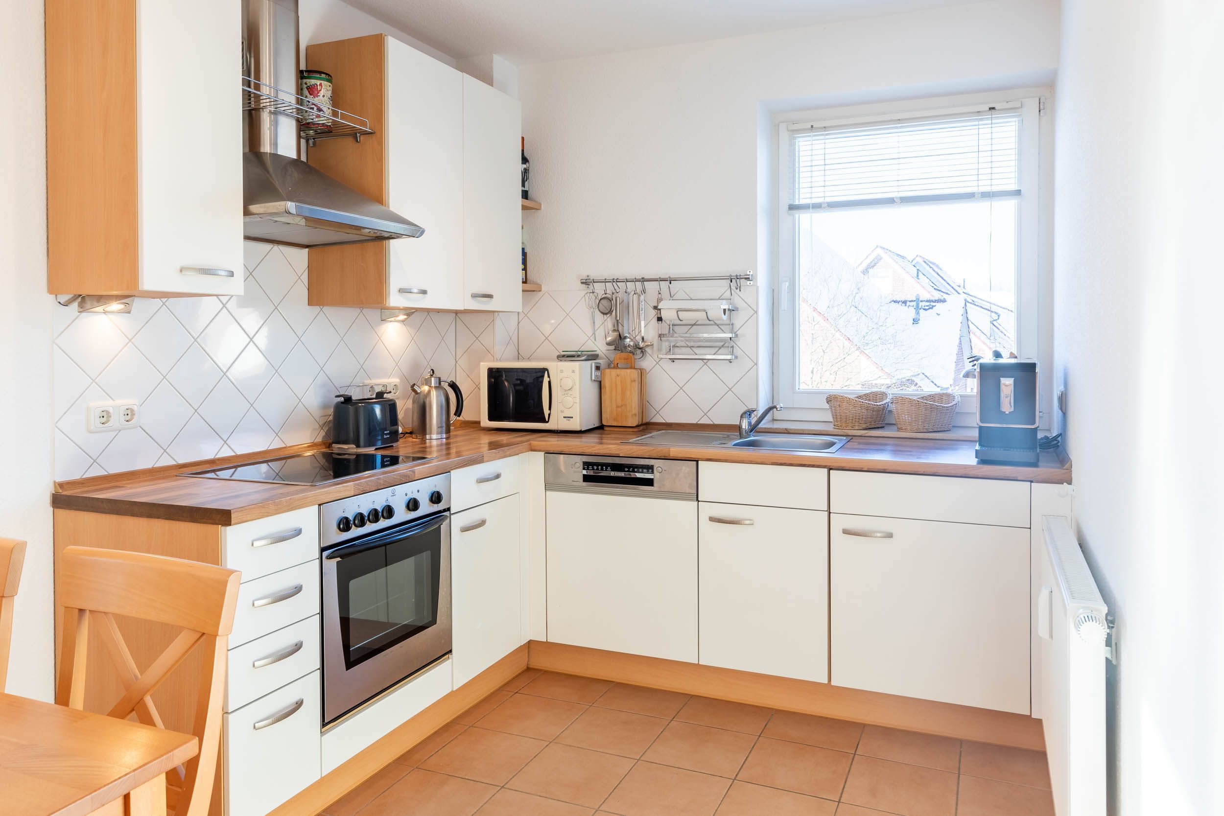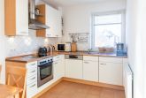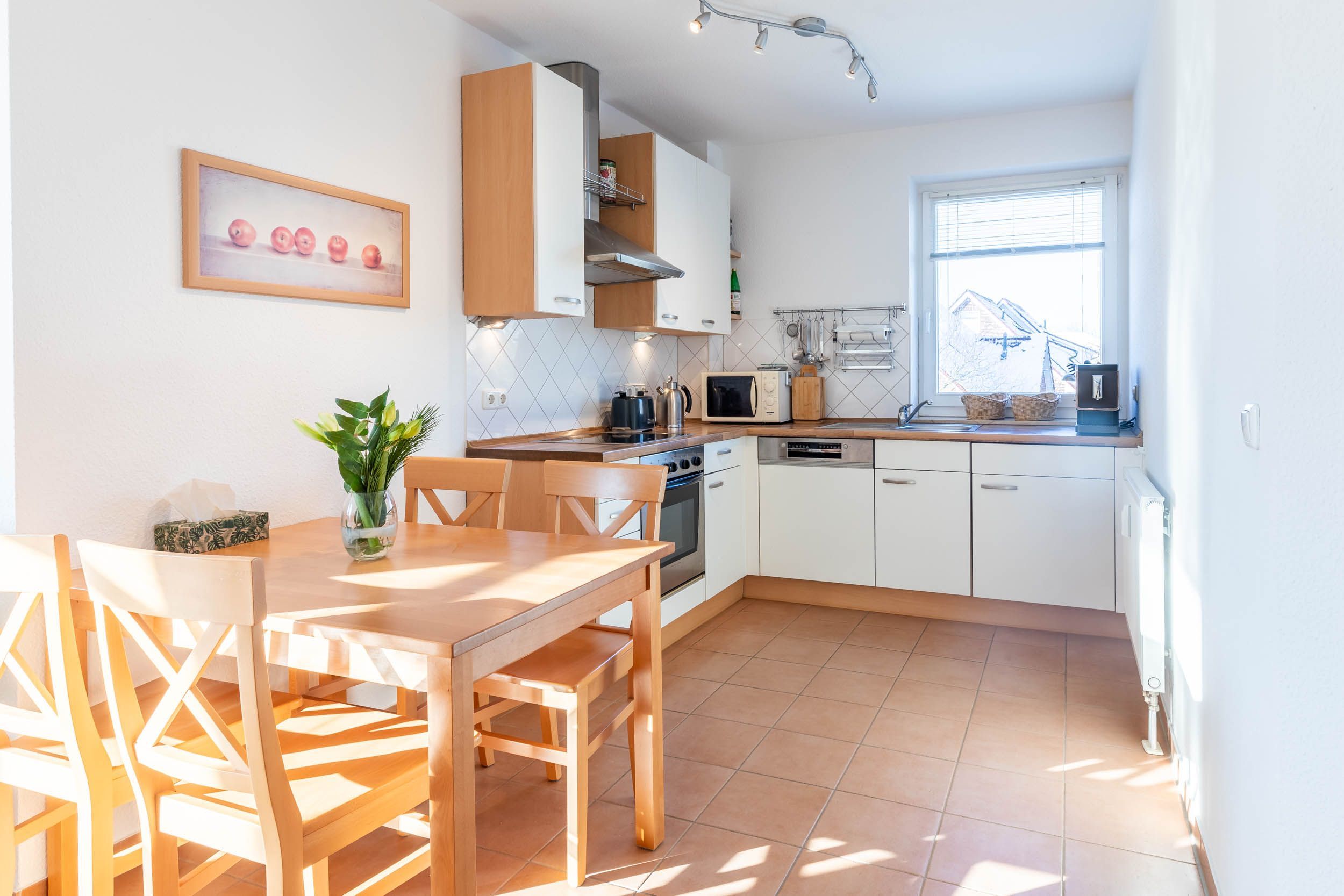 An dem Wohnbereich schließt sich die komfortable offene Küchenzeile an, welche mit sämtlichen typischen Haushaltsgeräten wie z.B. Backofen, Herd mit Cerankochfeld, Kühlschrank mit Gefrierfach, Mikrowelle, Kaffeemaschine usw. ausgestattet ist. An der separaten Essecke können Sie gemeinsam Ihre Mahlzeiten einnehmen.
