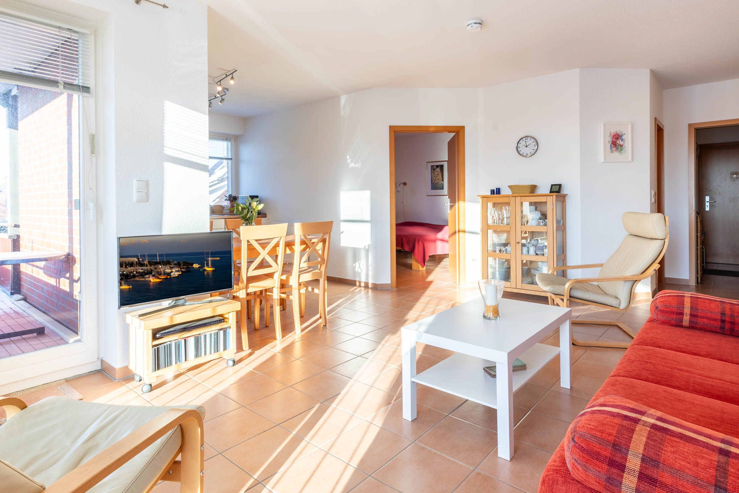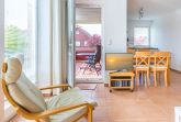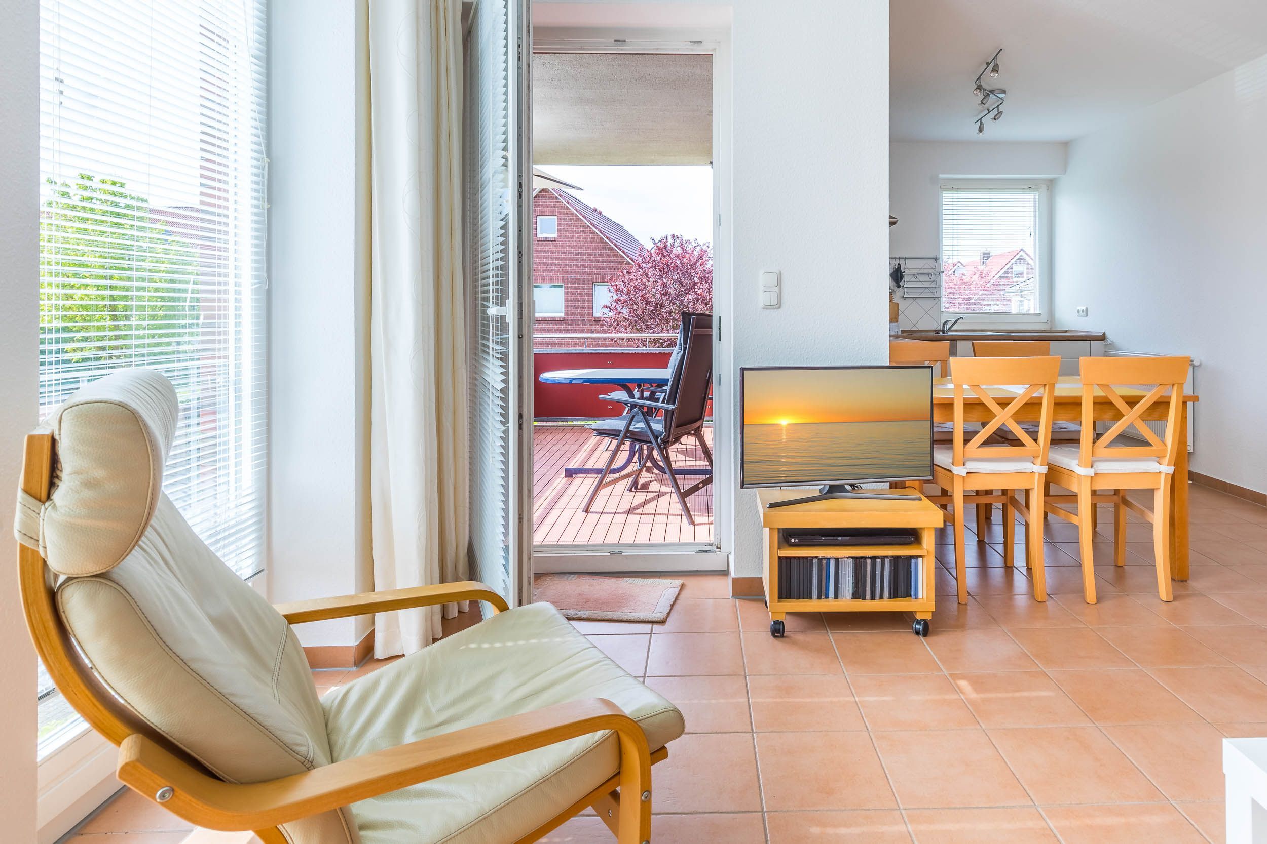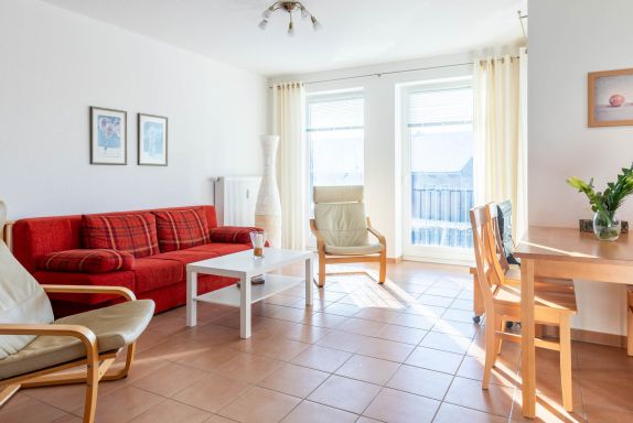 Im hellen Wohnbereich stehen ein bequemes Sofa und zwei gemütliche Sessel zur Verfügung. Ein Flatscreen-TV, DVD-Player sowie eine kleine Musikanlage sorgen für etwas Unterhaltung. Aus dem Wohnbereich gelangen Sie auch auf den möblierten Nordwest-Balkon.
