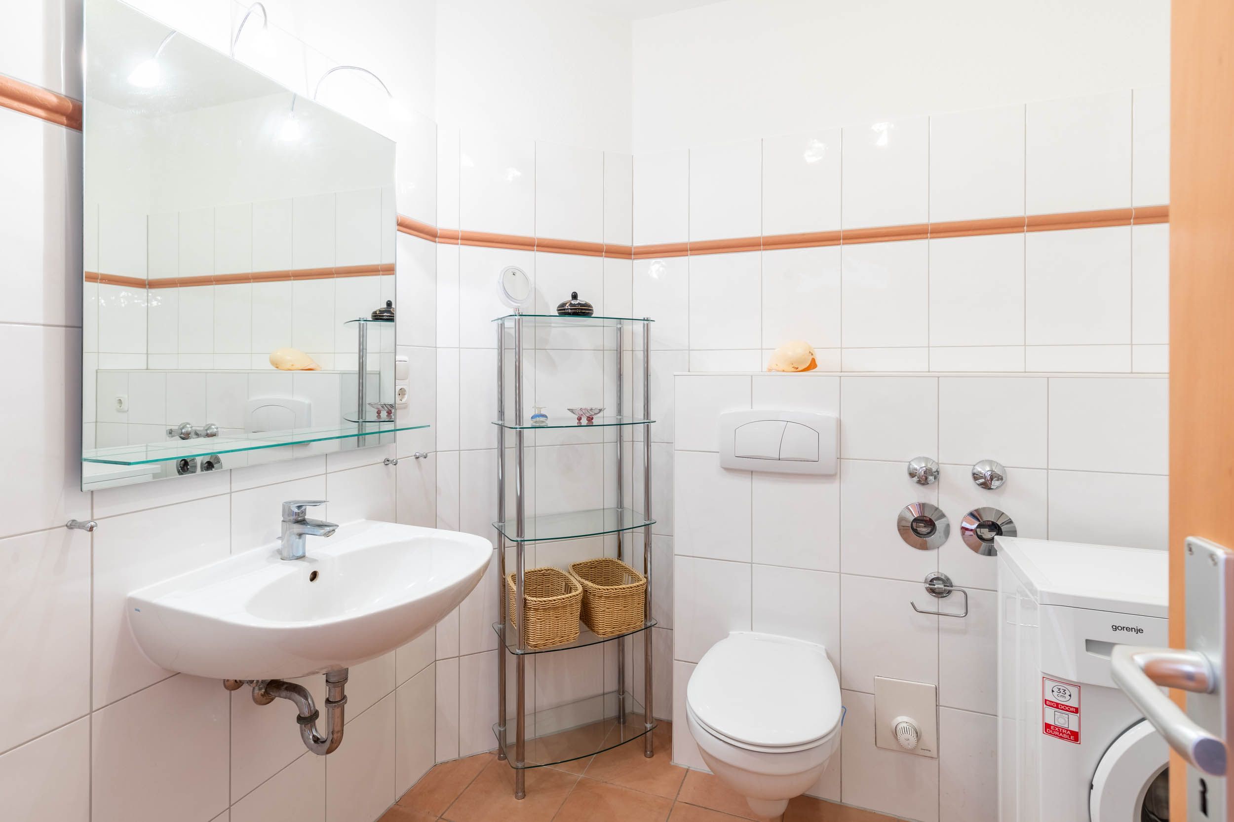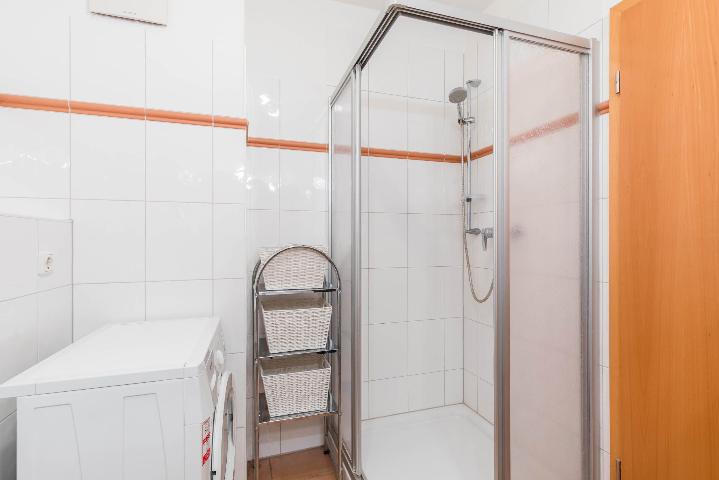 Ein modernes Badezimmer mit Dusche, WC und kostenfreier Waschmaschine komplettiert die schöne Ferienunterkunft.