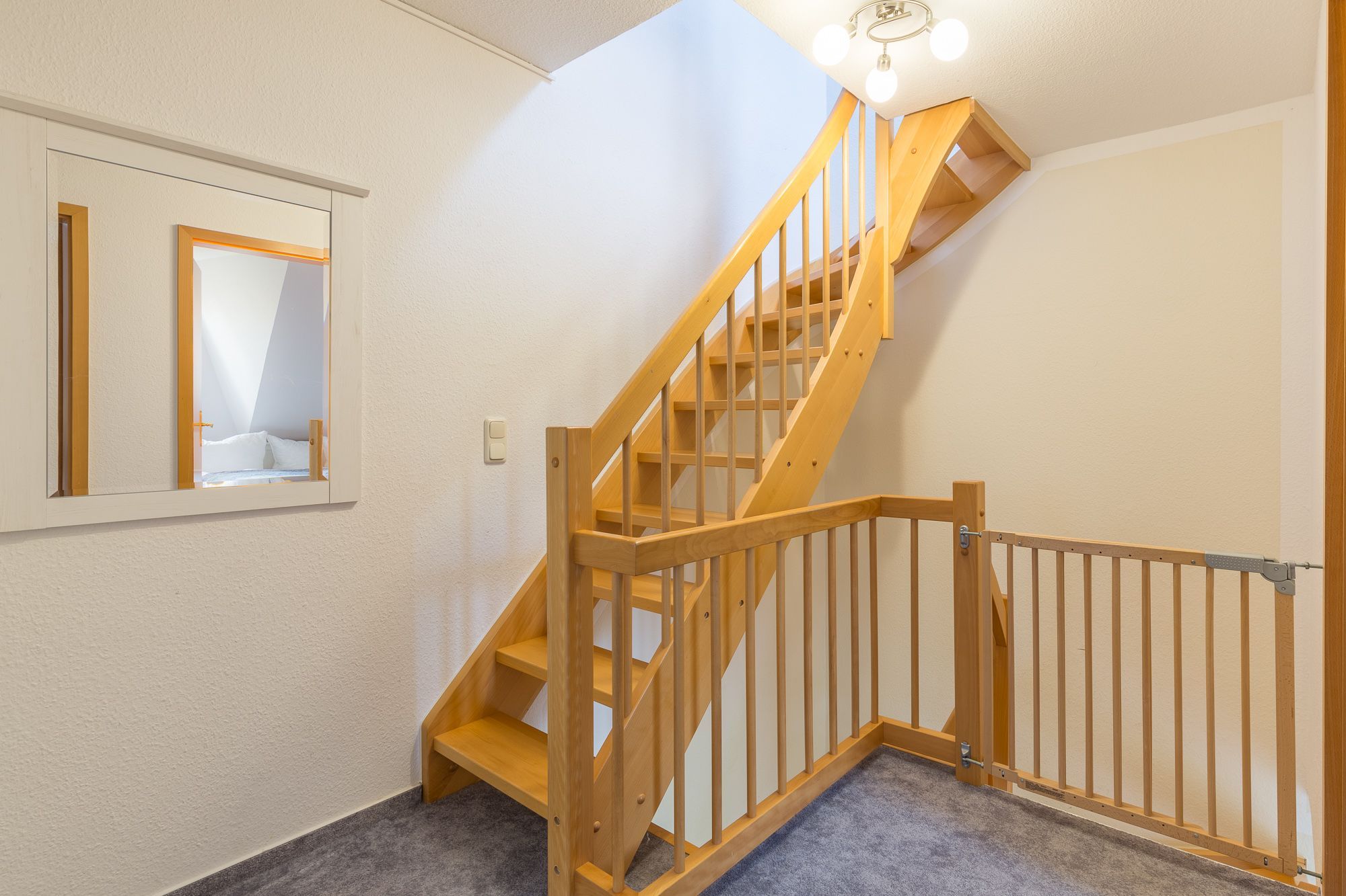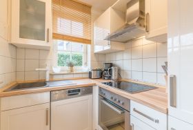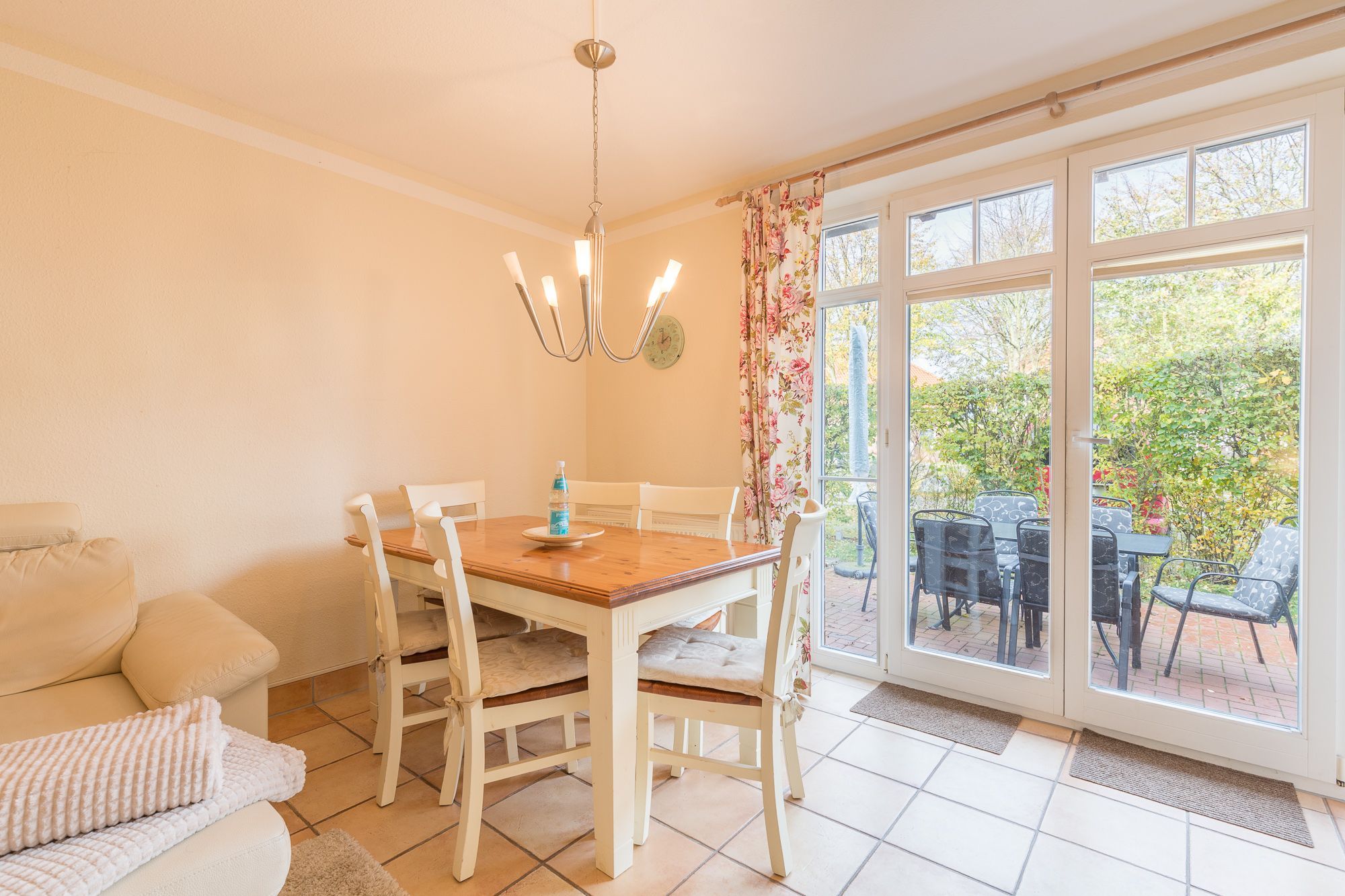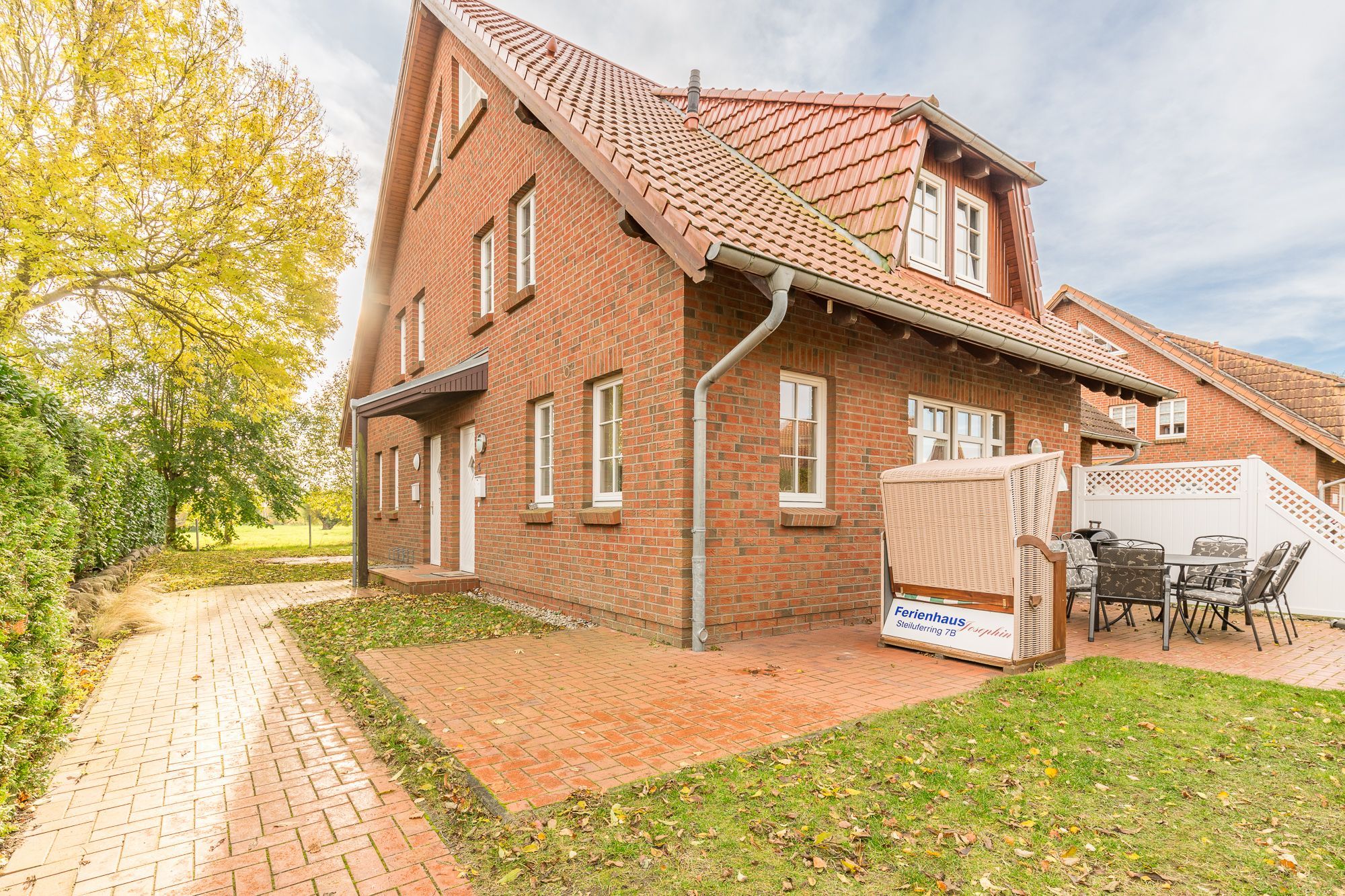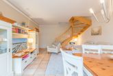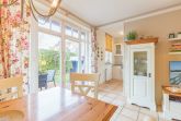 Vom Wohnzimmer aus gelangen Sie auf die begrünte, kleine Terrasse. Die vorhandene Hecke bietet Sichtschutz und Privatsphäre für das Familienfrühstück auf der Terrasse. Auf der andern Seite befindet sich der Außenstellplatz. Ein schöner Strandkorb auf der Terrasse rundet das Angebot ab.