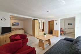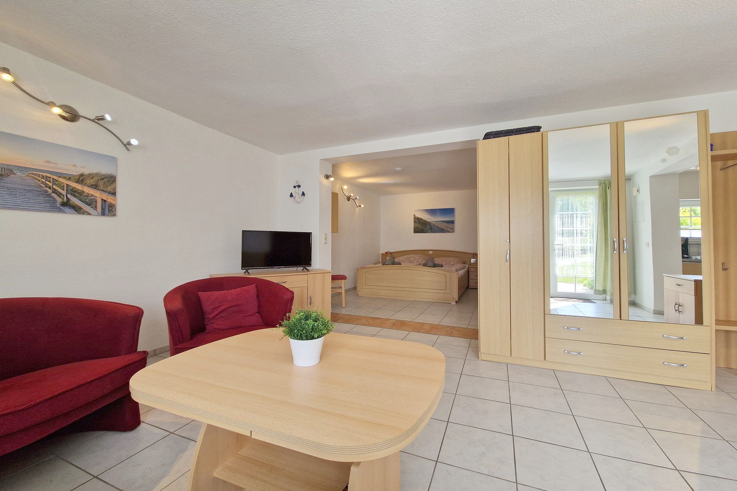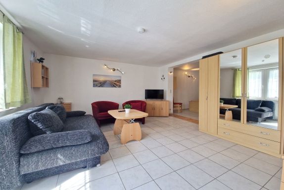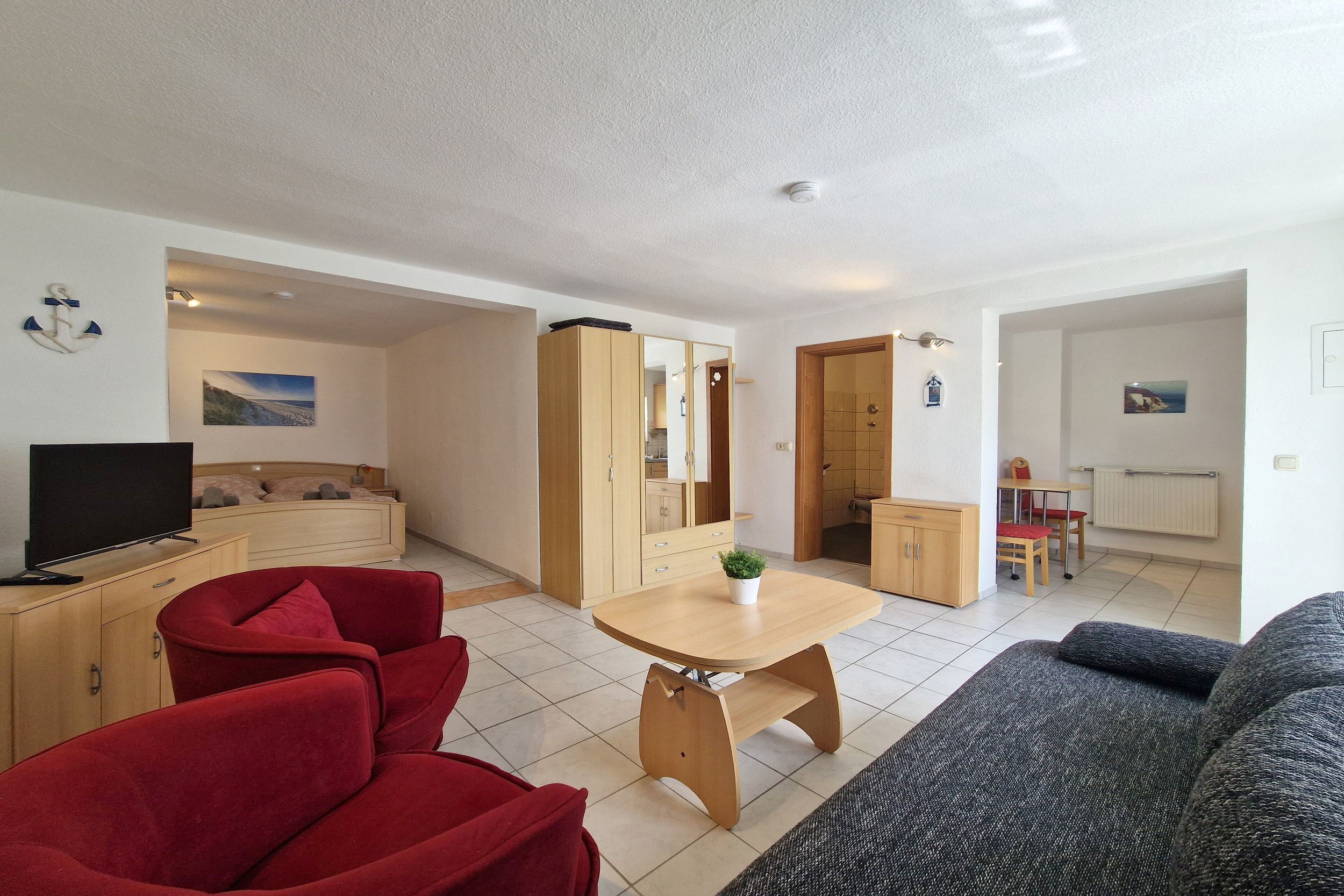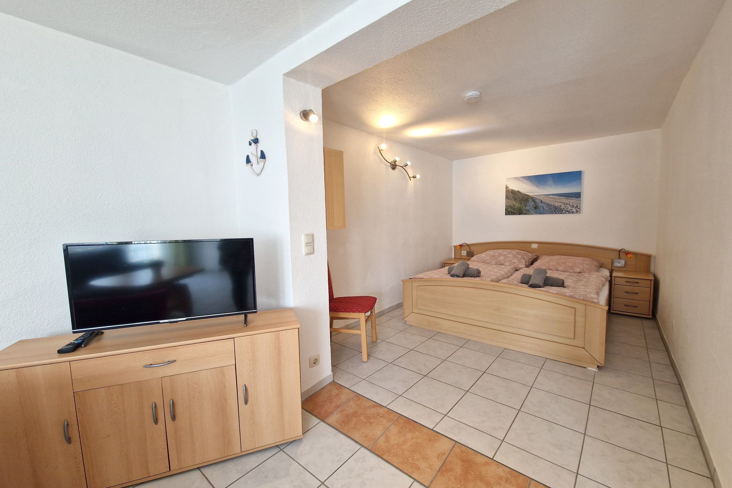 • WOHNEN/SCHLAFEN: Wohnraum mit Doppelbett, Schlafcouch, Flachbild-TV