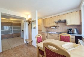 Dieses Apartment verfügt über einen Essbereich, Küchenzeile mit Geschirrspüler, eine Schlafcouch und ein separates Schlafzimmer mit Doppelbett.