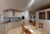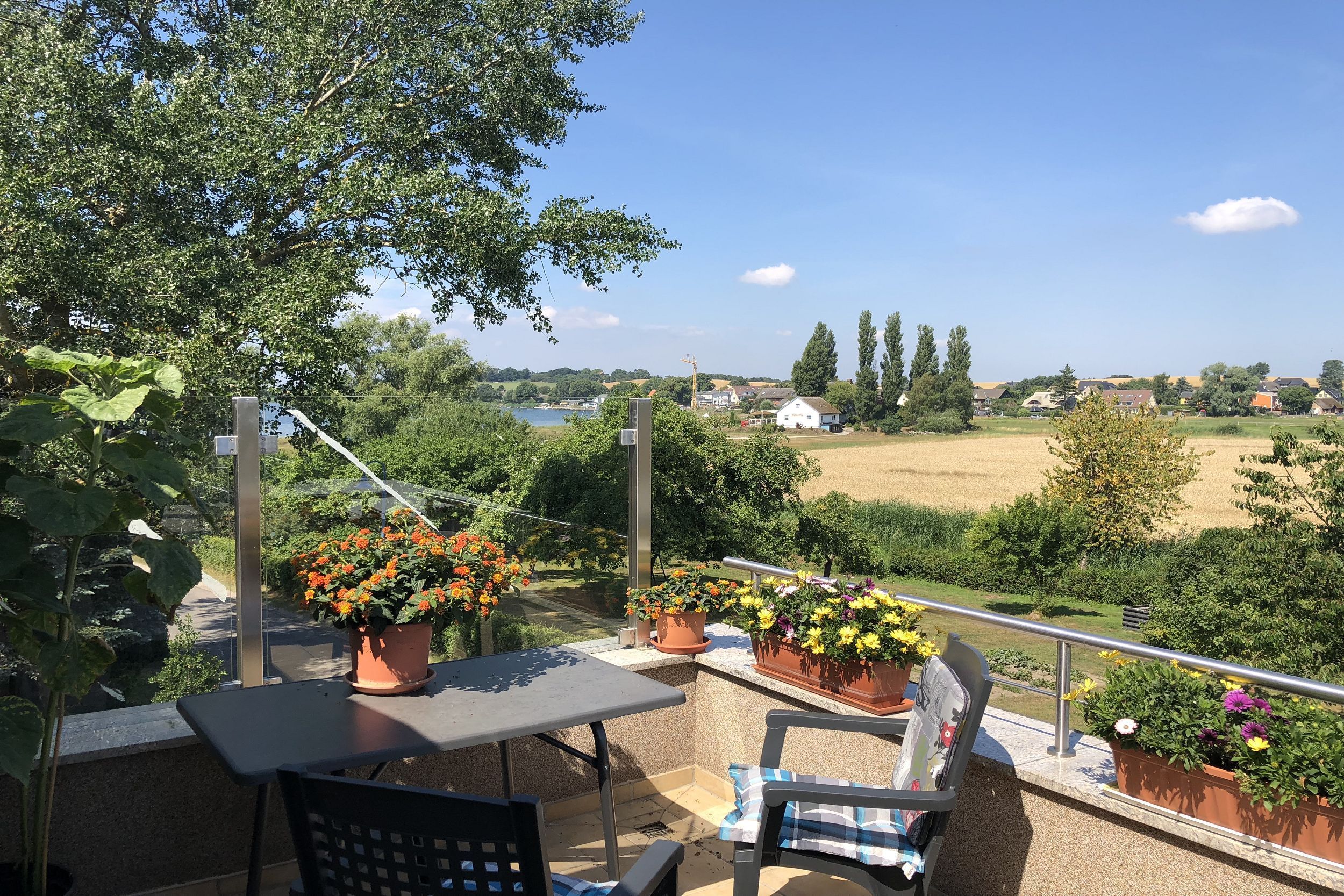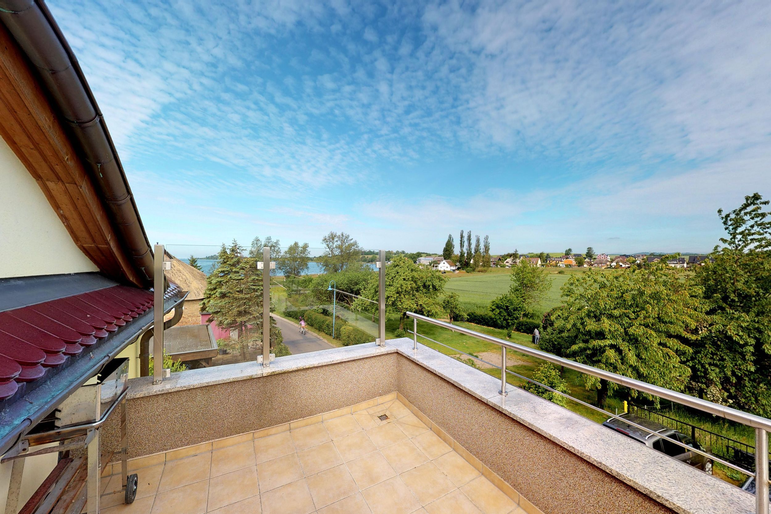 Sie verfügt über 2 Schlafzimmer mit insgesamt 2 Doppelbetten, eine Schlafcouch und einem Doppelstockbett. Jedes Schlafzimmer verfügt über ein eigenes Bad. Somit können in dem 95 Quadratmeter großen Apartment auch 2 Familien ihren Urlaub zusammen verbringen. 1 Bad ist zudem mit einer Wachmaschine ausgestattet. Die Wohnküche ist mit einem Backofen, Geschirrspüler, Kühlschrank, Gefrierschrank und Mikrowelle ausgestattet. Von der Küche aus gelangen Sie auf die große Dachterrasse mit Blick auf den Greifswalder Bodden.
