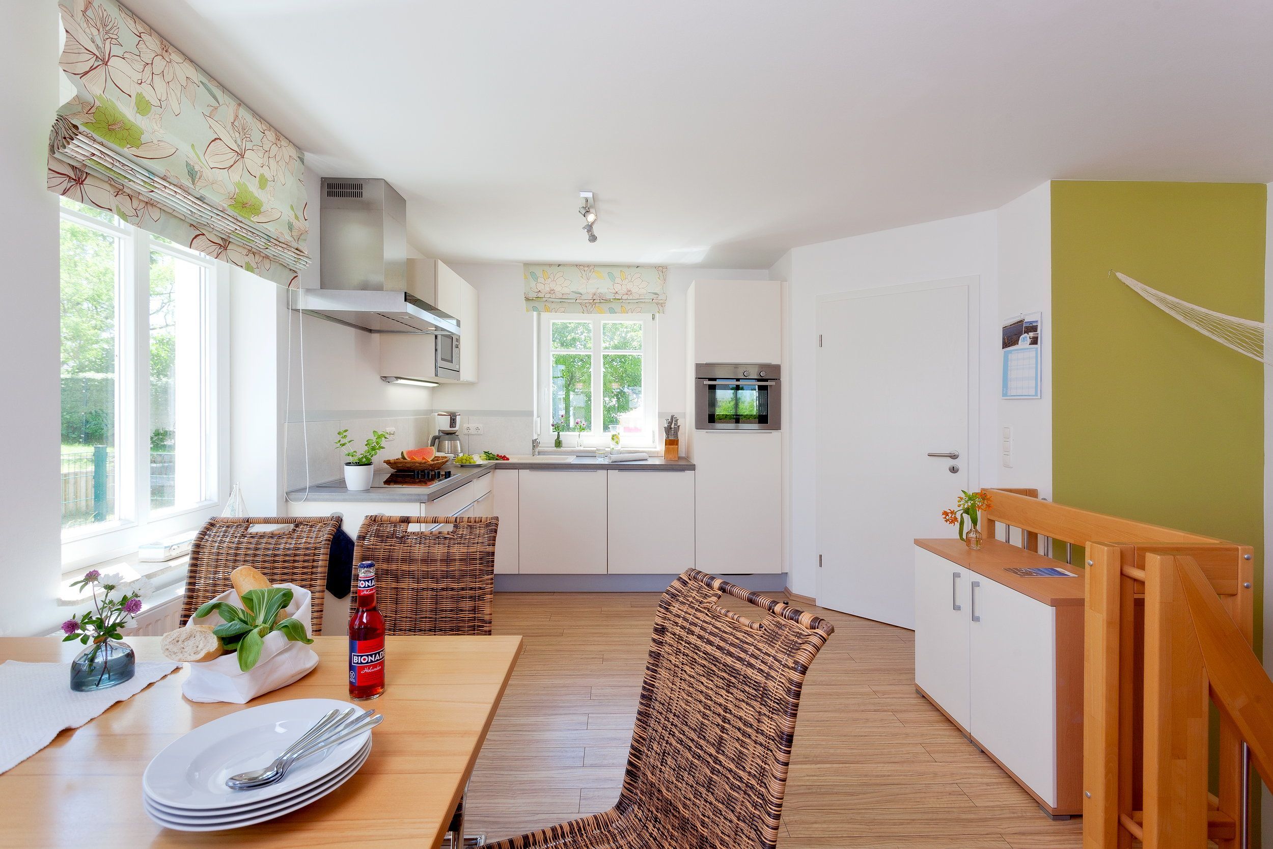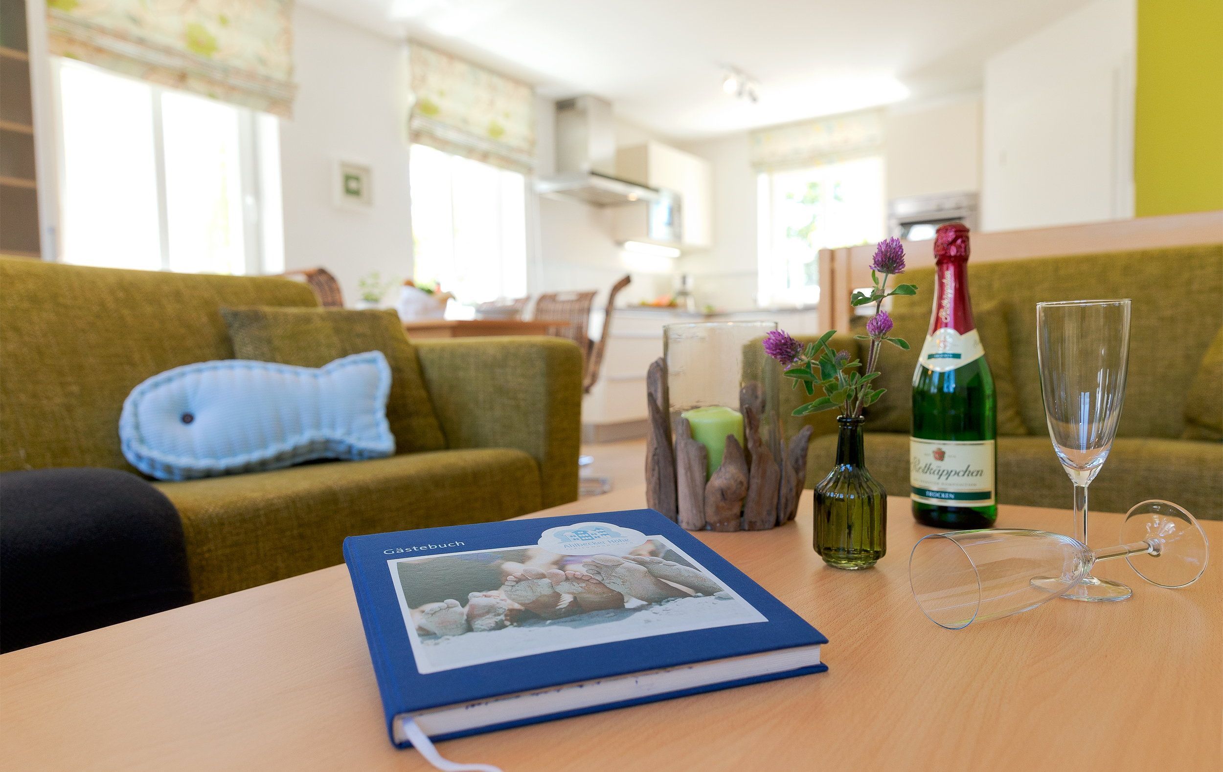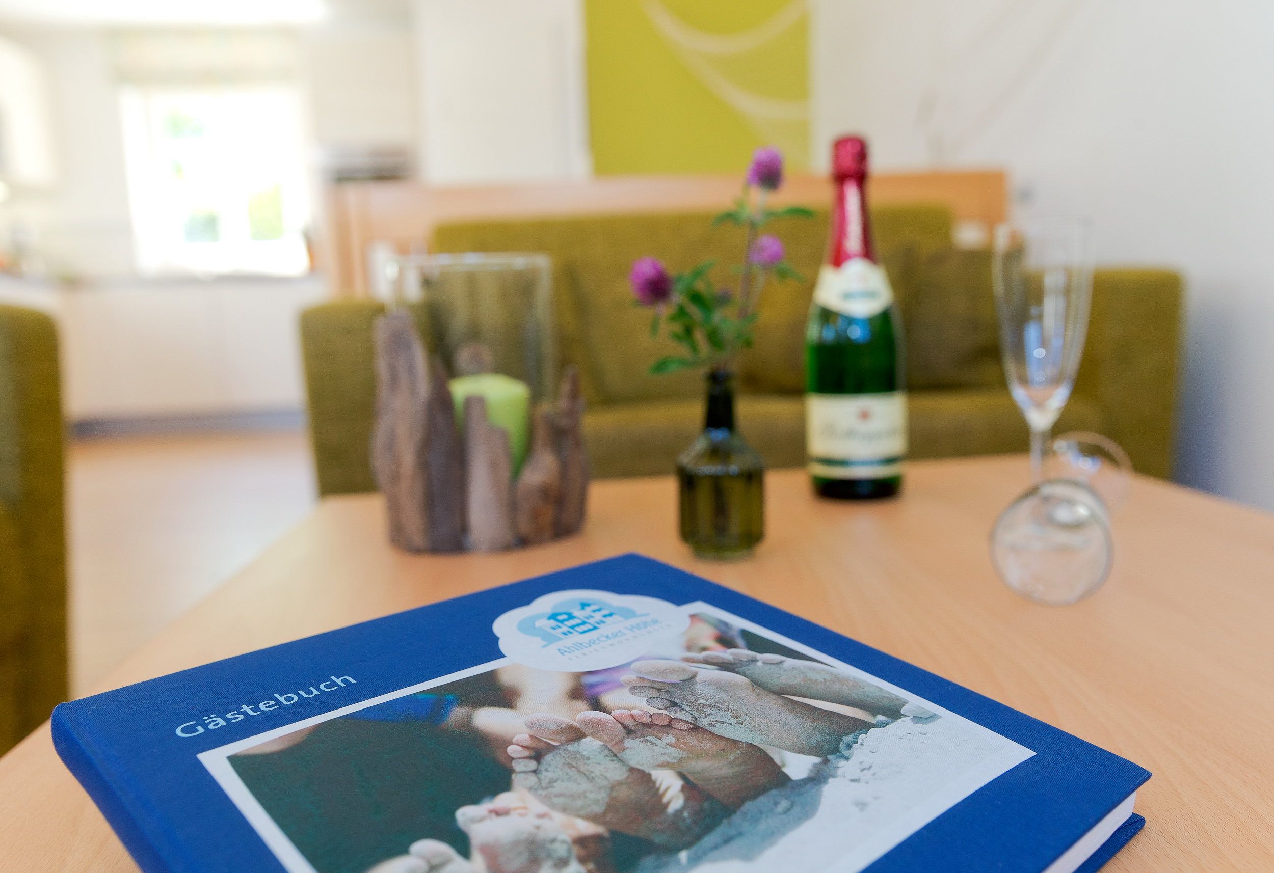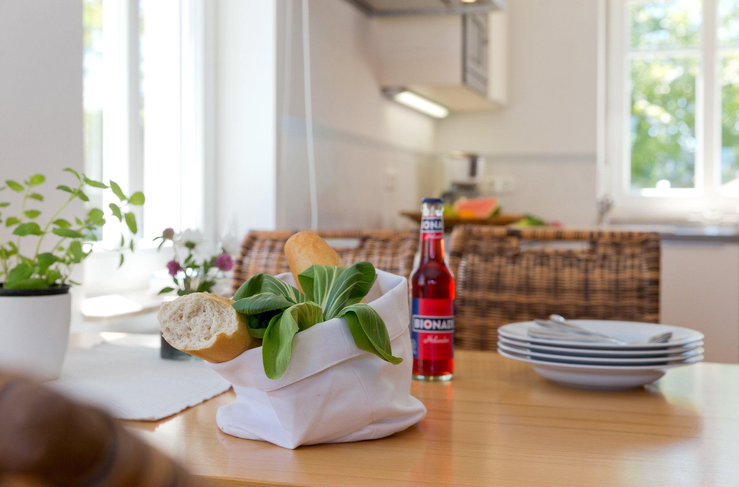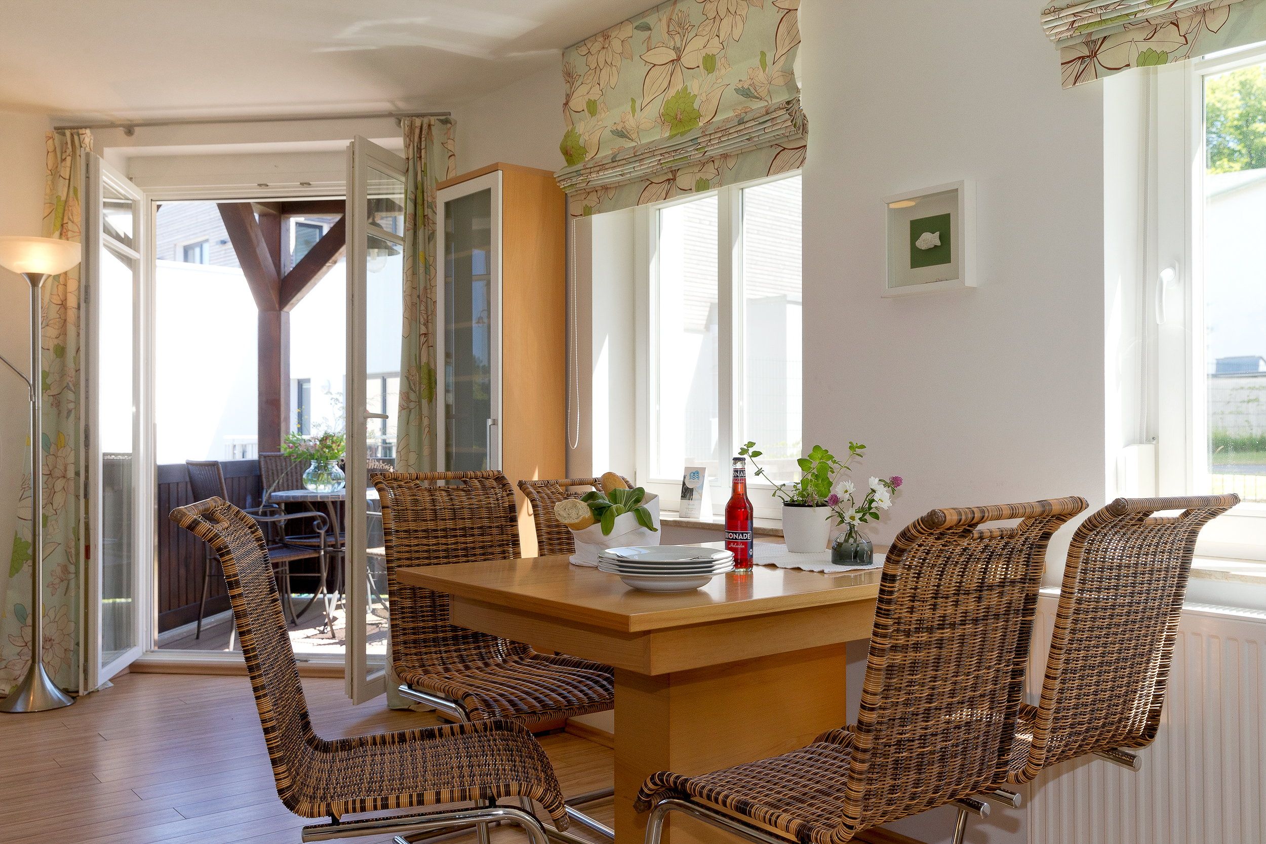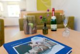 Der Wohnbereich verfügt über eine gemütliche Couch (mit Ausziehfunktion für Aufbettung) mit Leselampe, Flachbild-TV (32 Zoll), CD / DVD-System, iPod-Dockingstation sowie einen Esstisch mit Schwingstühlen. Vom Wohnbereich gelangen Sie auf Ihren Balkon mit Zugang zum Garten. Die im Wohnbereich integrierte komplett ausgestattete Einbauküche verfügt zudem über Kühlschrank, Mikrowelle, Ceran-Kochfeld (4 Platten), Backofen, Spülmaschine, Wasserkocher, Toaster, Kaffeemaschine (4er Filter), Messerblock. Über eine Treppe gelangen Sie vom Erdgeschoss in den Souterrain-Bereich. Dort befinden sich die beiden Schlafzimmer. Das eine Schlafzimmer ist mit einem hochwertigen Boxspringbett (160 x 200 cm) und Leselampe ausgestattet. Die Aufbettung für ein Kind ist im Schlafzimmer im Babyreisebett (max. 3 Jahre) oder auf Faltmatratze (3-10 Jahre) 80 x 200 cm möglich. Im 2. Schlafzimmer befindet sich für unsere kleineren Gäste ein Etagenbett (jeweils 90 x 200 cm).