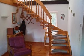 Auf dem umzäunten Grundstück finden Sie einen Pkw-Stellplatz und eine gemütliche Grill- und Sitzecke mit Grillkamin. Das Ferienhaus ist ca. 120m² groß und bietet Platz für bis zu 5 Personen. In der unteren Etage befindet sich das große Esszimmer mit Kaminofen, Wohnzimmer und Küche sowie ein Badezimmer mit bodengleicher Dusche. In der oberen Etage befinden sich zwei Schlafzimmer und ein kleines Kinderschlafzimmer, sowie ein WC. Das ganze Ferienhaus ist mit einem Holzfußboden ausgestattet. W-LAN steht Ihnen kostenfrei zur Verfügung.