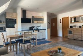 - Wohnbereich (Couch ohne Schlaffunktion), integrierte Küche und Essplatz
