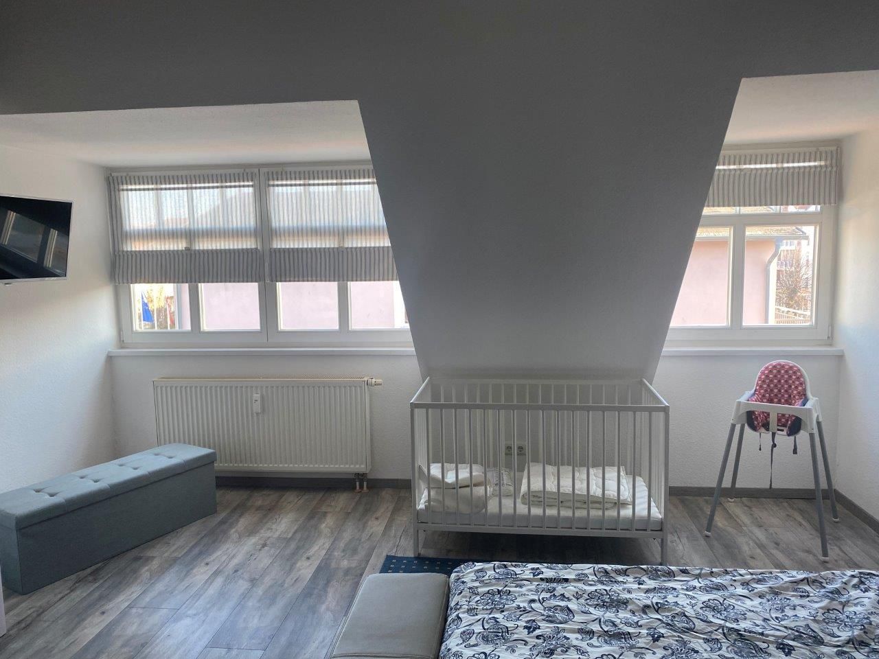 - 1. Schlafzimmer mit Doppelbett (getrennte Matratzen), Kleiderschrank und festem Kinderbett, TV
