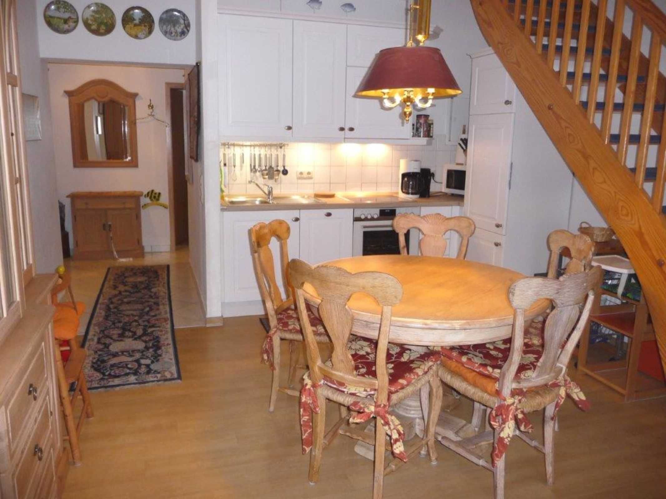 - Wohnbereich (1. Etage) mit integrierter Küche, Essplatz, TV und DVD-Player