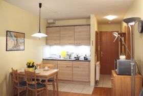 - Wohn/Schlafbereich mit Schlafcouch, integrierter Küche und Essplatz