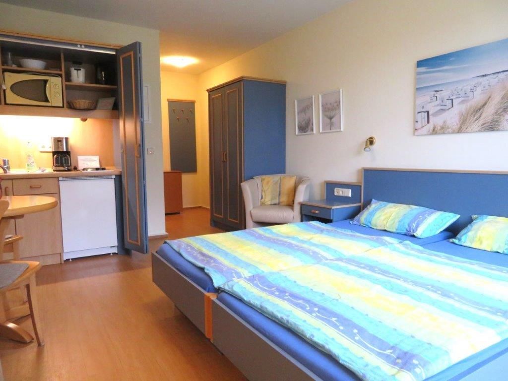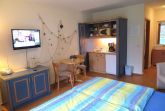 - Wohn/Schlafbereich mit Doppelbett, Kleiderschrank, Pantry-Küche und Essplatz