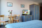 - Wohn/Schlafbereich mit Doppelbett, Kleiderschrank, Pantryküche und Essplatz