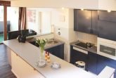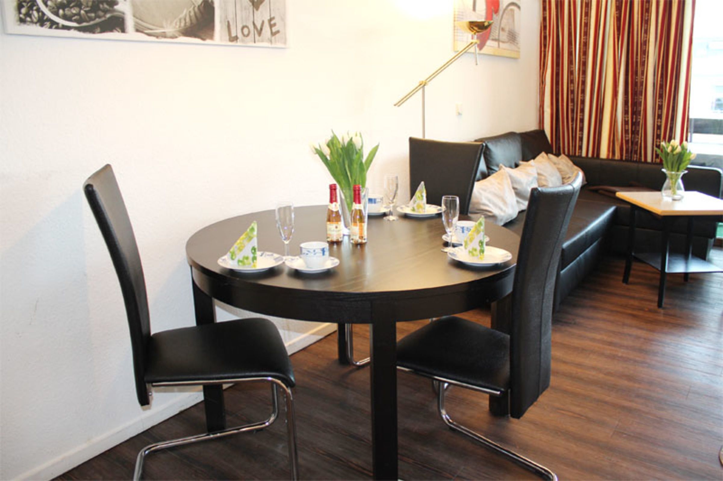 - Wohn/Schlafbereich mit Schlafcouch, integrierter Küche und Essplatz