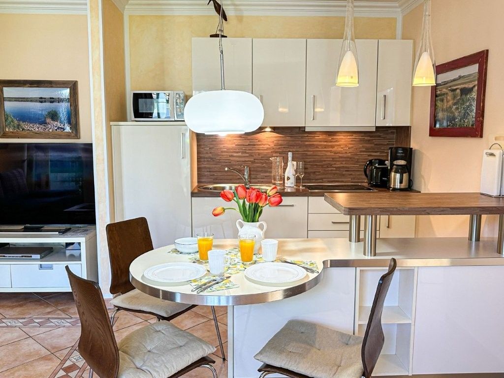 - Wohn/Schlafbereich mit Doppelschlafcouch, integrierter Küche und Essplatz
