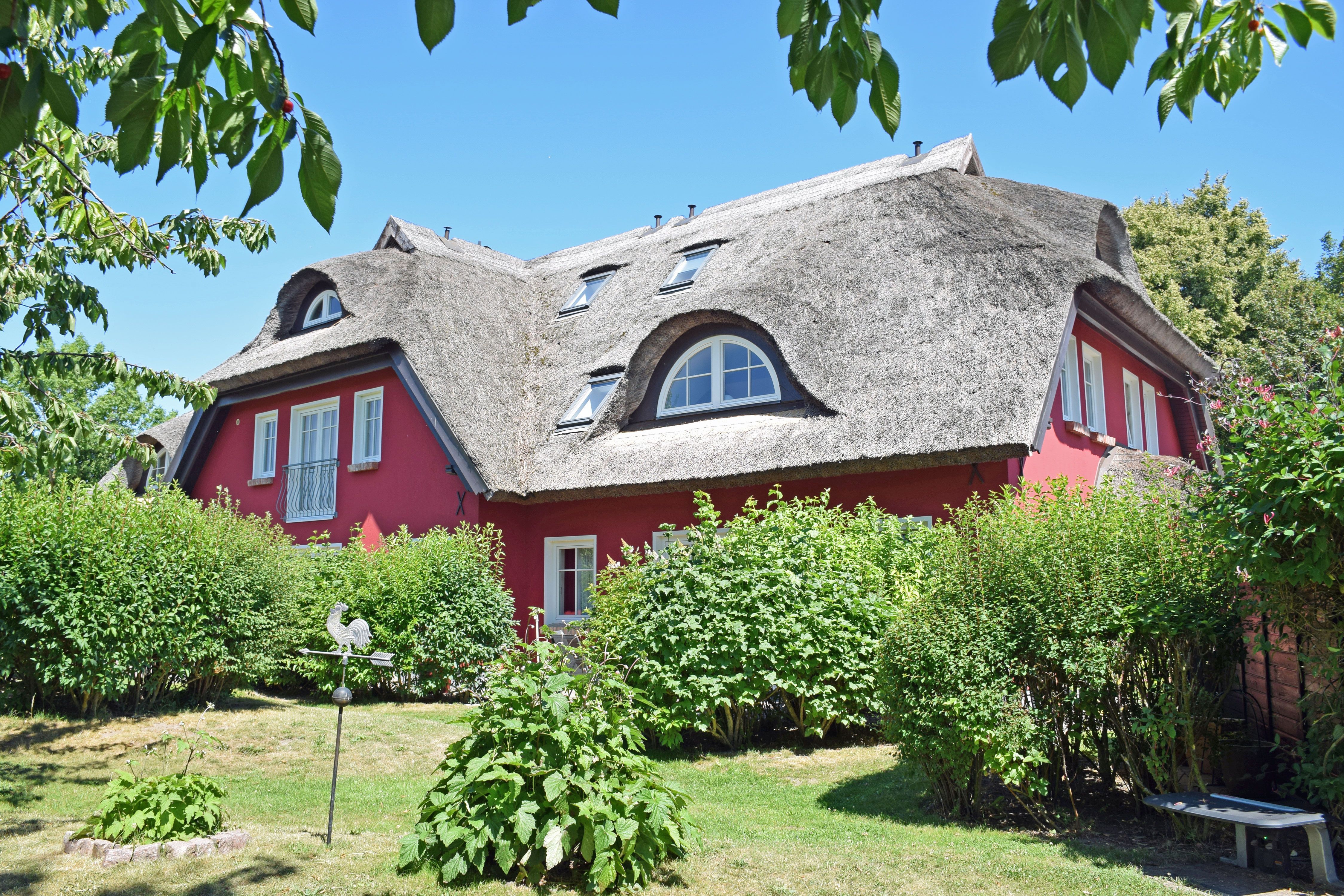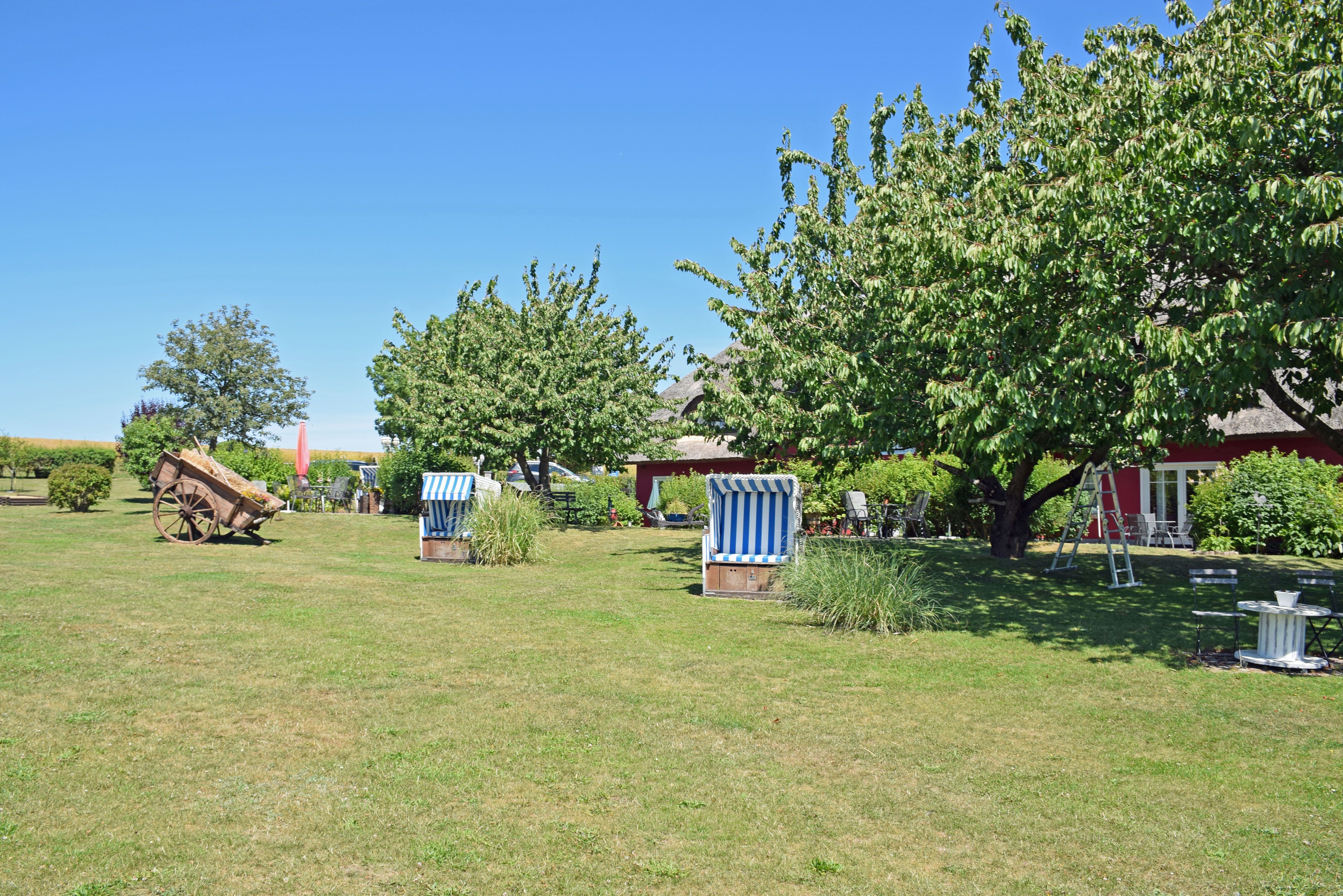 Das gesamte großflächige Grundstück steht dem Urlauber zur Verfügung und wurde von uns bis ins Detail liebevoll gestaltet. Auch für Familien mit Kindern gibt es viele Angebote: Piratenboot, Wippe, Tischtennisplatte, Fußball und vieles mehr. Die Appartements im Untergeschoß verfügen über eine eigene Terrasse mit Tisch und Stühlen, zu der man durch die Verandatür gelangt. Für die Gäste aus dem oberen Stockwerk sind ausreichend gemütliche Sitzecken im Garten eingerichtet. Ist man einmal strandmüde, stehen hier auf dem Rasen eigene Strandkörbe für das Sonnenbad am Landhus zur Verfügung. Hier können Sie in einer ruhigen Ecke des Grundstücks, mit Blick auf den Bodden und die Hügelkette des Großen Zicker, gut entspannen.
