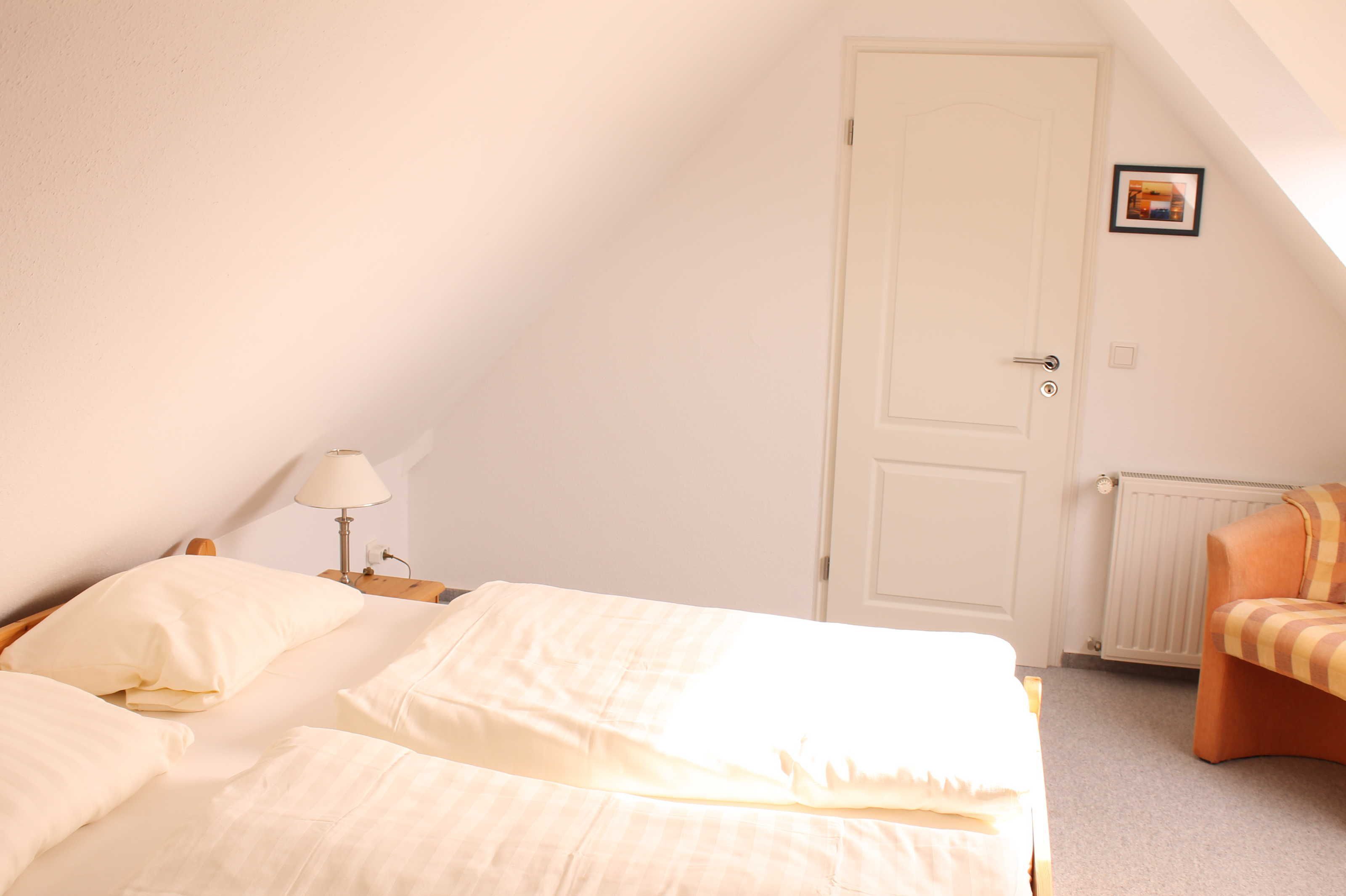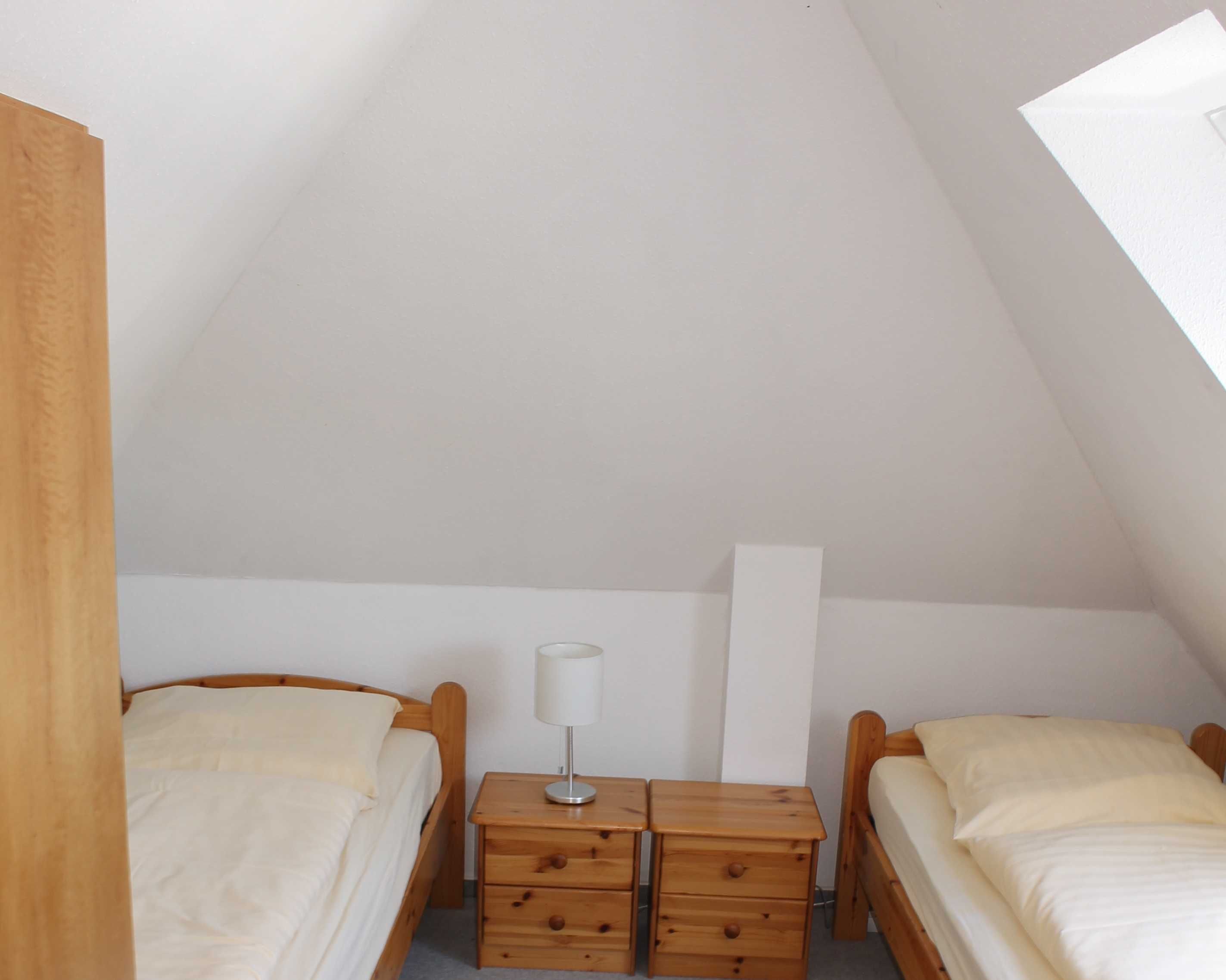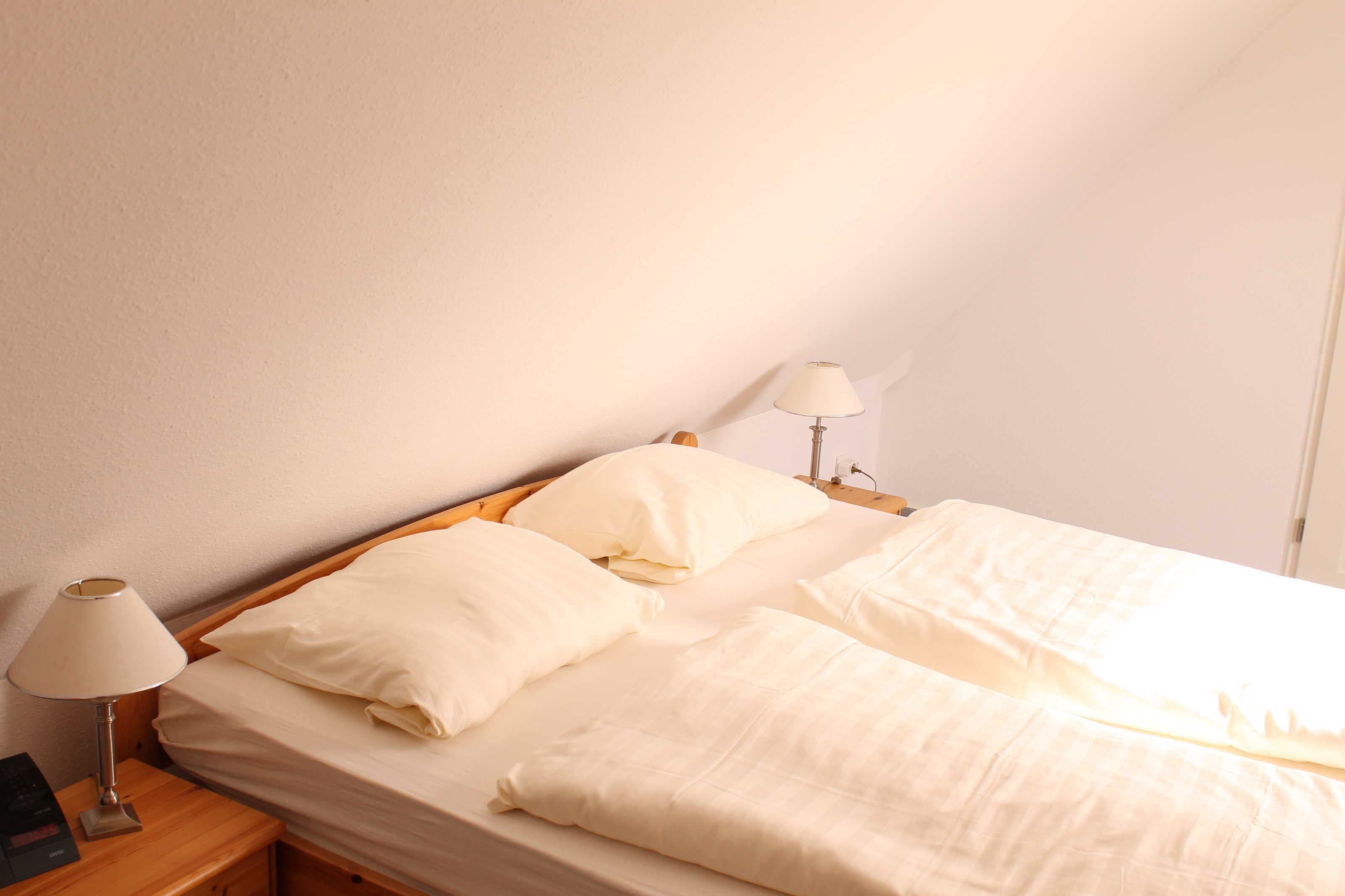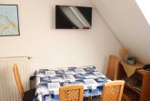 Sie wohnen in einer 45 qm großen 3-Raum Komfort-Dachgeschoß-Wohnung für 4 Personen. Der helle Wohnbereich hat eine komfortable Wohnlandschaft mit Essbereich. Die angrenzende, offene Küchenzeile ist ausgestattet mit einen 2 Platten Kochfeld, Kühlschrank, Spülmaschine und Kaffeemaschine. Über eine Raumspartreppe (steile, gewendelte Treppe, nicht geeignet für Ältere & Kleinkinder) erreichen Sie die beiden Schlafräume. Ein Schlafraum verfügt über ein Doppelbett mit Kleiderschrank, das andere Schlafzimmer hat 2 Einzelbetten und einen Kleiderschrank. Das Bad verfügt über eine Dusche, Waschbecken und WC. Die Dachgeschosswohnung ist mit Direktwahltelefon, WLAN und LED TV ausgestattet. Auf dem Grundstück steht den Gästen eine Terrasse zur Verfügung. Die Erstausstattung Bettwäsche und Handtücher ist bereits inklusive.
